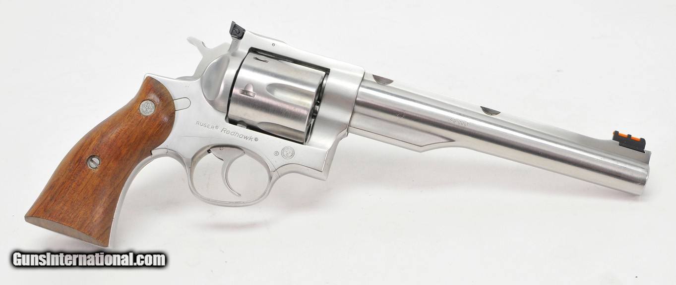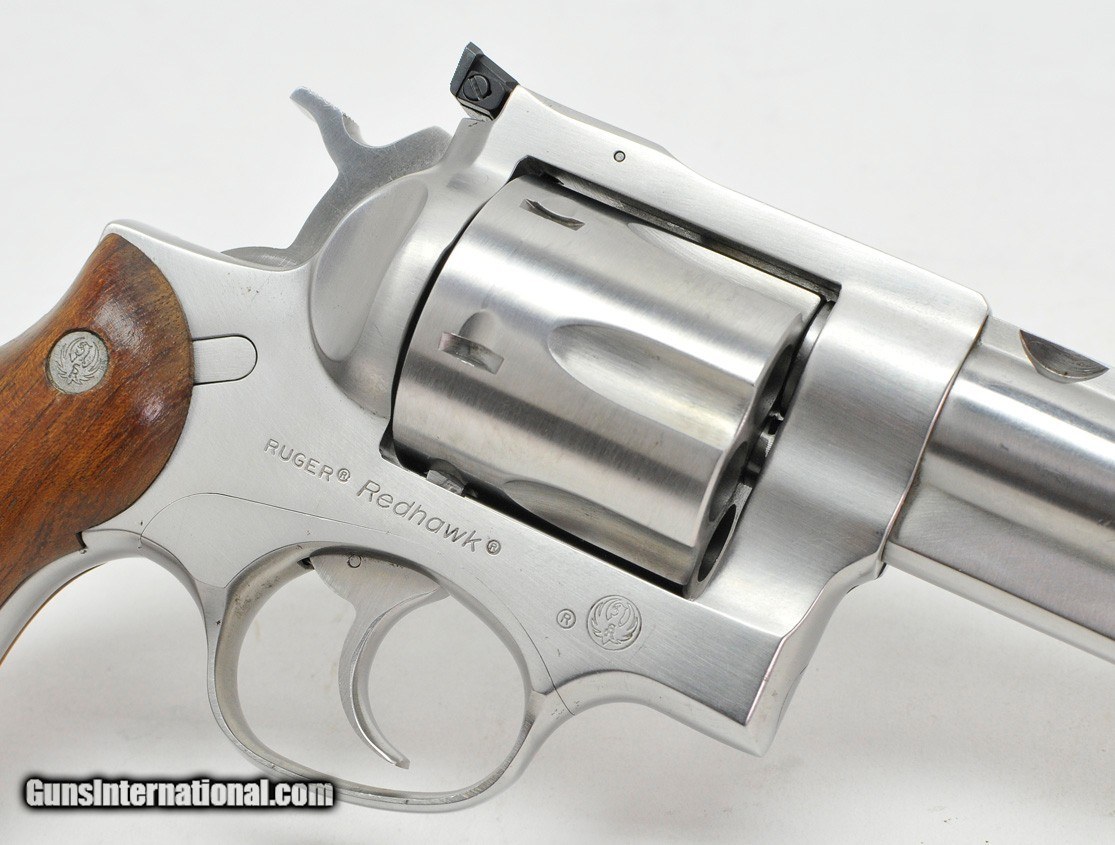 Description: Ruger Redhawk 45 Long Colt. Stainless Steel. Excellent Condition AVAILABLE FOR PURCHASE AT OUR ON-LINE STORE The Ruger Redhawk is a DA/SA, large-frame revolver that was first introduced in 1979 by Sturm, Ruger & Company. Made from high-grade steel, it is available in a stainless steel finish. The Redhawk is reinforced to handle extra stress, making it very popular for use by handloaders as it is able to handle the most powerful .45 Colt and .44 Magnum loads easily. In addition, the cylinder itself is longer than most competitors', allowing ammunition to be loaded to a longer overall length. This allows for either increased powder capacity, heavier (and therefore longer) bullets without compromising the powder load, or a combination of both. Custom ammunition manufacturers even have loads made specifically for Ruger revolvers that cannot fit in shorter chambers or revolvers of weaker construction (such as the Smith & Wesson Model 29). This makes the Redhawk popular as a bear defense gun among hunters and trappers. SPECIFICATIONS
