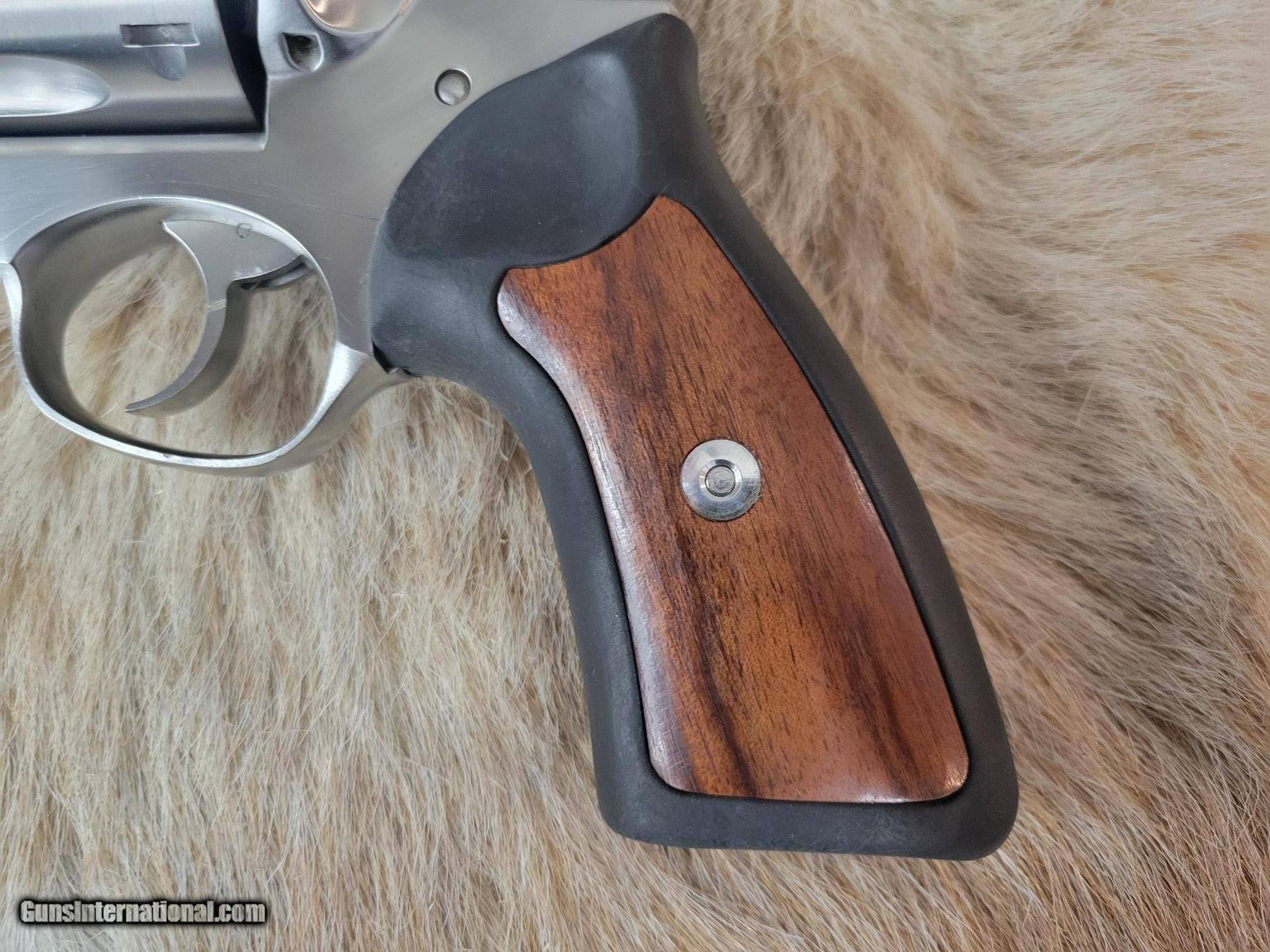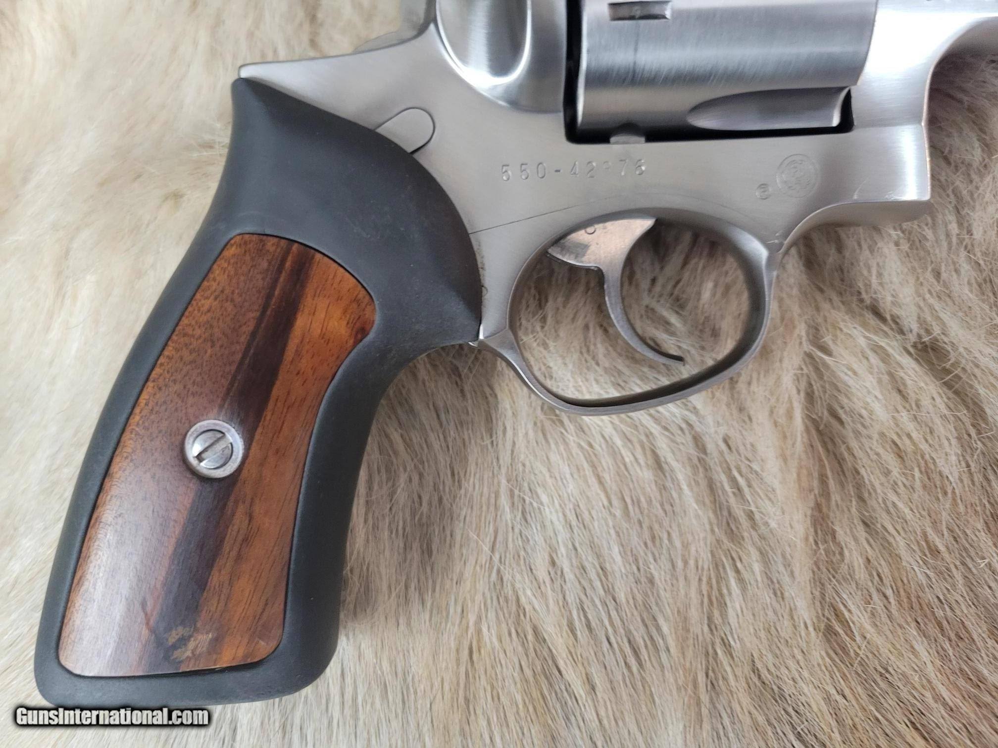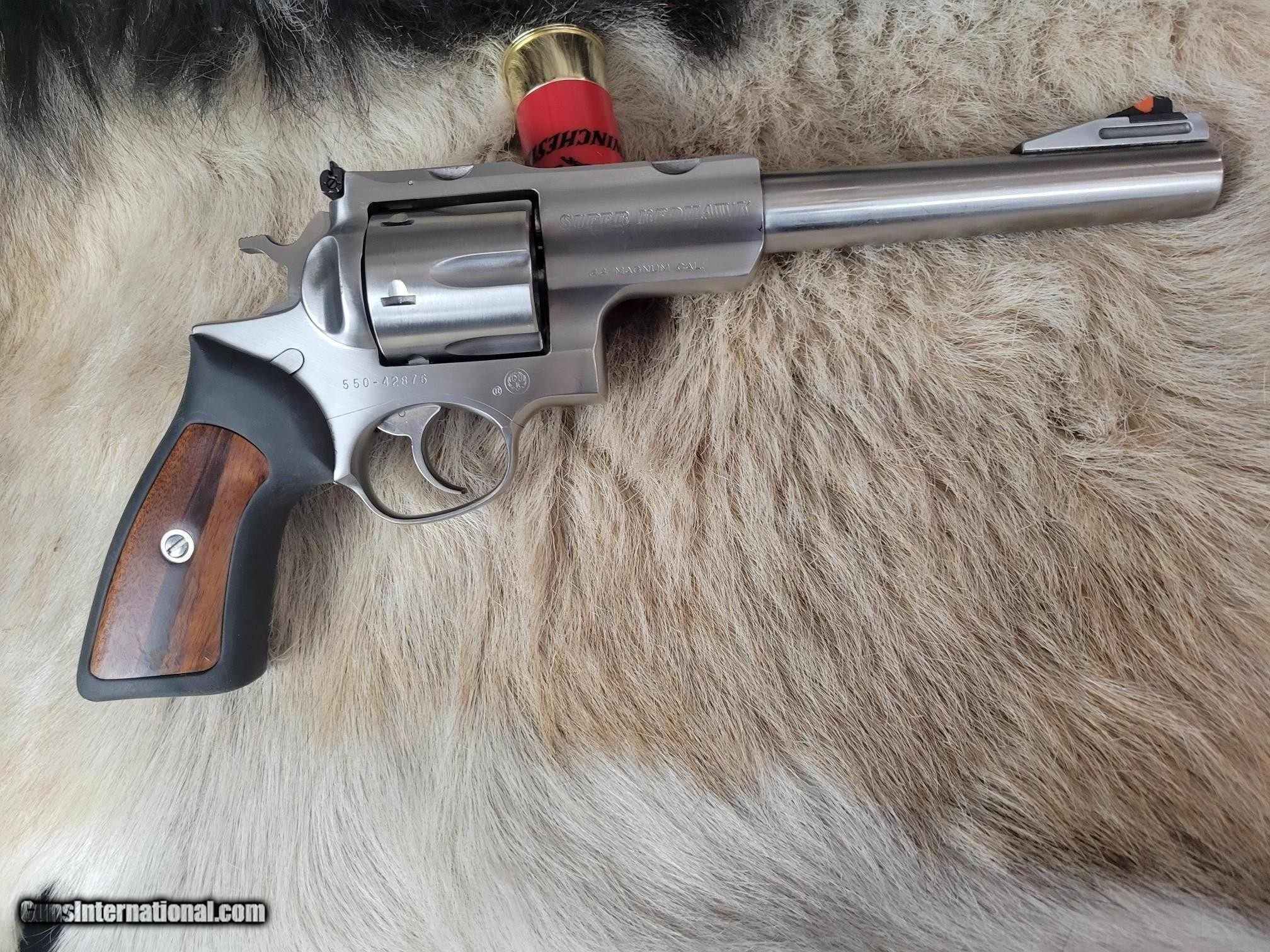 Description: Great condition! very little signs of wear est 1989-1990' Ruger Super Redhawk Double- Action Revolver , 44 Remington Mag, 7 1/2 in, Wood w/Rubber Grip, Satin Stainless Finish, 6 Rd