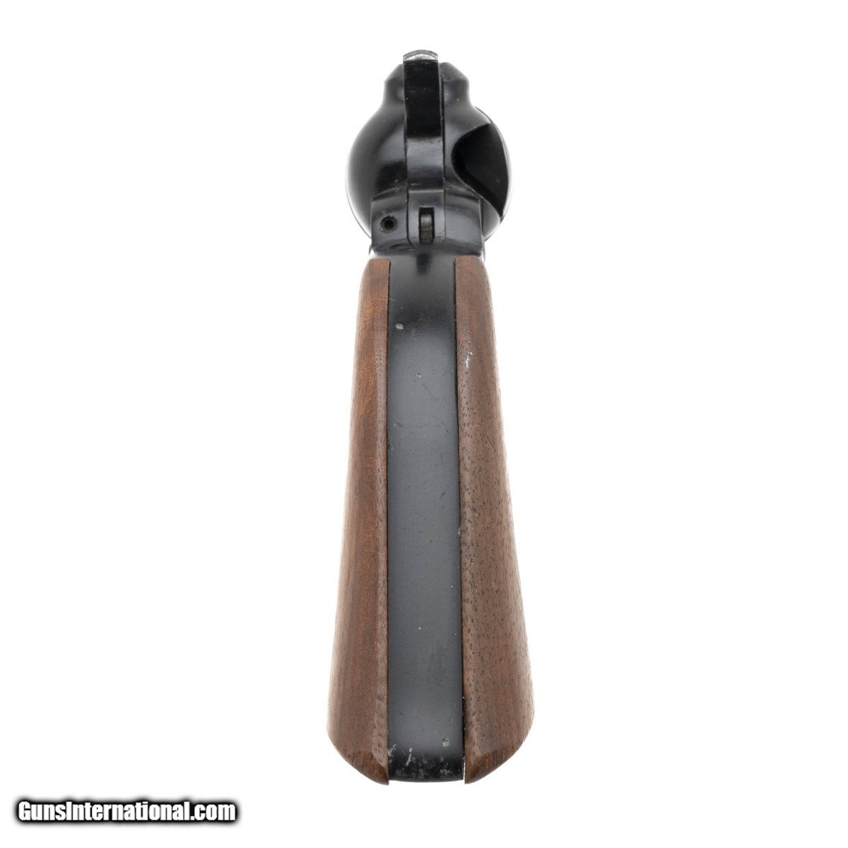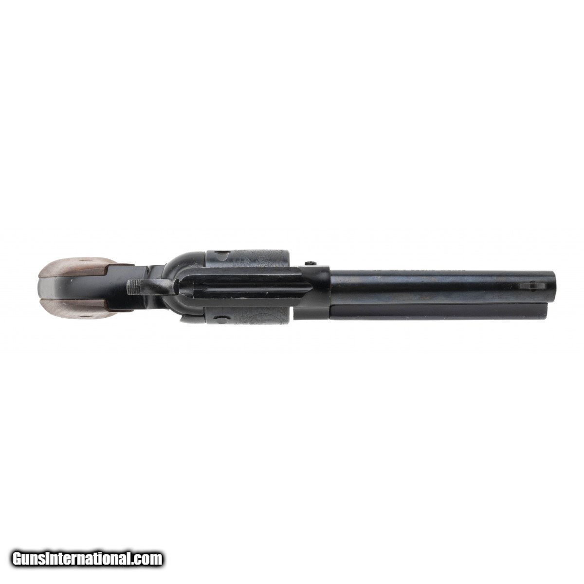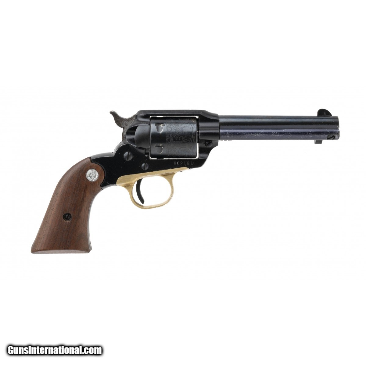 SN: 80218D. Made in 1960's. .22 LR with a 4 inch barrel. Small single action revolver with blue finish on barrel and slide. Some light wear on ejector tube but attractive engraving on cylinder. Nice wood grips with silver Ruger medallions in very good condition. Overall condition is very good. Consignment.