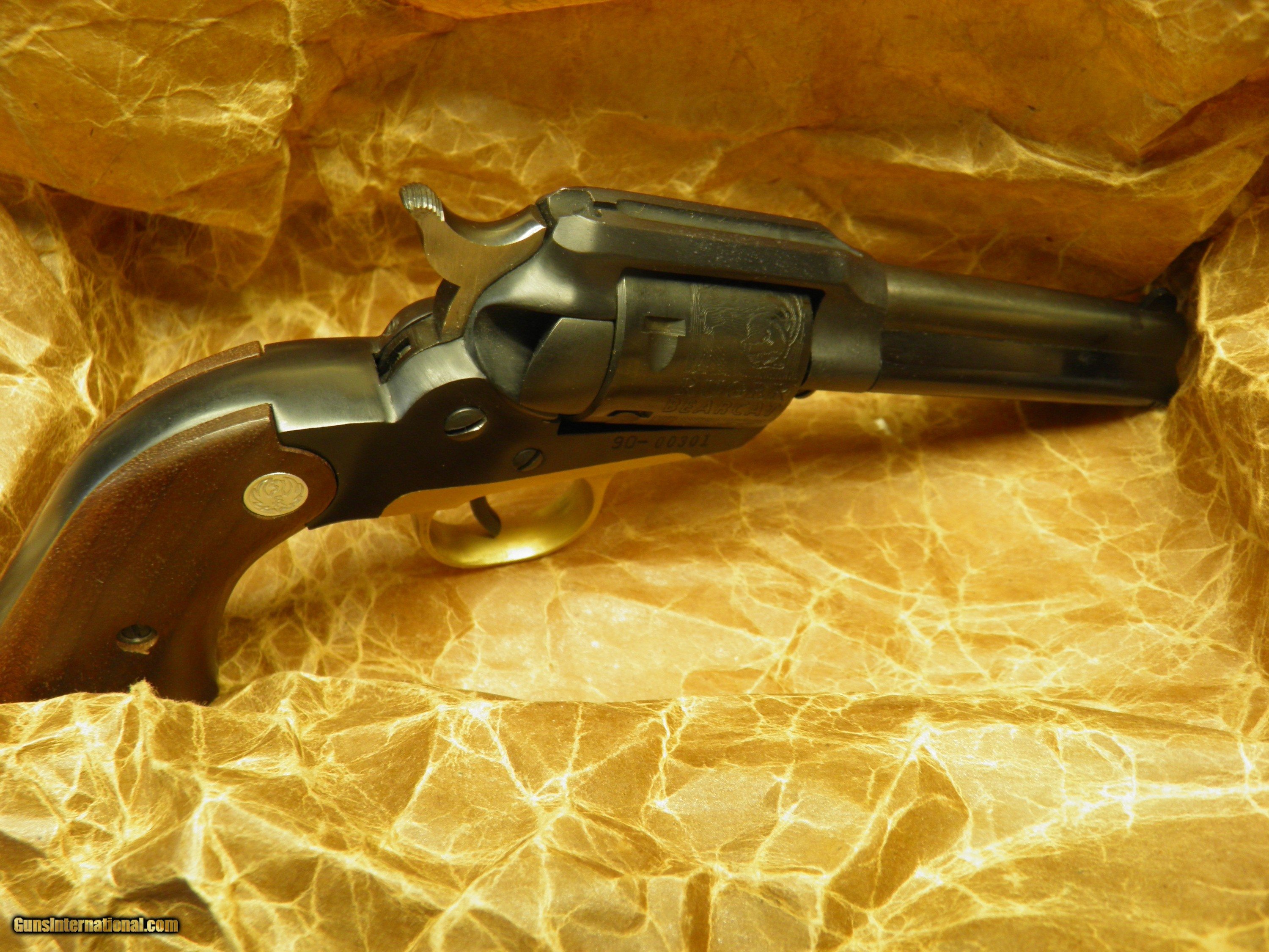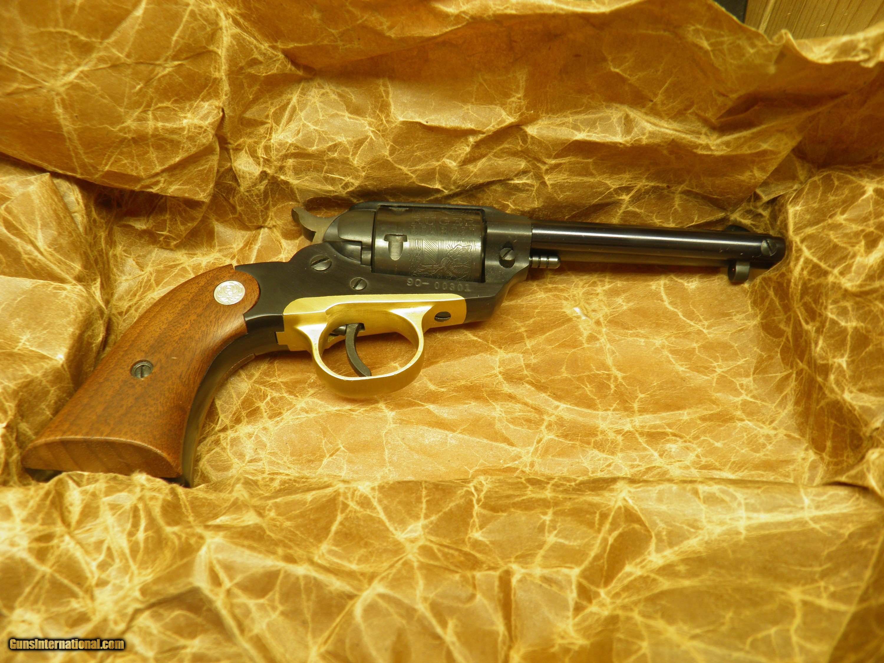 Description: RUGER OLD MODEL BEARCAT 22LR. 6 SHOT, MANF: 1970 4" BARREL, STEEL EJECTOR ROD HOUSING, BRASS ANODIZED TRIGGER GUARD , BLACK ANODIZED ALLOY FRAME, CYLINDER ENGRAVING, WALNUT GRIPS WITH EAGLE MEDALLIONS, "CONDITION" UNFIRED, BLUEING AND ANODIZING MINT, GRIPS MINT, 100% COLLECTOR QUALITY, FACTORY BOX WITH GUN WRAPPER, SUPER HARD TO FINE IN THIS CONDITION THESE DAYS, A SWEET LITTLE SIX SHOOTER!!! SOLD |