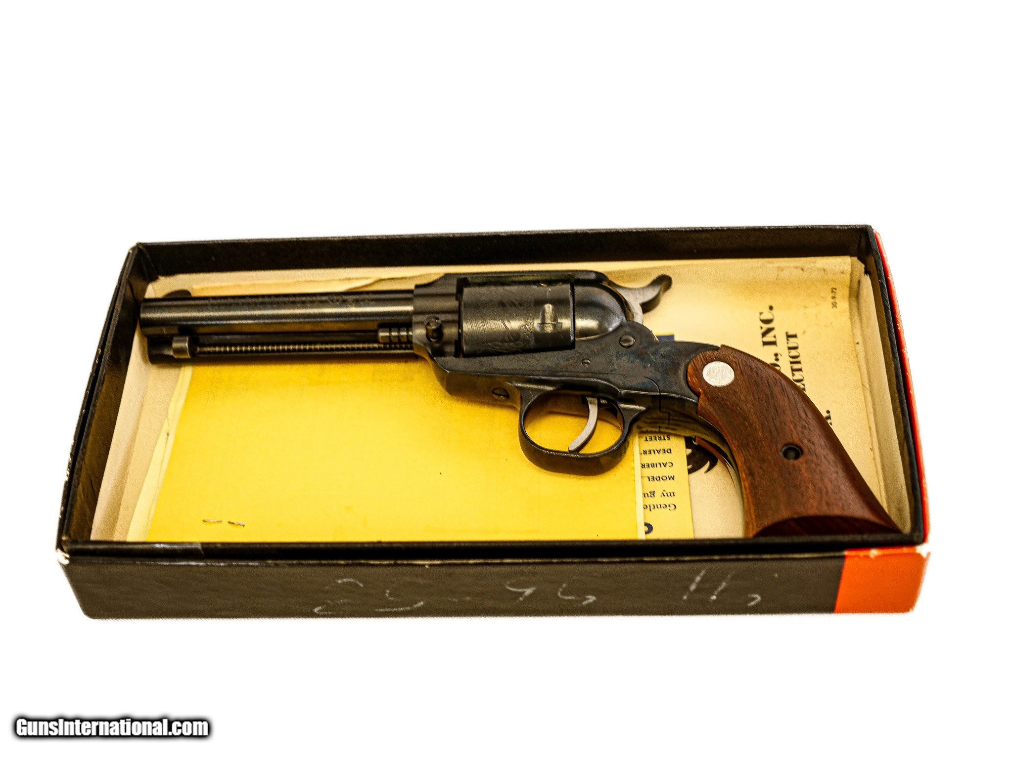 Description: Ruger - Super Bearcat, .22 LR. 4" Barrel. Single action revolver, blued frame, engraved cylinder, wood grips, limited production model, manufactures circa 1973, includes factory fox, warranty card, and instruction manual, new in the box and unfired, perfect 100% everything, finest factory new example you will ever encounter. S & H - $50.00. Inv: 52240 $749.00 SOLD |