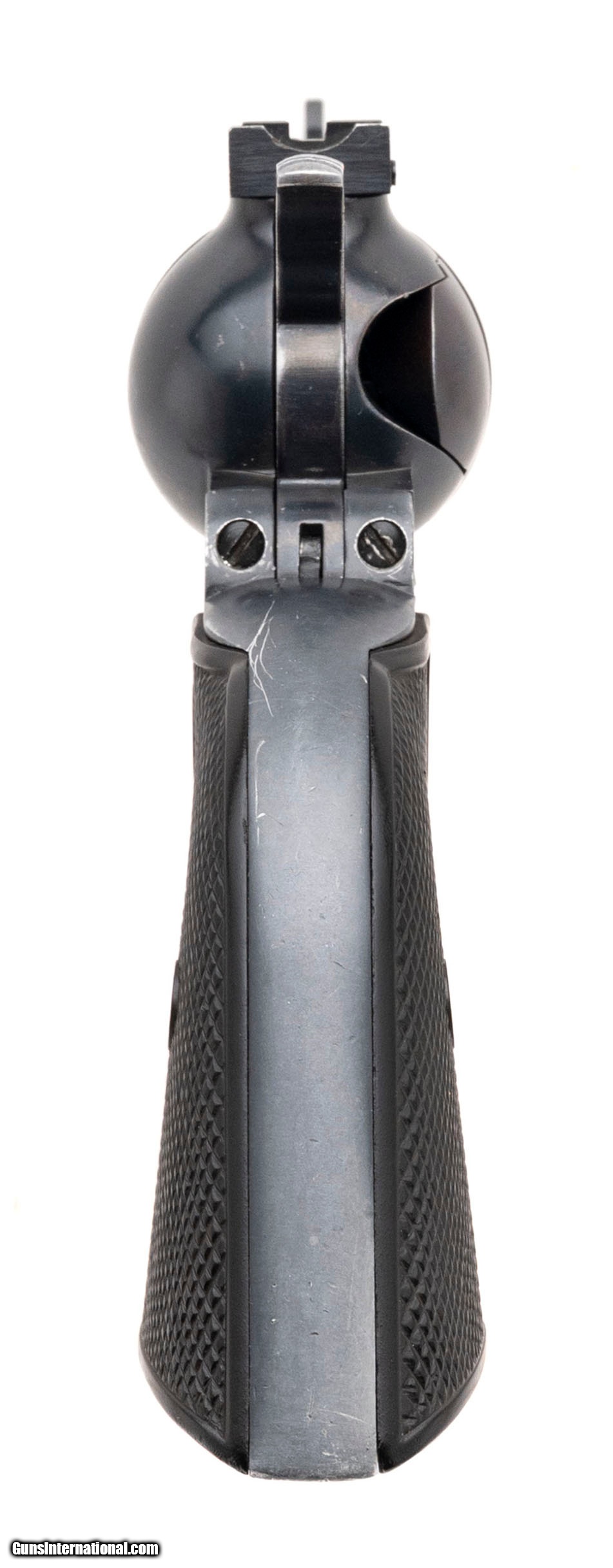 Description: "SN: 9912. Made in 1957, .357 Magnum with a 4.625"" barrel. Bore is bright with strong rifling. 3 screw, flat top model blued single action revolver with checkered plastic grips. Shows pitting in some areas but very good condition overall. SOLD |