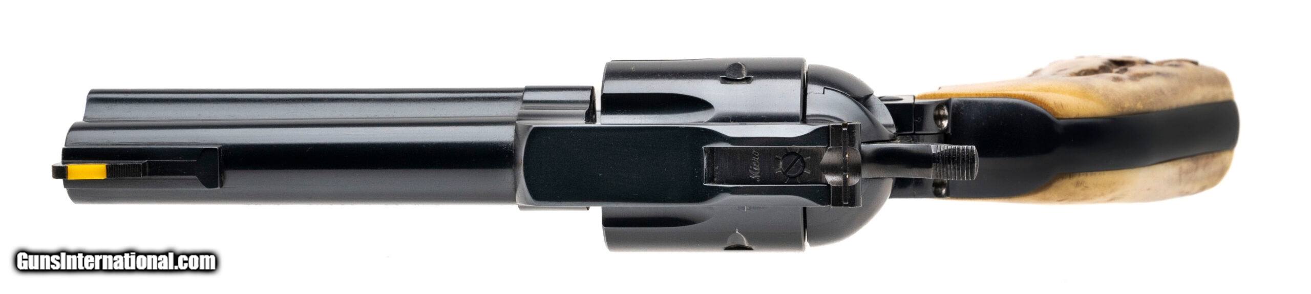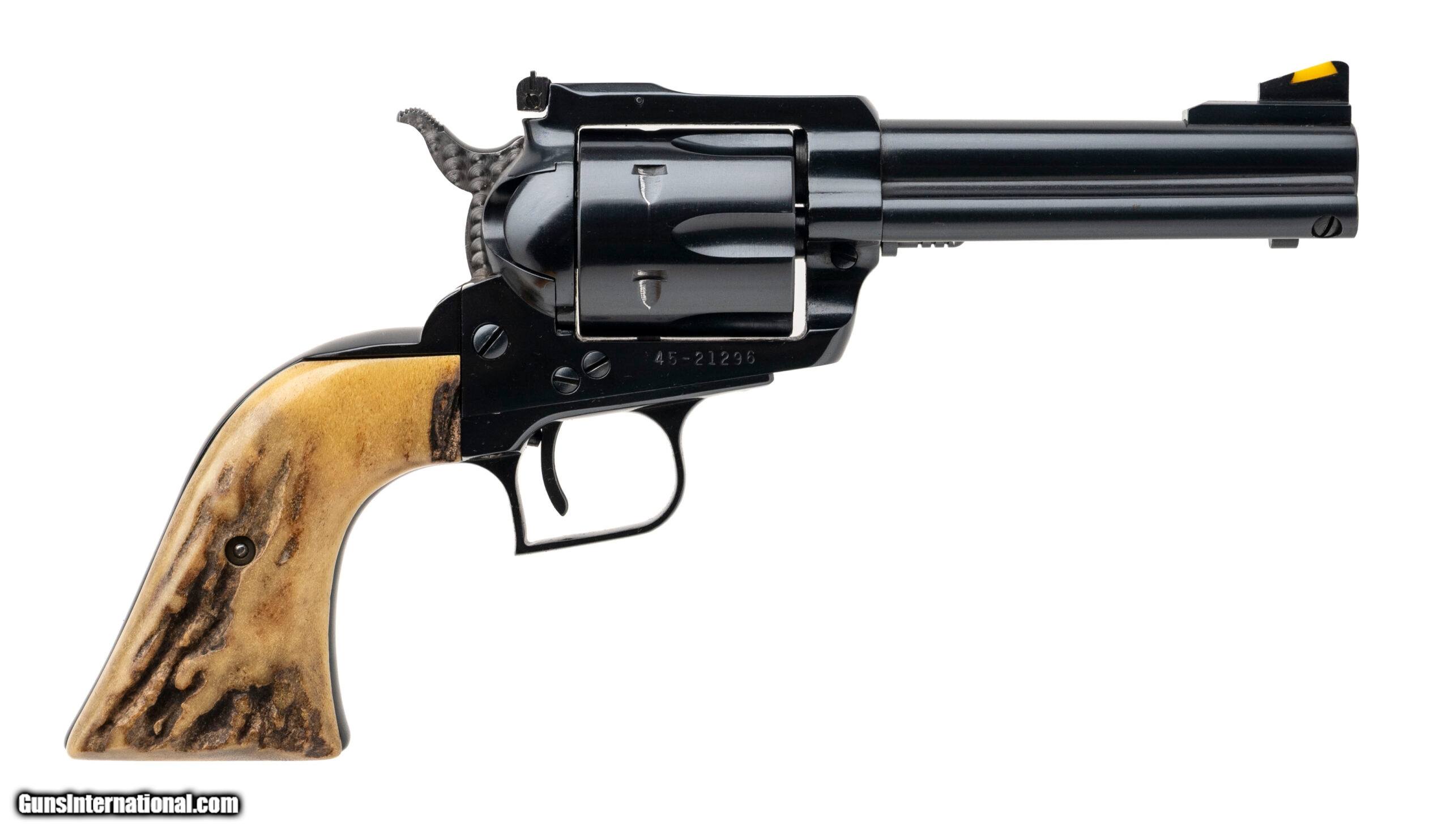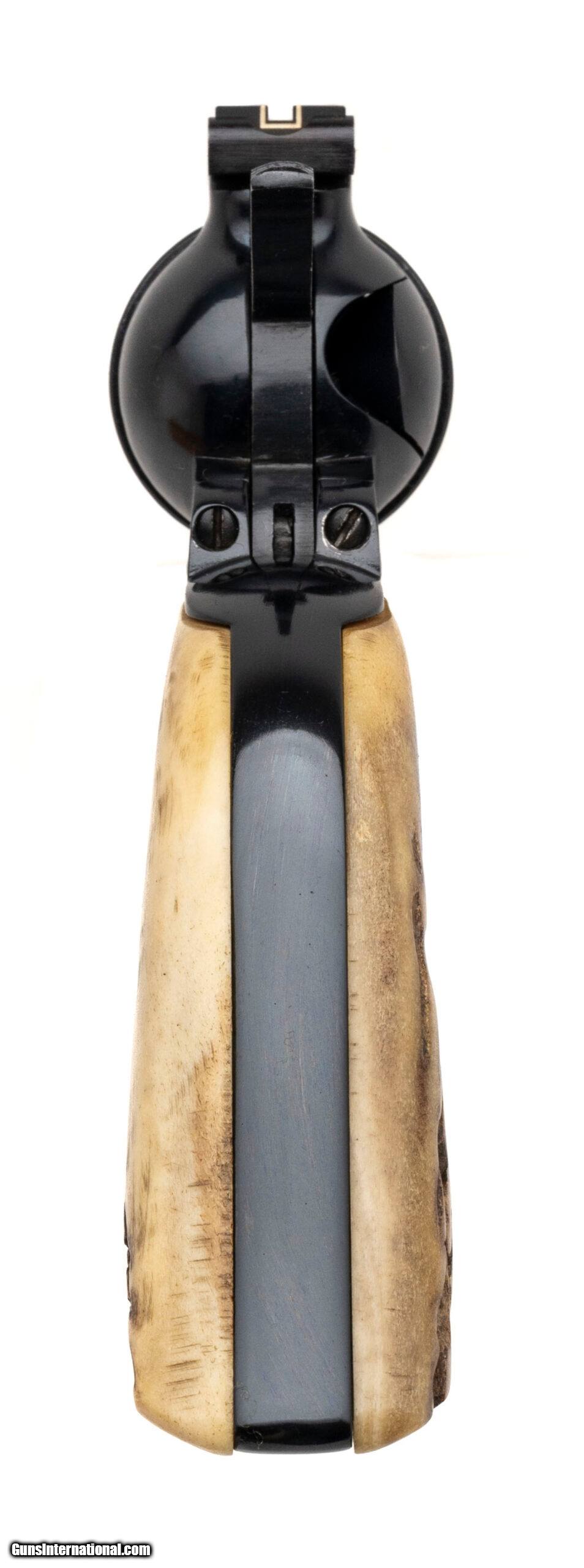 Description: "SN: 45-21296. Made in 1981, .45 Colt/.45ACP with a 4.6"" barrel. Bore is excellent. Single-action only revolver with an adjustable rear sight, jeweled hammer, 6rd cylinder, blue finished frame, and staghorn grips. Metal shows light marks, and the finish has been professionally redone. Overall condition is near excellent. Includes an additional 6rd .45ACP cylinder, and original box. SOLD |