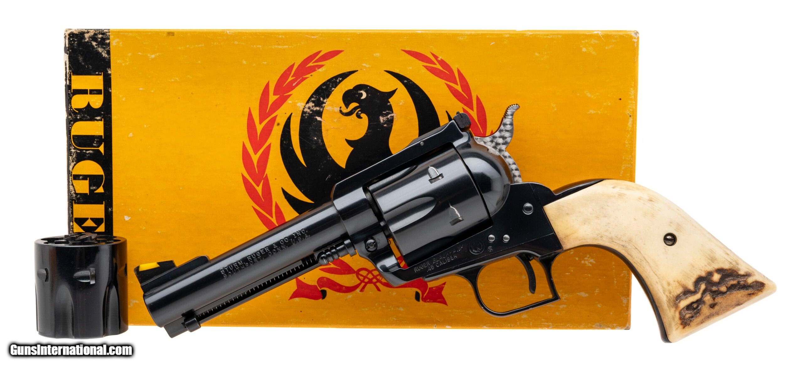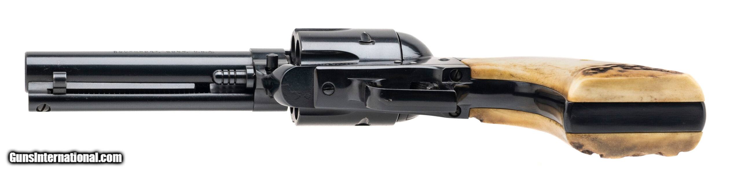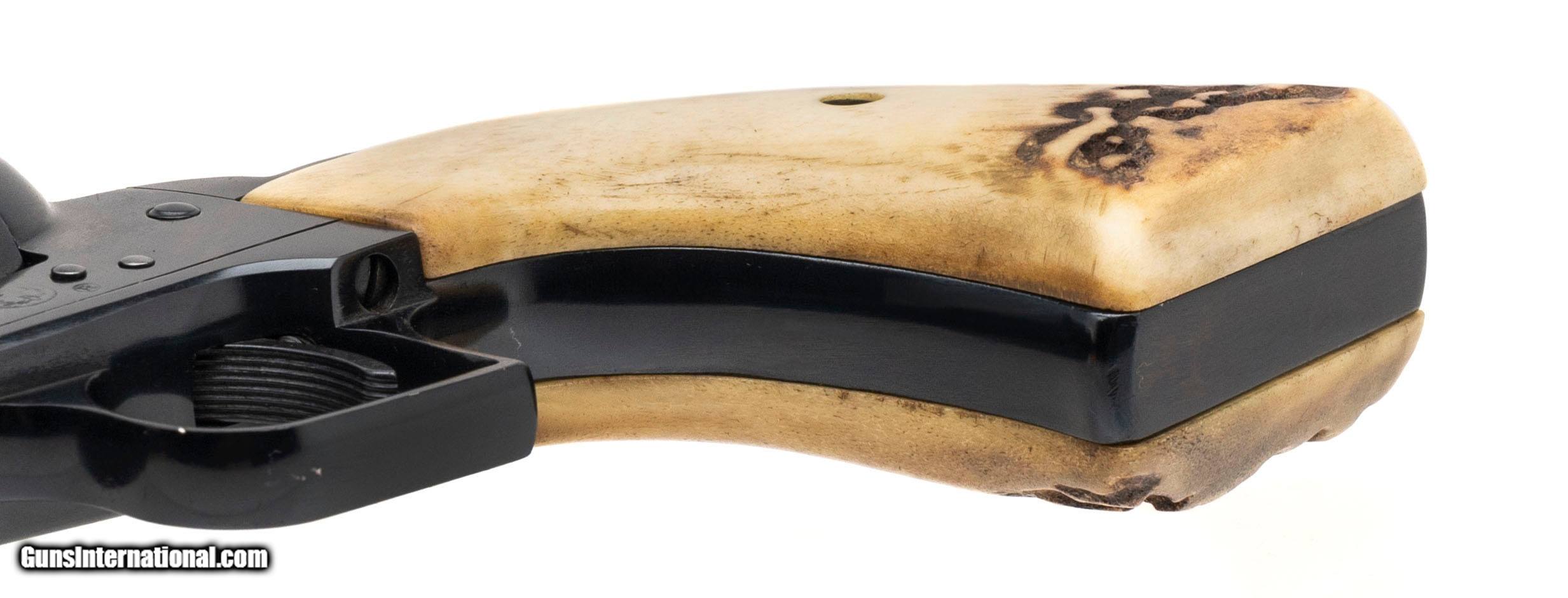 Description: "SN: 45-21296. Made in 1981, .45 Colt/.45ACP with a 4.6"" barrel. Bore is excellent. Single-action only revolver with an adjustable rear sight, jeweled hammer, 6rd cylinder, blue finished frame, and staghorn grips. Metal shows light marks, and the finish has been professionally redone. Overall condition is near excellent. Includes an additional 6rd .45ACP cylinder, and original box. SOLD |