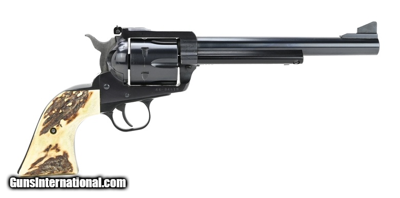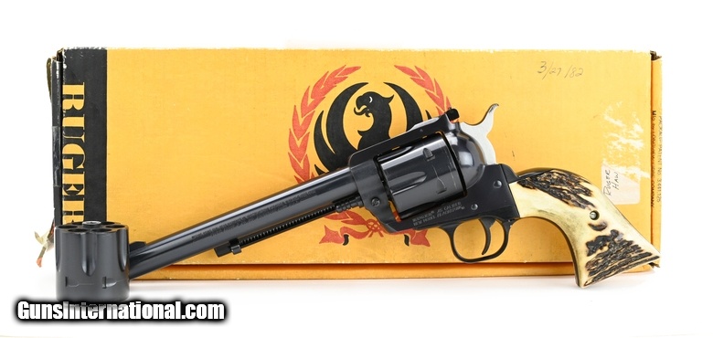 Description: " Ruger New Model Blackhawk .45 LC/.45 ACP caliber revolver. 7 ½” Blue model with beautiful custom stag grips and dual cylinders. Excellent condition with box.