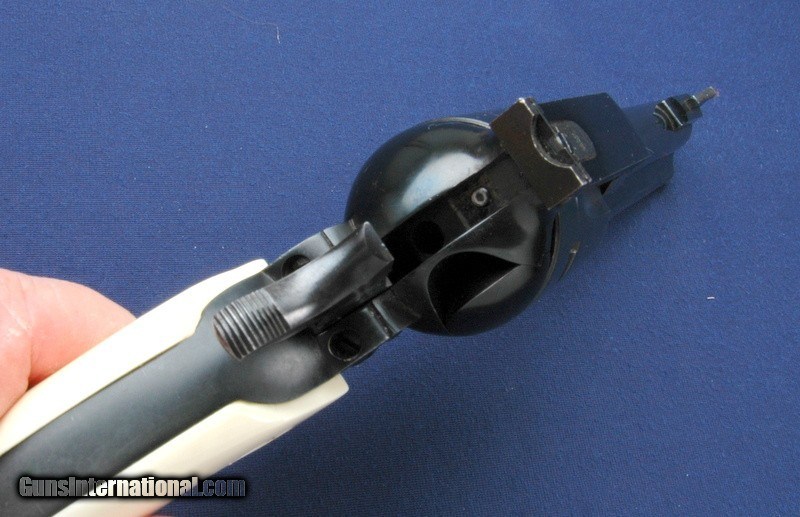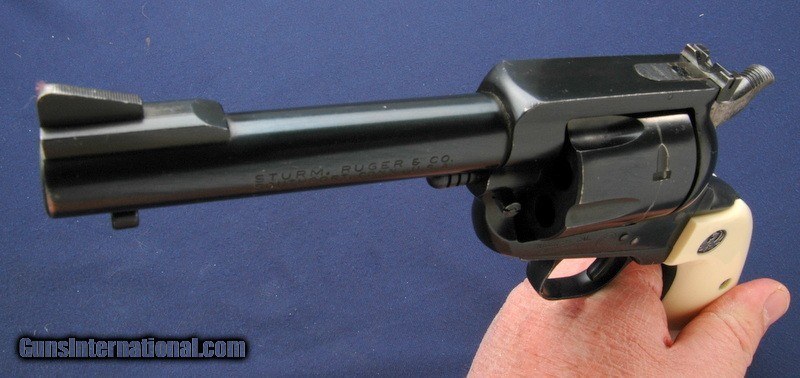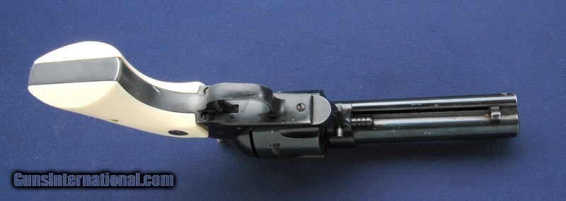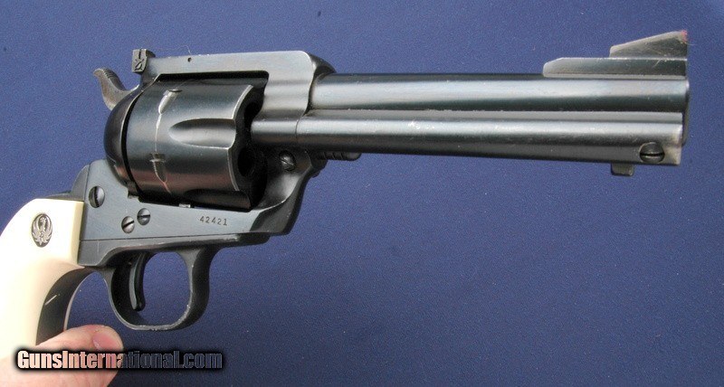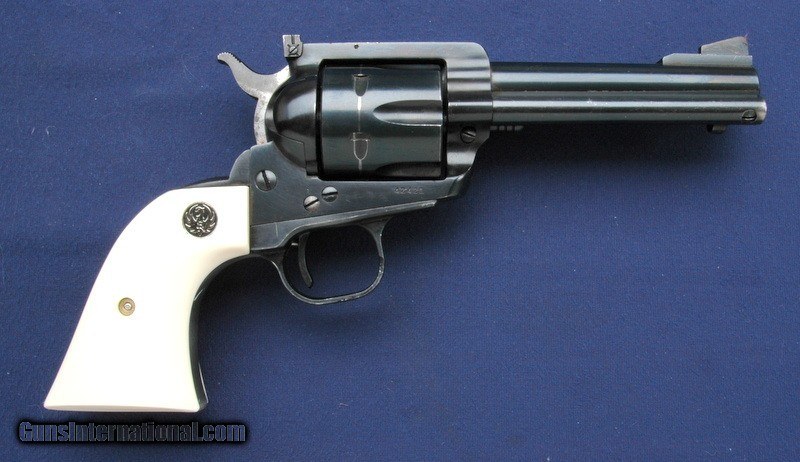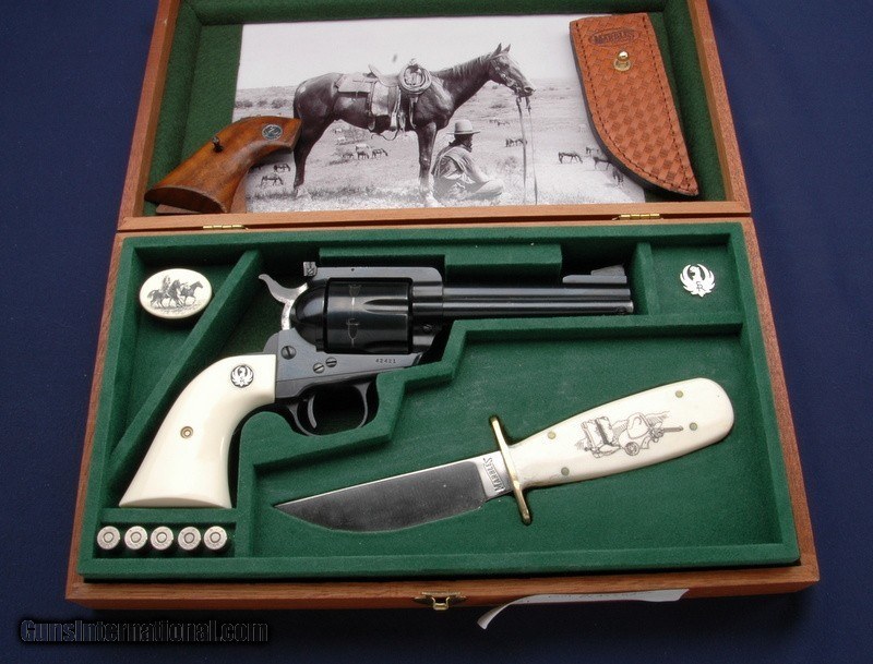 Description: Here you have a very early, unaltered Ruger Blackhawk flat top chambered in .357. 4 3/4" barrel, comes with white micarta grips. Custom cased in a cowboy motif with a Marbles bone handled scrimshawed gambler's dagger and sheath. This revolver has not been returned to Ruger to have the transfer bar safety installed. So this is really a 5 shooter with an empty chamber under the firing pin. Original Micro rear adjustable sight. Bright, clean oiled bore. $55 shipping to the lower 48, 3% surcharge for using a CC. If you choose to pay with a personal check, we will hold the item for up to 10 days to make sure the check clears. Please expedite such payment as we will hold an item on your word for 5 days. SOLD |