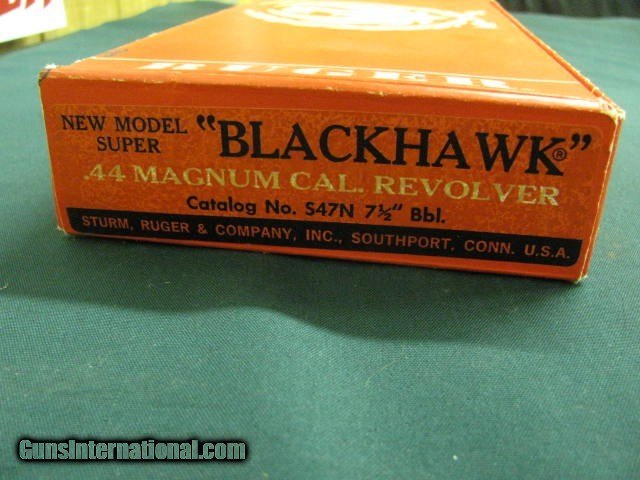 Description: 7324 Ruger Super Blackhawk 44 mag 7.5 barrel, protected rear adjustable site,square black trigger guard 2 screw, old model, correct box, no papers,unfluted cyclinder, wood medallion grips,COLLECTOR QUALITY. 99% SOLD Handgun Caliber: .44 Remington Magnum |