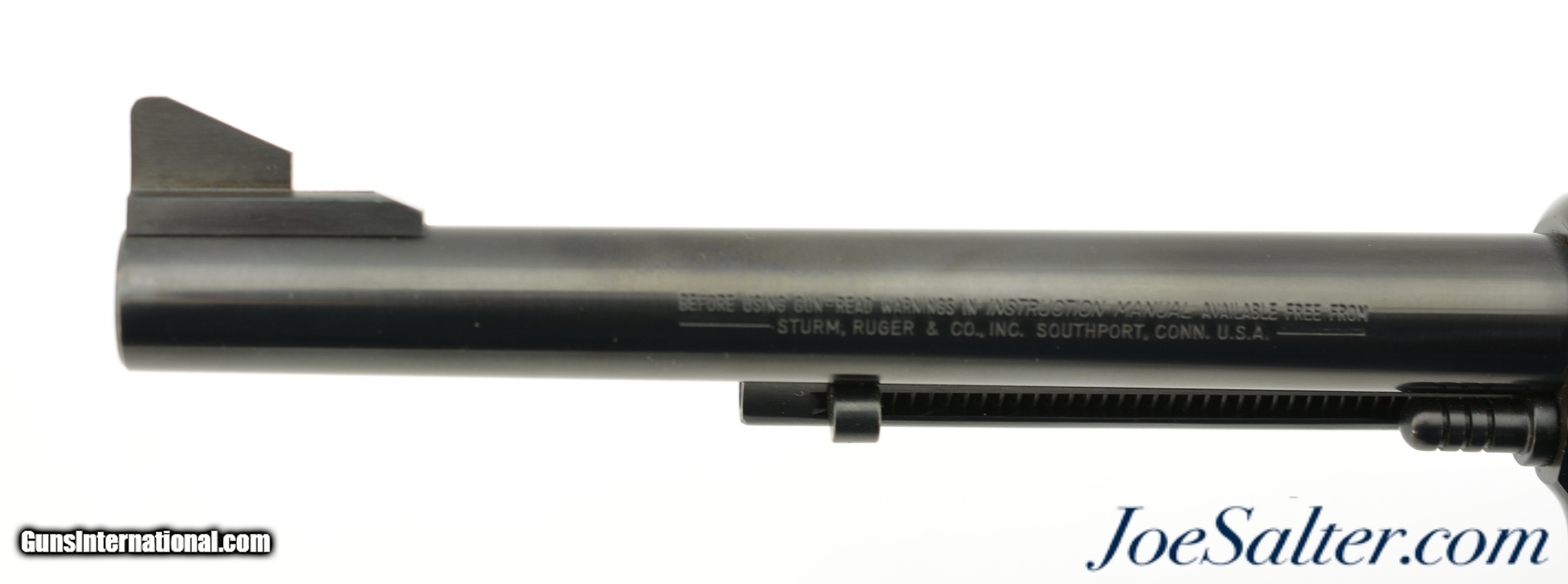 Description: Serial #47-11019, .45 Colt, 7.5 inch barrel with a bright, excellent bore. This is the Ruger Bisley Blackhawk revolver manufactured in 1986 featuring the Bisley 1896 commemorative cylinder. In excellent plus condition the barrel and frame retain virtually all, 99% plus original blue finish with only a very faint hint of turn ring on the cylinder. The walnut grips are likewise excellent. It comes in an original, un-numbered cardboard box correctly labeled to the model. A beautiful example of this mid-1980's Bisley Blackhawk. FFL SOLD |