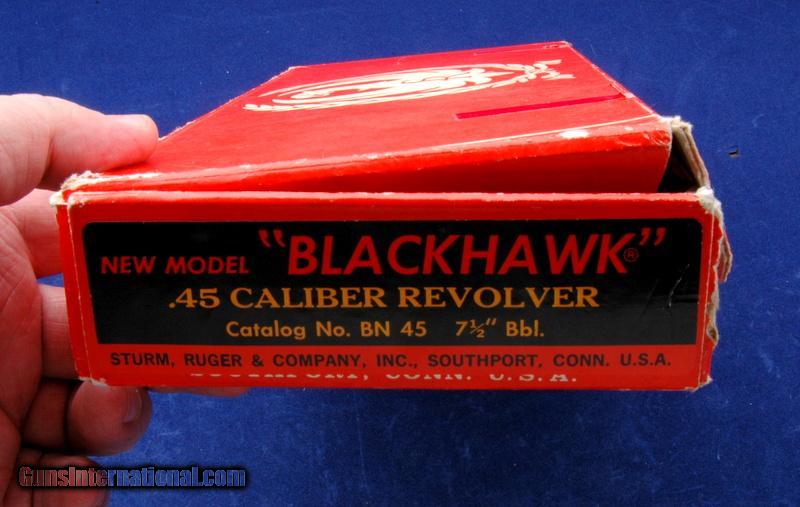 Description: Available for purchase is this collector condition older Ruger New Model Blackhawk convertible. In the original red box with desicant paper and .45 ACP cylinder. Truely collector condition. Bluing is 99%. Both cylinders have been fired, but not much. There is also an overbox, but it has been re numbered to this gun. No manual or other paper inserts. Hard to find in this condition. $35 shipping ot the lower 48 and 3% surcharge for using a CC. SOLD |