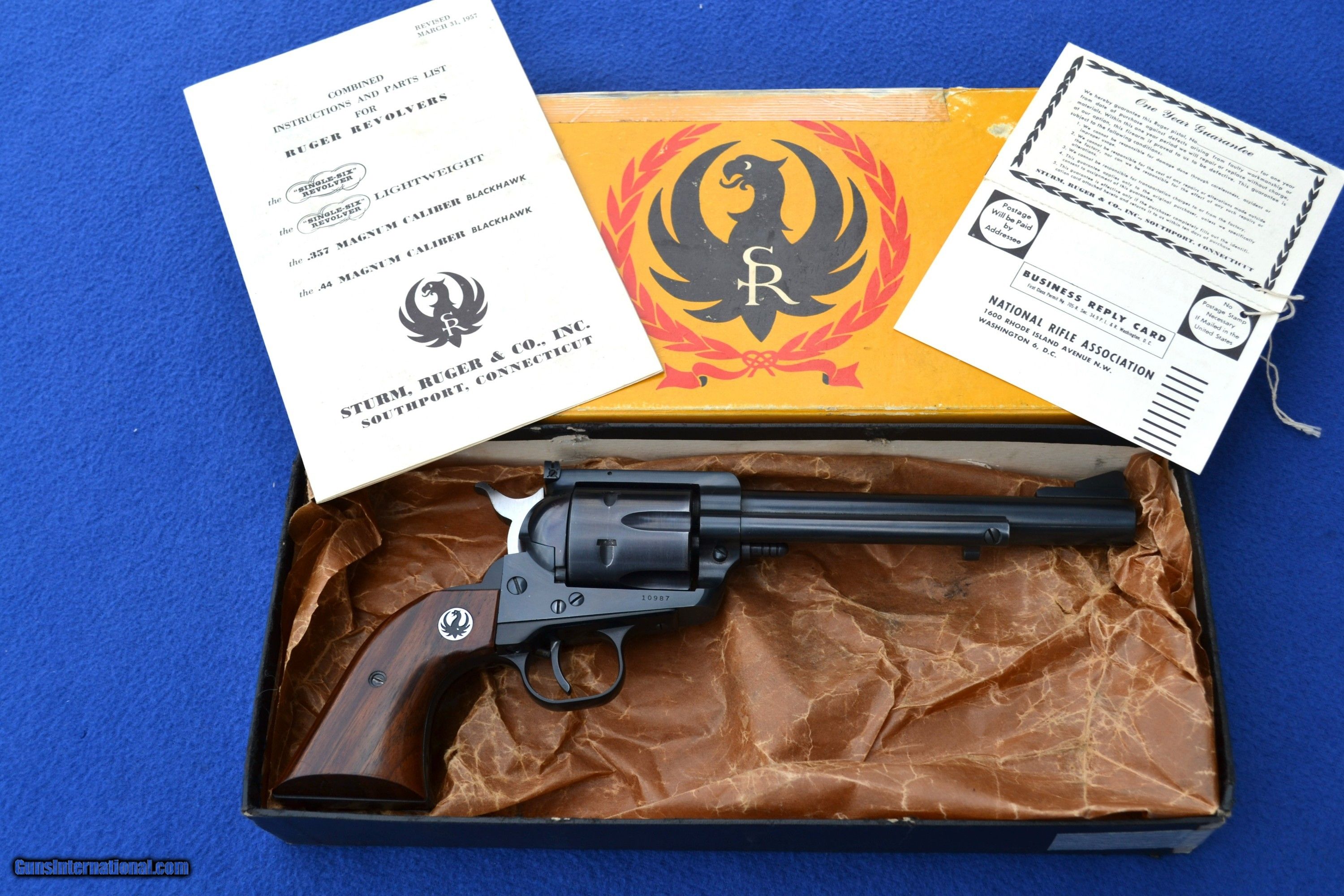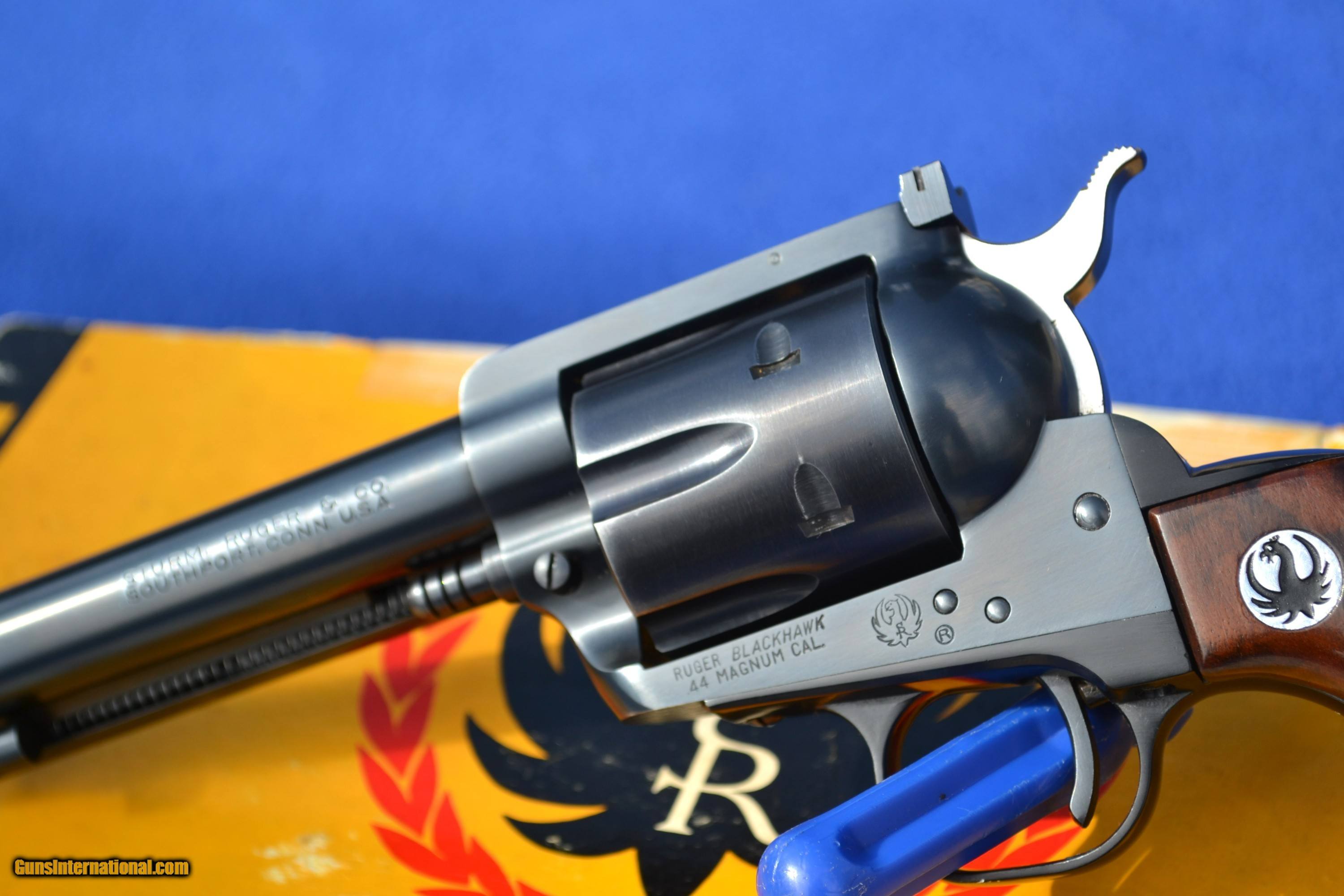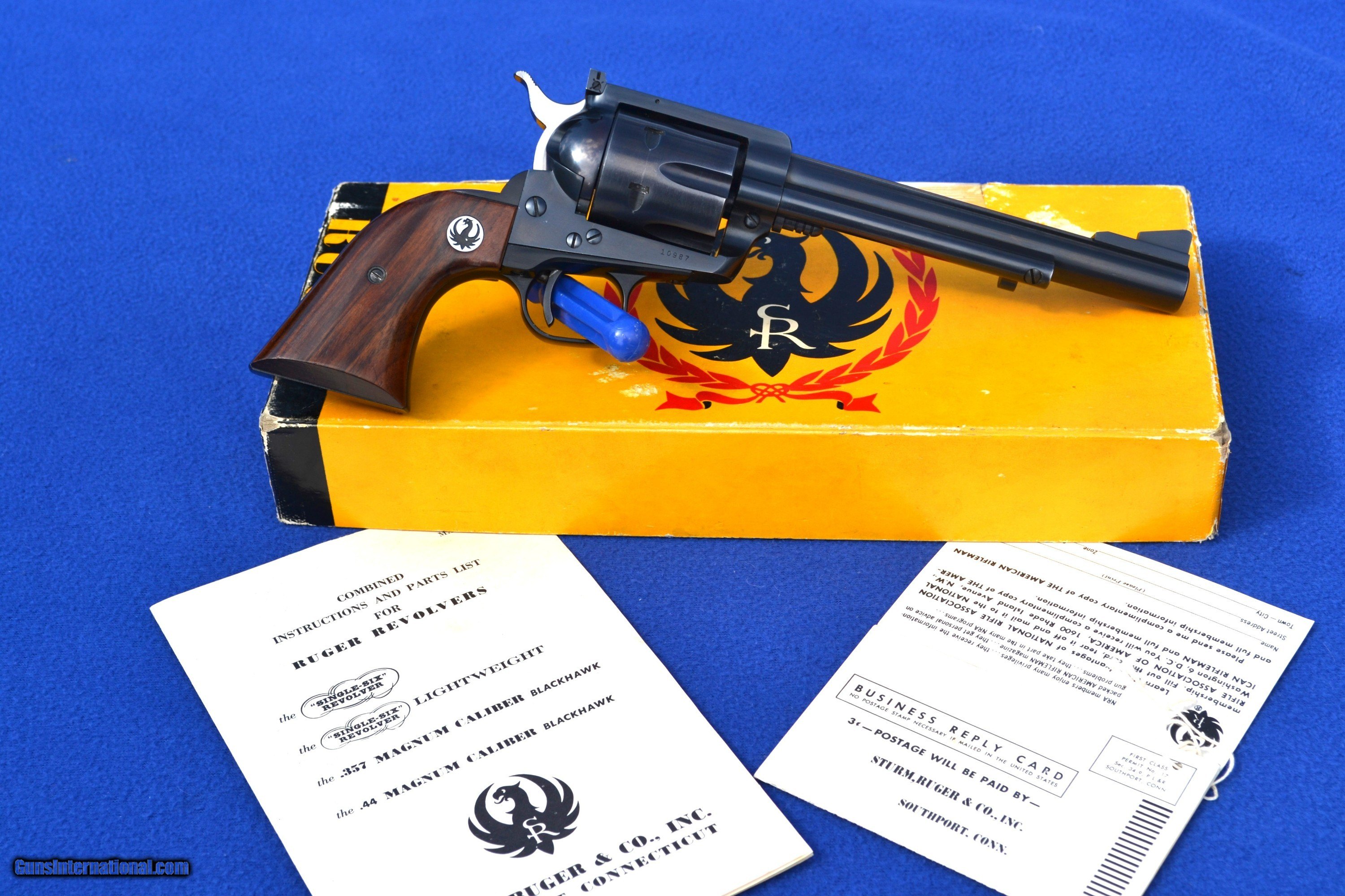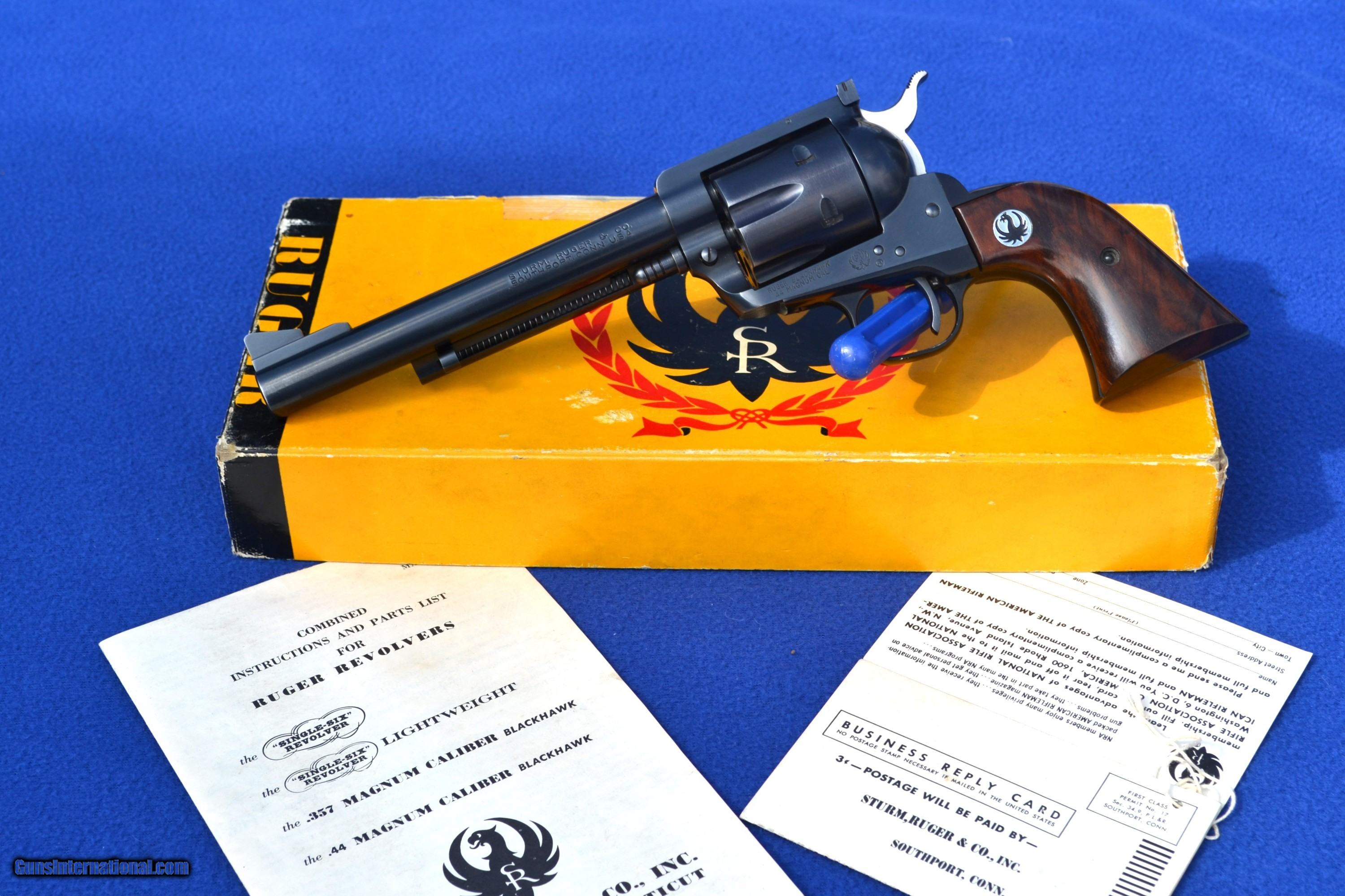 Description: Nice 1958 Ruger Blackhawk 44 Mag Flattop revolver with Factory 2-piece, Non Catalogued Box and paperwork. This Ruger is all original and has not had the transfer bar safety installed. Has crisp, tight action and appears to be fired very little. Comes with XR3 Walnut Grips with amazing grain. Also includes early, factory paperwork with .03 warranty card. Original factory box has great color with some tape on a few corners/seams and is numbered to gun (see pics). Overall, great collectible package! Please email with any questions. Buyer to pay shipping (insurance additional and must be requested). Sorry, no sales to CA SOLD |