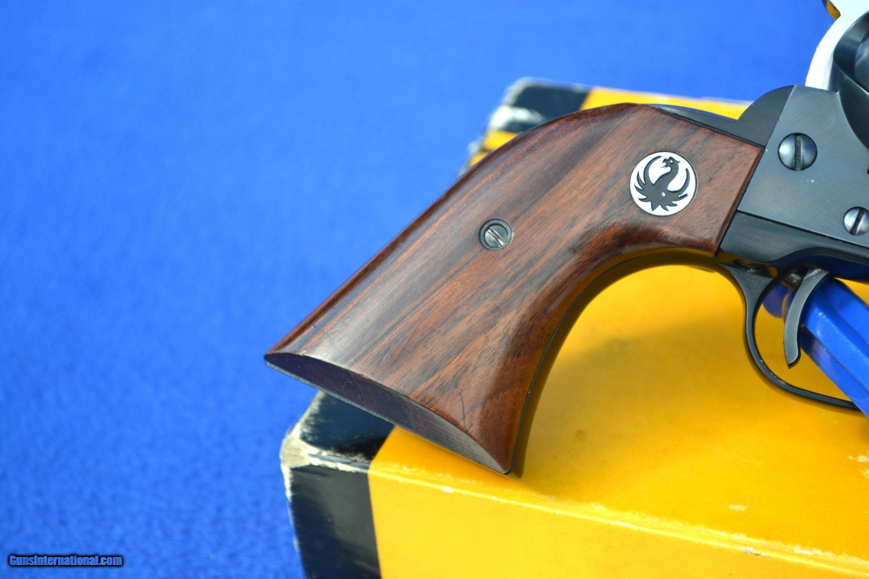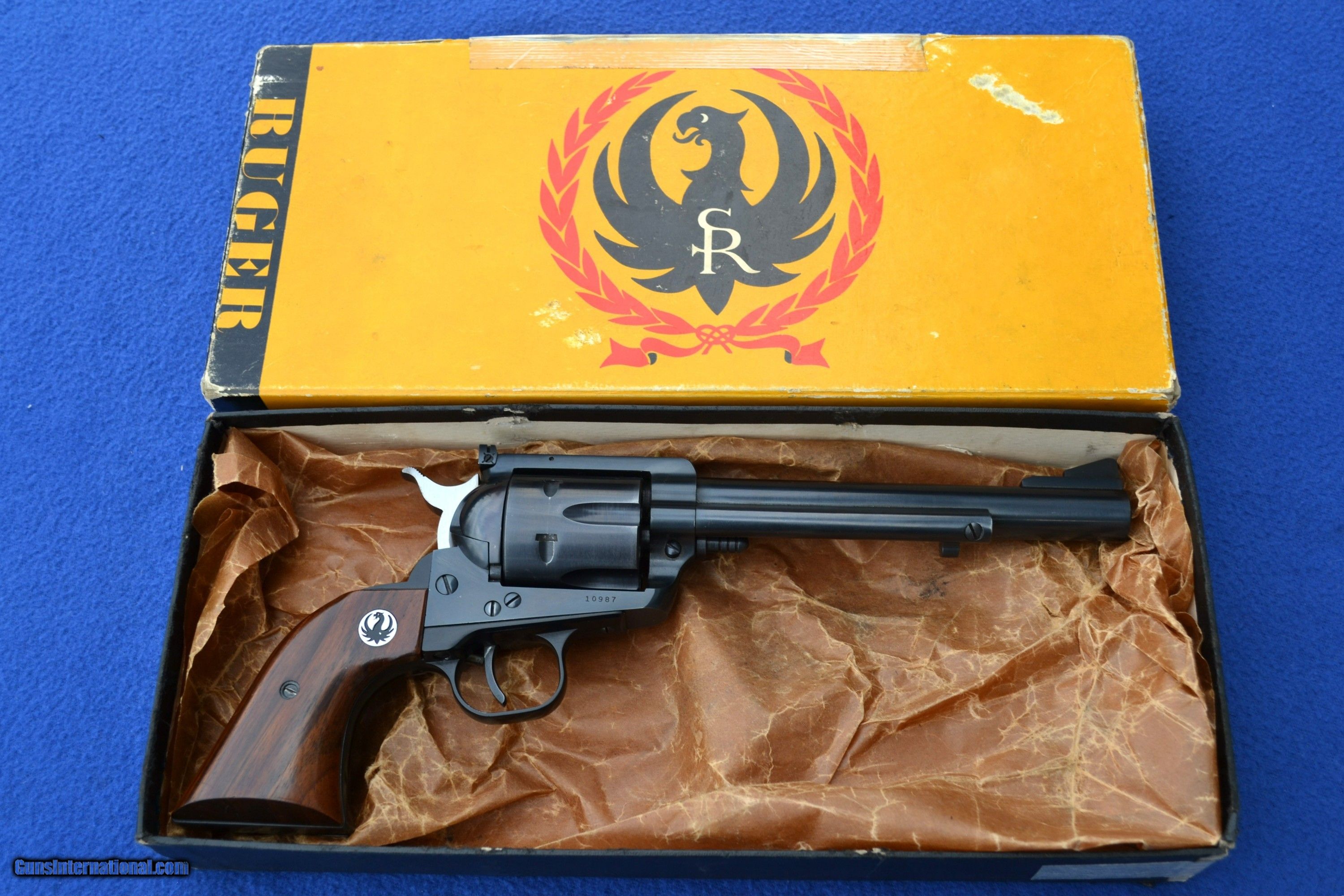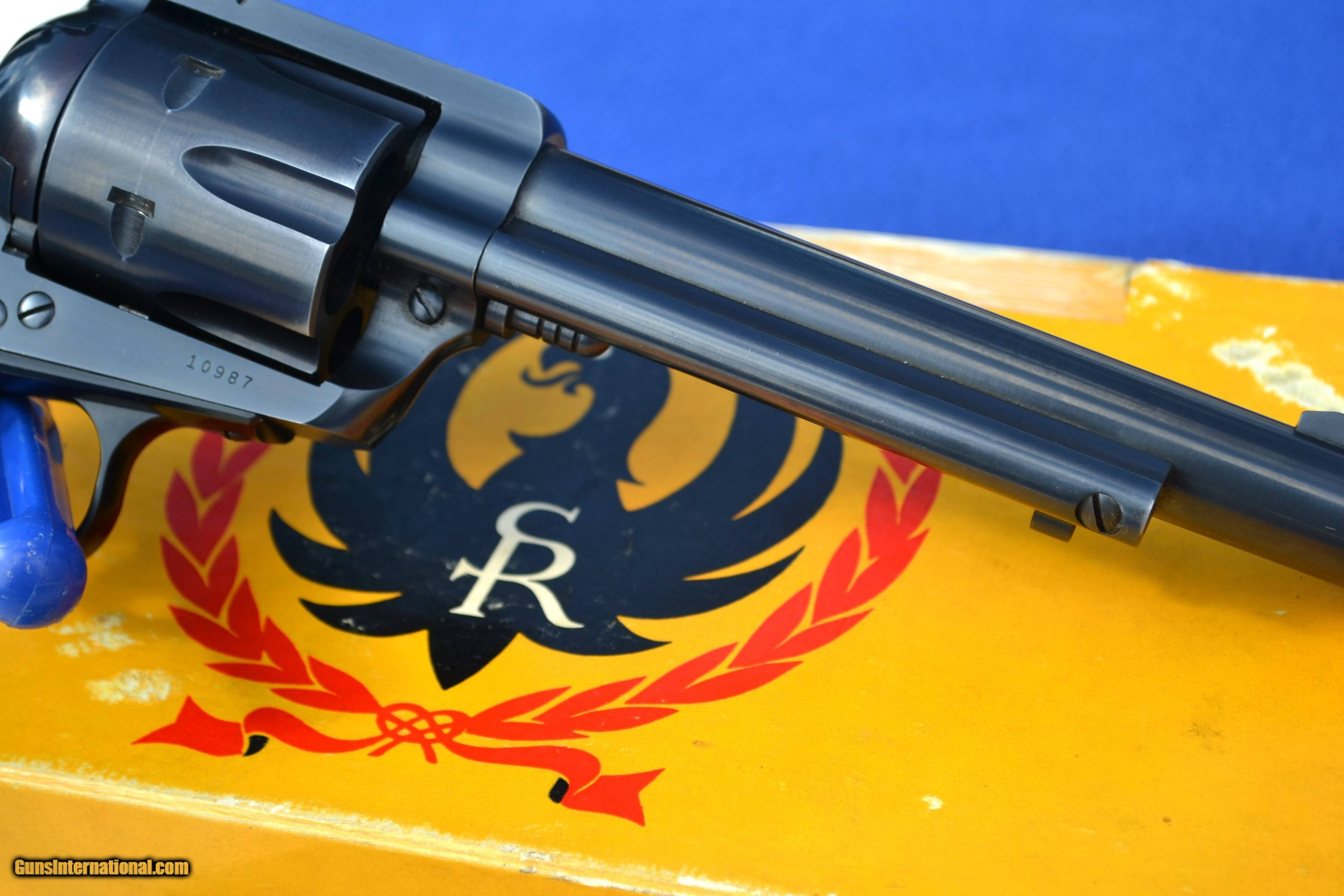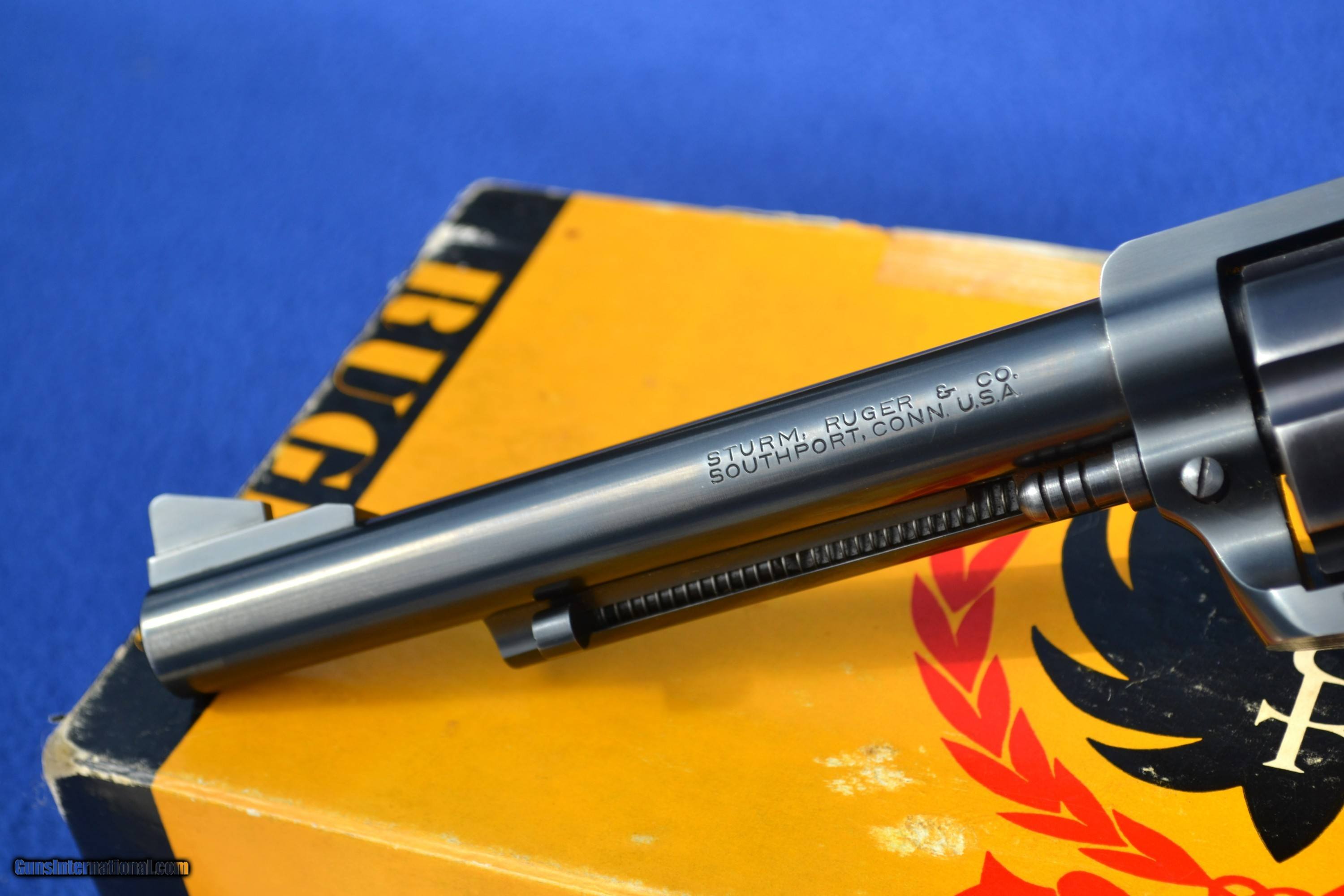 Description: Nice 1958 Ruger Blackhawk 44 Mag Flattop revolver with Factory 2-piece, Non Catalogued Box and paperwork. This Ruger is all original and has not had the transfer bar safety installed. Has crisp, tight action and appears to be fired very little. Comes with XR3 Walnut Grips with amazing grain. Also includes early, factory paperwork with .03 warranty card. Original factory box has great color with some tape on a few corners/seams and is numbered to gun (see pics). Overall, great collectible package! Please email with any questions. Buyer to pay shipping (insurance additional and must be requested). Sorry, no sales to CA SOLD |