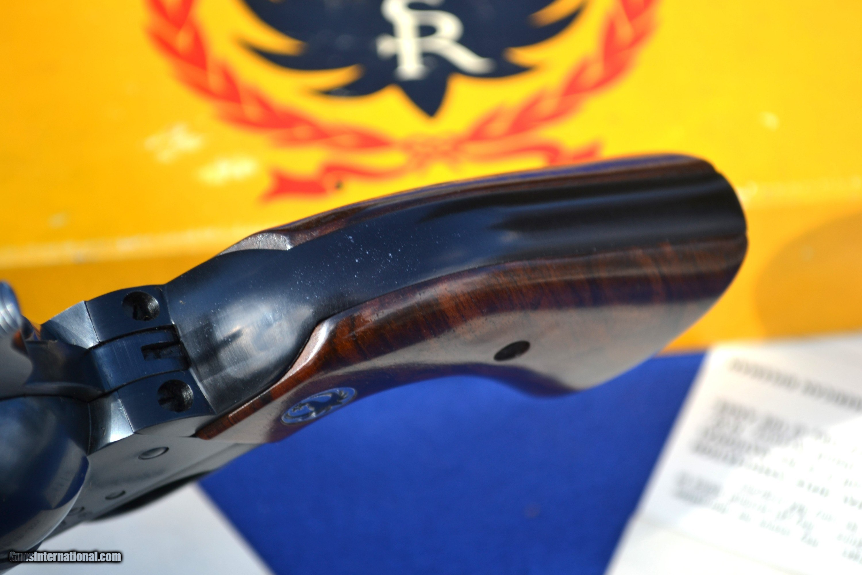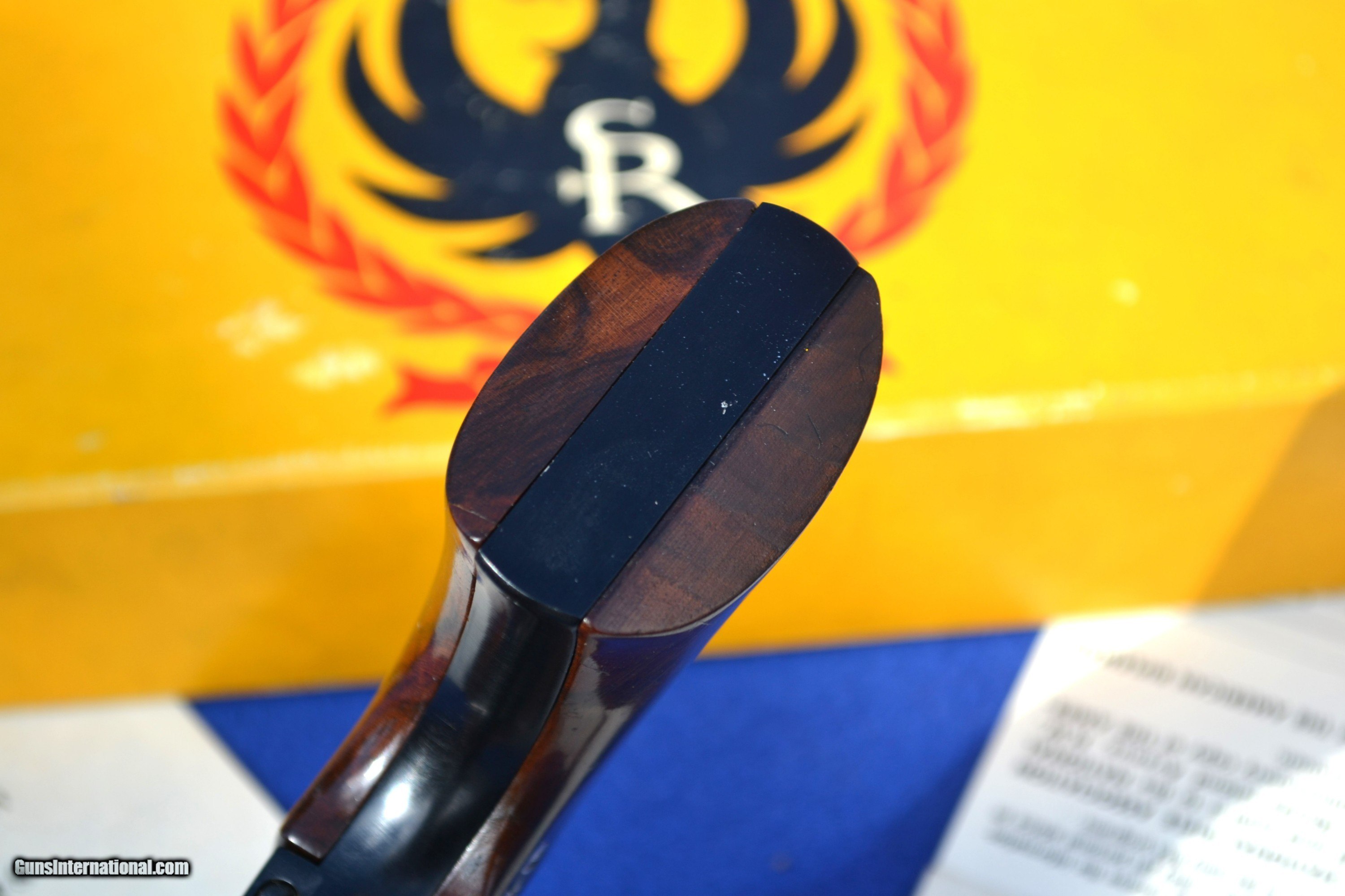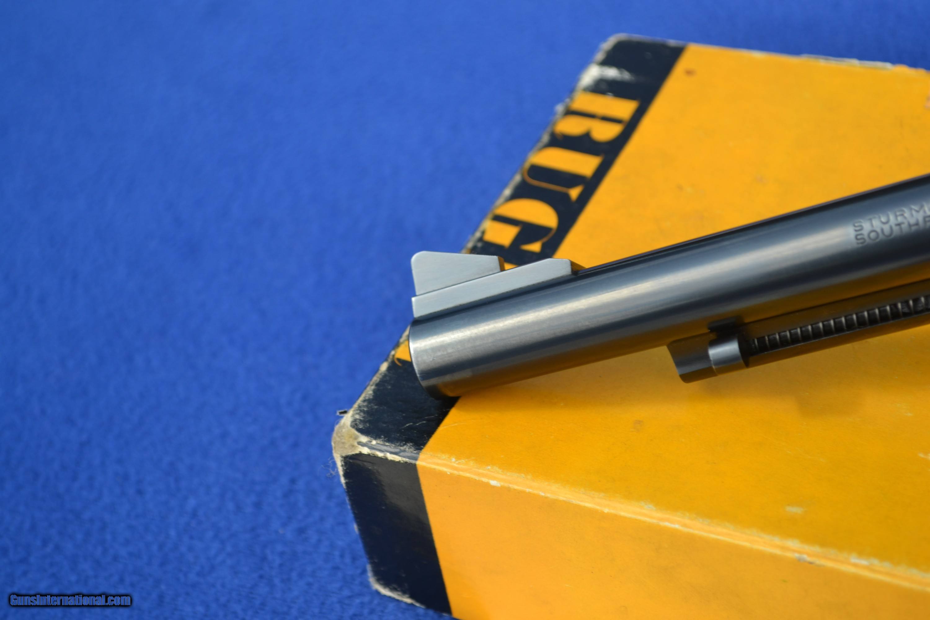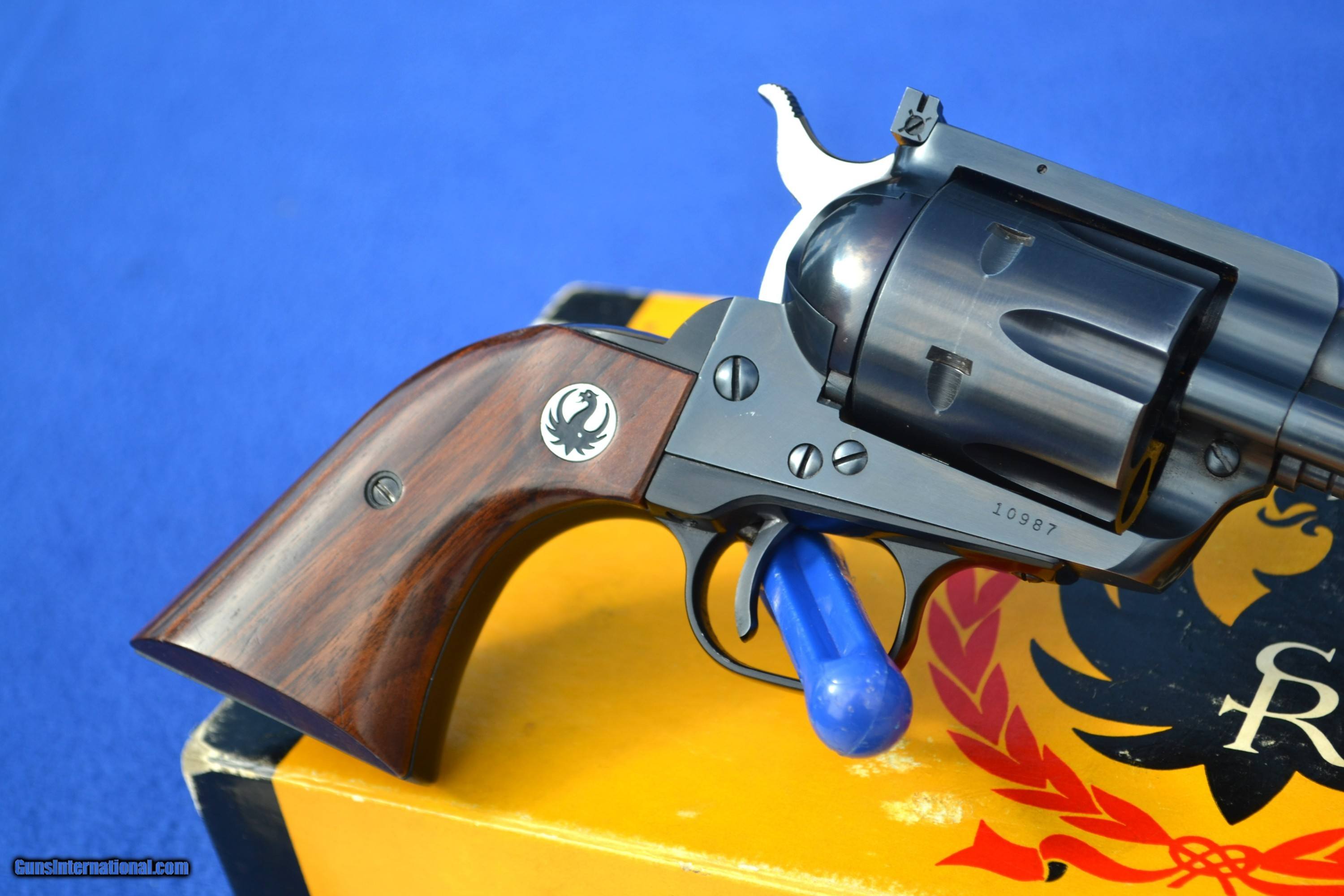 Description: Nice 1958 Ruger Blackhawk 44 Mag Flattop revolver with Factory 2-piece, Non Catalogued Box and paperwork. This Ruger is all original and has not had the transfer bar safety installed. Has crisp, tight action and appears to be fired very little. Comes with XR3 Walnut Grips with amazing grain. Also includes early, factory paperwork with .03 warranty card. Original factory box has great color with some tape on a few corners/seams and is numbered to gun (see pics). Overall, great collectible package! Please email with any questions. Buyer to pay shipping (insurance additional and must be requested). Sorry, no sales to CA SOLD |