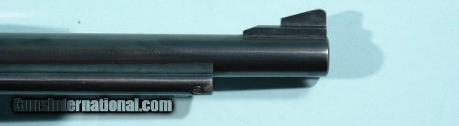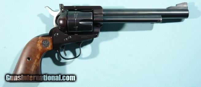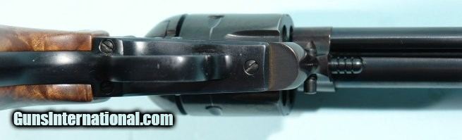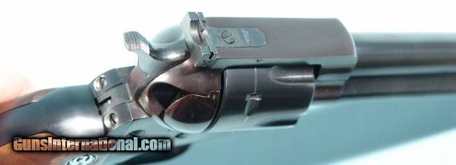 Description: RARE 1960 RUGER OLD MODEL BLACKHAWK FLAT-TOP THREE SCREW BKH-36 .357 MAGNUM 6 1/2" BLUE REVOLVER. All matching except grips which are later Ruger burl grain upgrades. "Alcoa" XR3 correct trigerguard/back strap with 99% of the original black anodized finish. Frame, cylinder and barrel with 98% of the original blue with balance at muzzle, edges of cylinder, drag line and front edge of ejector rod housing. Mint bore, rifling and chambers. "Micro" rear adjustable sight on "flat-top" top strap. Correct front sight. Crisp markings. Perfect working order. Pre transfer bar conversion. The "Flat-top" series ended in 1962. This basically culminated in the "protected" rear sight ears being added. SOLD Curio/Relic: Yes |