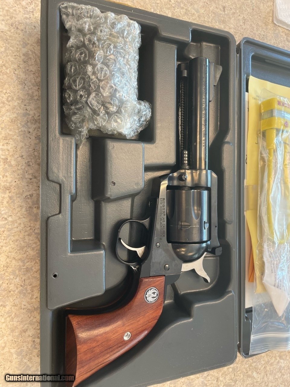 Description: Guns Listing ID: 562733 Used Ruger Blackhawk in .45ACP, comes with a extra cylinder chambered in .45LC. Original box and paperwork and a Hasting leather belt and holster. SOLD Manufacturer: RUGER Model: Black Hawk Caliber Info: .45 ACP Condition: Used - Non-Certified Barrels: 5.5 BARREL Finish: BLACK /W WOOD STOCK |
