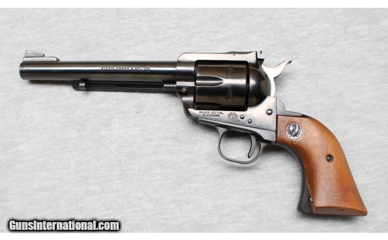 Description: Ruger Blackhawk .357 Magnum made in 1969, serial number 230-05115 with a 6.5-inch barrel, protected rear adjustable sight, 3 screw, gloss blue finish, and no transfer bar safety. Very good condition but it does have a significant chip in the left grip. .357 Magnum SOLD Metal Condition: Very Good Wood Condition: Chip in left grip Bore Condition: Bright Barrels: 6 1/2 Inches Triggers: Factory Sights: Adjustable Item Location: La Vista, NE |