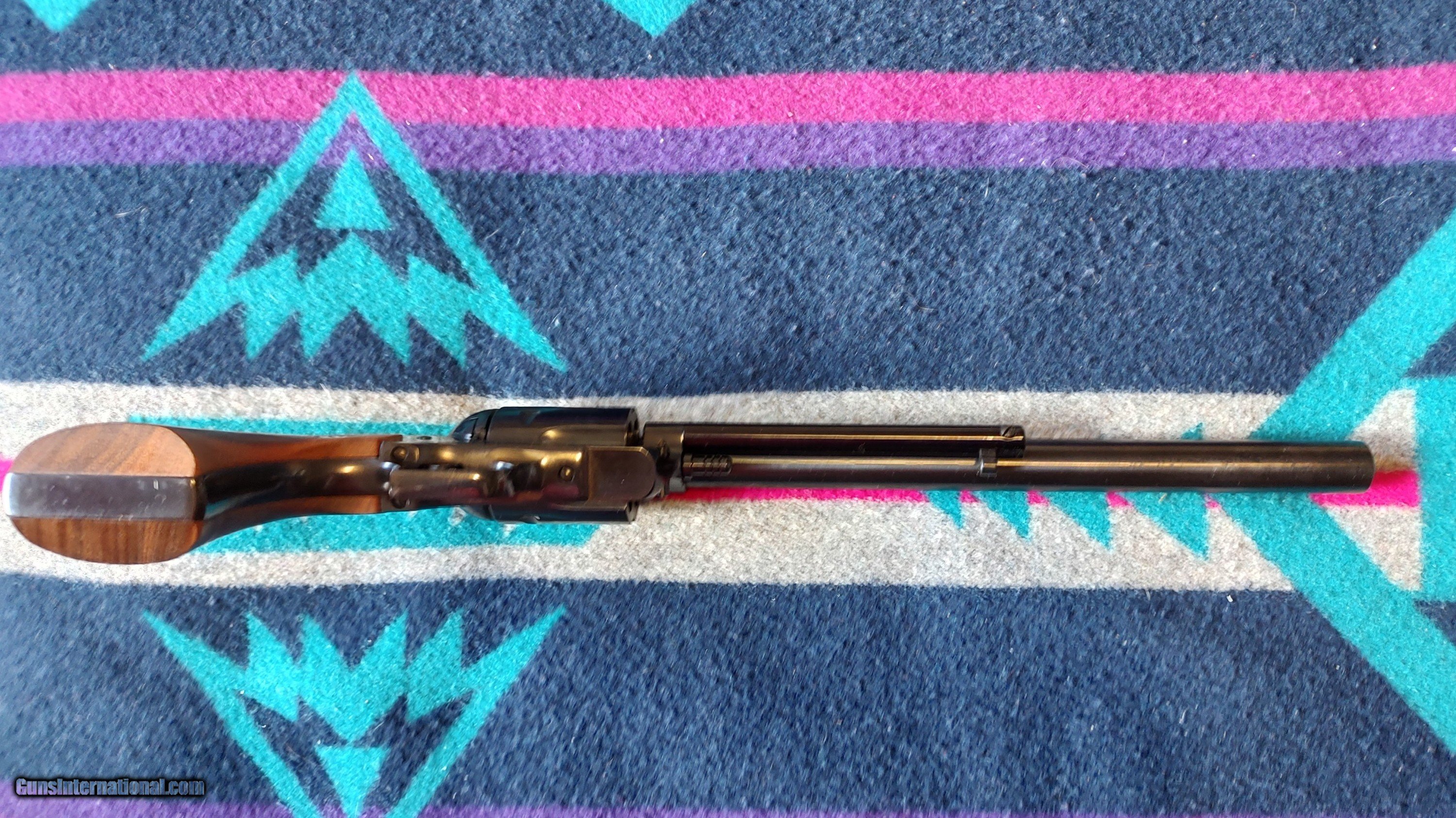 Description: Very rare Ruger 357 Maximum in the 10 1/2 inch Bull Barrel new in the original box with outer brown box. and of course all of the original papework.{ See the pictures} This is a very nice gun, bright blue, yes no turn marks on the cylinder as it has not been turned. I bought the gun new back in the day and have "Safed" it. Ruger only made these guns in this barrel length for a very short period of time. Not sure how many are out there, not many. Call for additional infor or pictures Hawkeye 316 841 8000 SOLD Handgun Caliber: .357 Remington Maximum Manufacturer: Ruger Model: Blackhawk 357 Maximum Condition: new in the box Sights: Factory fixed |