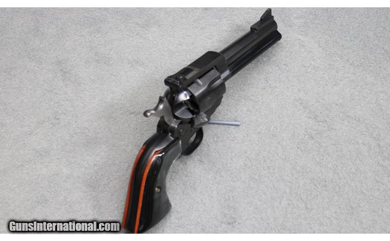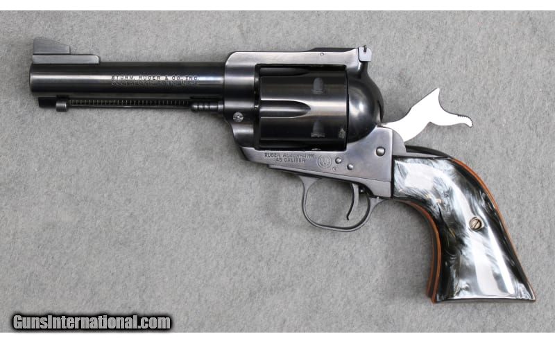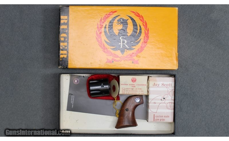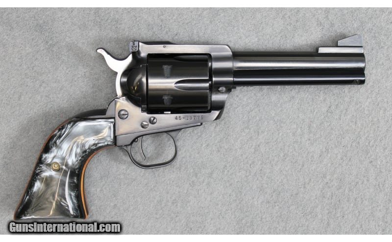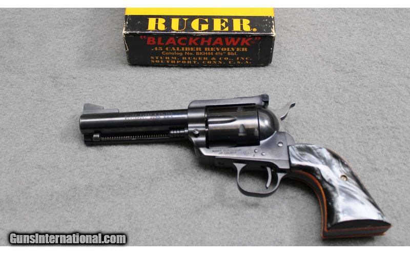 Description: Ruger Blackhawk single action revolver chambered in .45 Colt. The serial number (45-19776) indicates that the revolver was produced in 1972. Comes in its original factory box with its original grips and a second .45 Auto cylinder. .45 Colt SOLD Barrels: 4-5/8 inch Sights: Adjustable Rear Item Location: Fort Worth, TX |