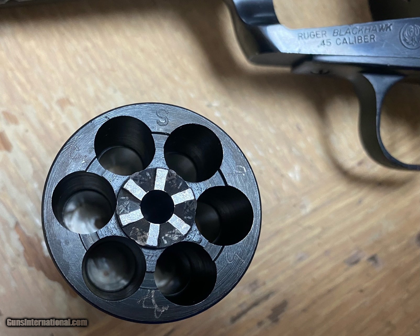 Description: Guns Listing ID: 606814 Up for sale is a Used - Excellent Condition Ruger Blackhawk Old Model 3-Screw .45 ACP 7.5\" 6rd Blued Mfg. 1972. Revolver is in an estimated 90% condition overall with light bluing wear present on the frame and internals from use. Excellent bore, tight lockup with great mechanical function overall. SOLD Manufacturer: RUGER Model: Blackhawk Old Model 3-Screw Mfg. 1972 Caliber Info: 45 ACP Condition: Used - Non-Certified Barrels: 7.5 BARREL Finish: BLUED |