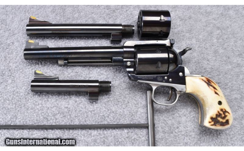 Description: Old model Ruger Blackhawk converted by Centaur Systems and United Sporting Arms to "Quick-Kit" system. Comes with 3 interchangeable barrels, 2 barrels (4 5/8" & 6 1/2") are .45 Colt and one for .44 Magnum (6 1/2"). Complete with takedown tool and both cylinders. Cylinders will only fit barrel of proper caliber and will not interchange. Rare and outstanding!!! SOLD Manufacturer: S/N 45-21XXX Caliber Info: .45 Colt - .44 Magnum Metal Condition: Excellent Bore Condition: Excellent Barrels: 4 5/8" & 6 1/2" (Ported) - .45 Colt * 6 1/2" .44 Magnum Triggers: Original - Serrated Stock: Stag Birdshead Grips Weight: 44 OZ Sights: Serrated Ramp Front with Yellow Insert - Adjustable Notch Rear Item Location: Wheeling, WV |