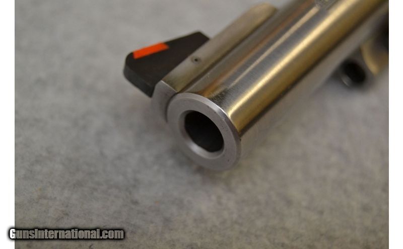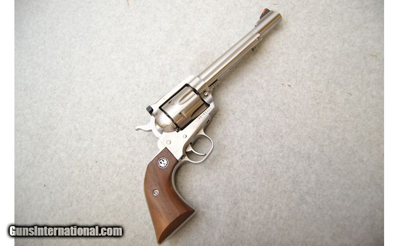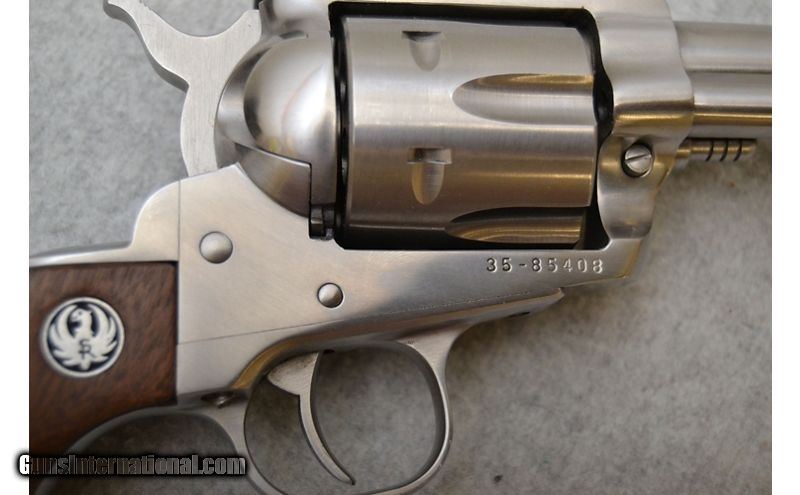 Description: Good shape overall. Some minor handling marks here and there but nothing serious. The cylinder has some milder handling marks and the expected drag line. Grips have a tiny mark or two but are otherwise clean. .357 Magnum SOLD Chambers: 6-Shot revolving cylinder. Metal Condition: Very good. Wood Condition: Grips are in good condition. Bore Condition: Very good. Has strong shine and rifling but some stubborn fouling. Barrels: 6½" Stainless steel. Triggers: Stainless steel with smooth surface. Single action only. Butt Pad: Hardwood grip panels with Ruger medallions. Weight: 2lbs 3oz Sights: Fixed ramped front blade with orange insert and adjustable rear notch. Chokes: N/A Item Location: Green Bay |