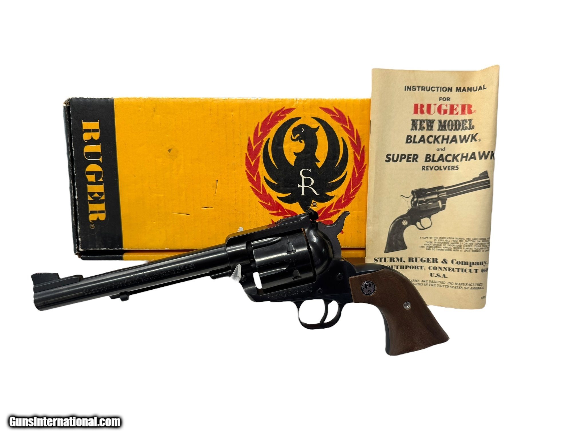 Description: Guns Listing ID: 485225 New Model Blackhawk in original box with manual. Made in 1980. Some noticeable wear on hammer as shown in photos. SOLD Manufacturer: RUGER Model: NEW MODEL BLACKHAWK Condition: Used - Non-Certified Barrels: 6.5 Gauge Info: .357 MAG Finish: black blued |