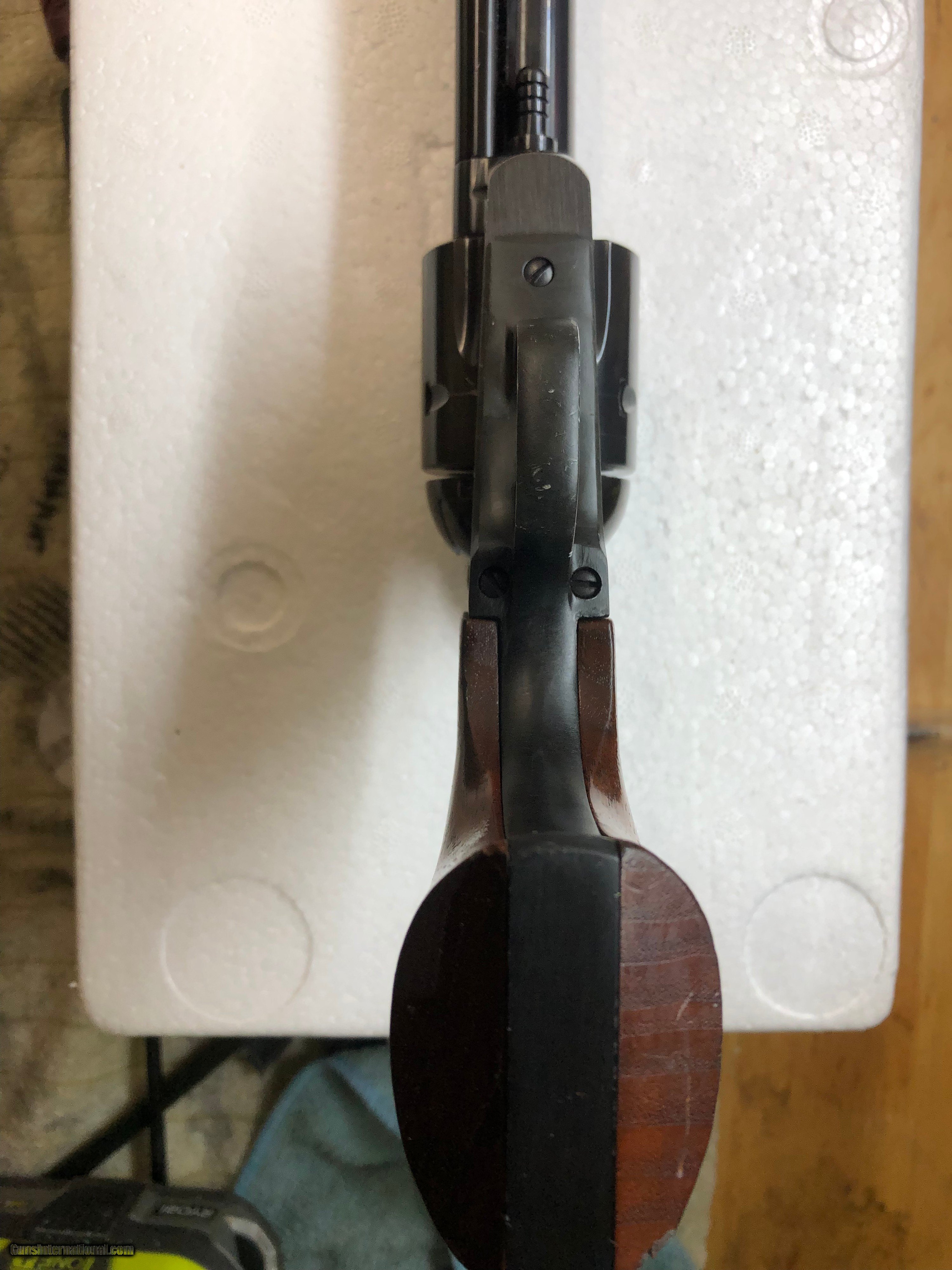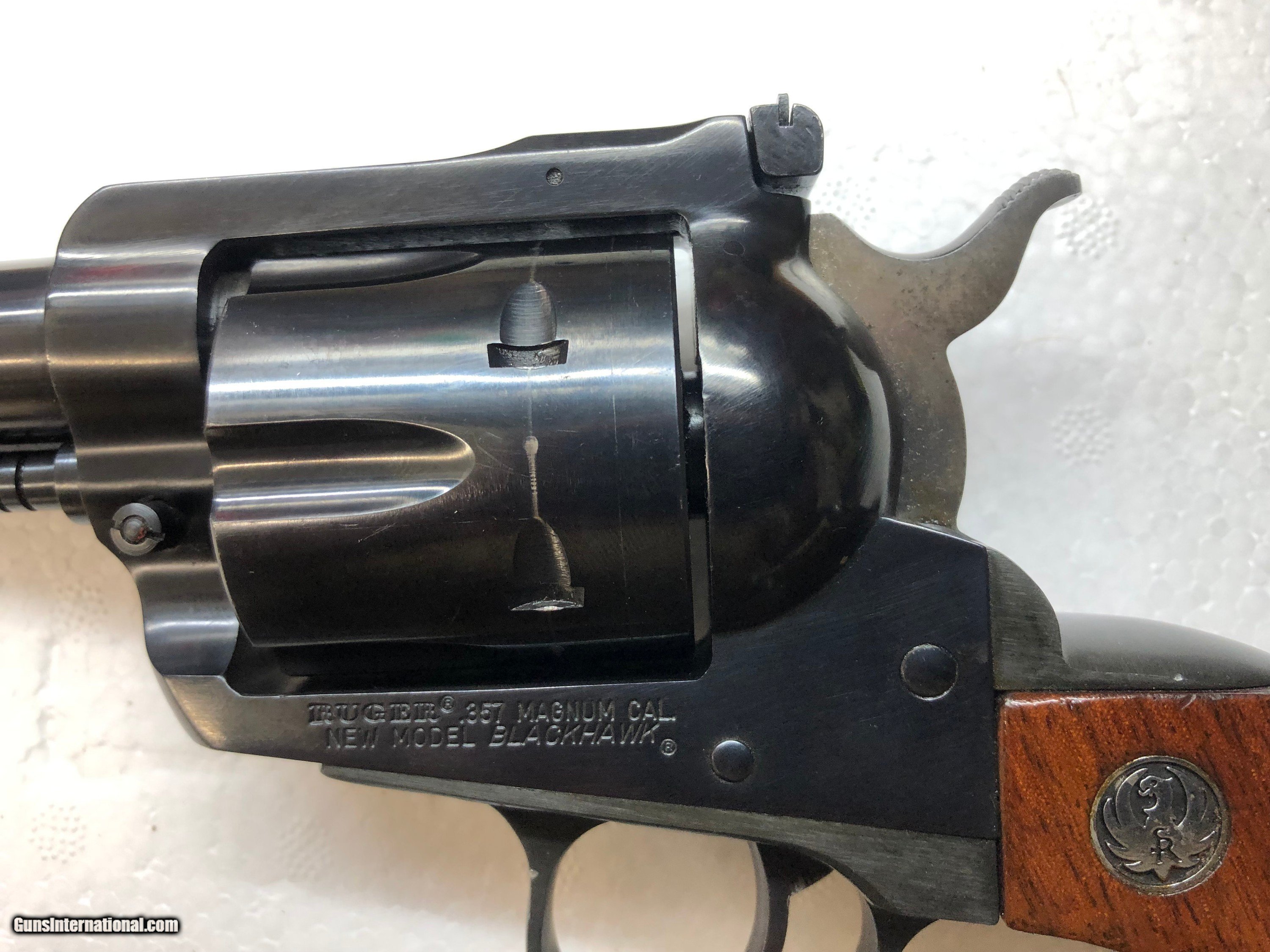 Description: SALE PENDING!!! Excellent bore. Has some scratches on the metal and the wooden grips are in good condition with a chip on the left grip at the lower bottom left. SOLD Handgun Caliber: .357 Magnum Manufacturer: Ruger Model: New Model Blackhawk Serial Number: 34-91972 Barrel Length: 4.5 Condition: Very Good Metal Condition: Very Good Wood Condition: Good Bore Condition: Excellent Triggers: SA Finish: Blued Sights: Adjustable w/Windage Manufacture Date: 1979 |
