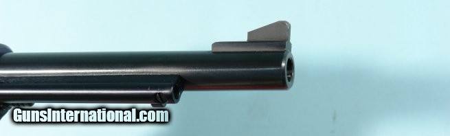 Description: RUGER NEW MODEL BLACKHAWK .41 REM MAGNUM 6 1/2" BLUE SINGLE ACTION REVOLVER WITH ORIG. BOX, CIRCA 1975. Serial number "41-054XX" and all matching including box and end label. 99% of factory original blue finish. Screws unturned. Extra nice grain wood grips. Factory sights. Only faint drag line from very minimal cycling and no signs of use. Mint bore and chambers. Original box with original manual, warranty card, wax paper and the original receipt from it's one owner dated the year it was made. He just bought it, shot it once probably and kept in safe since 1975. Prime example. SOLD |
