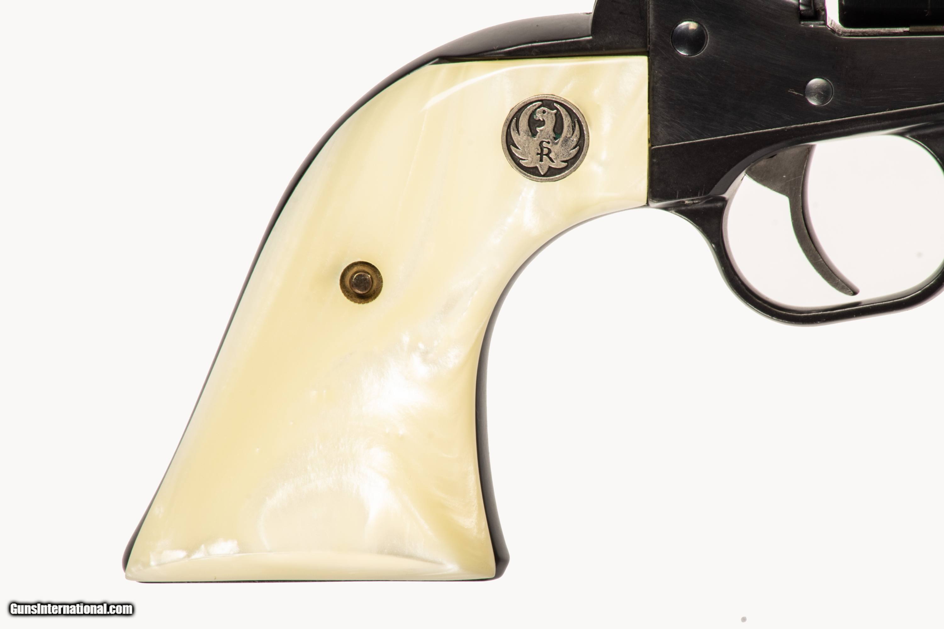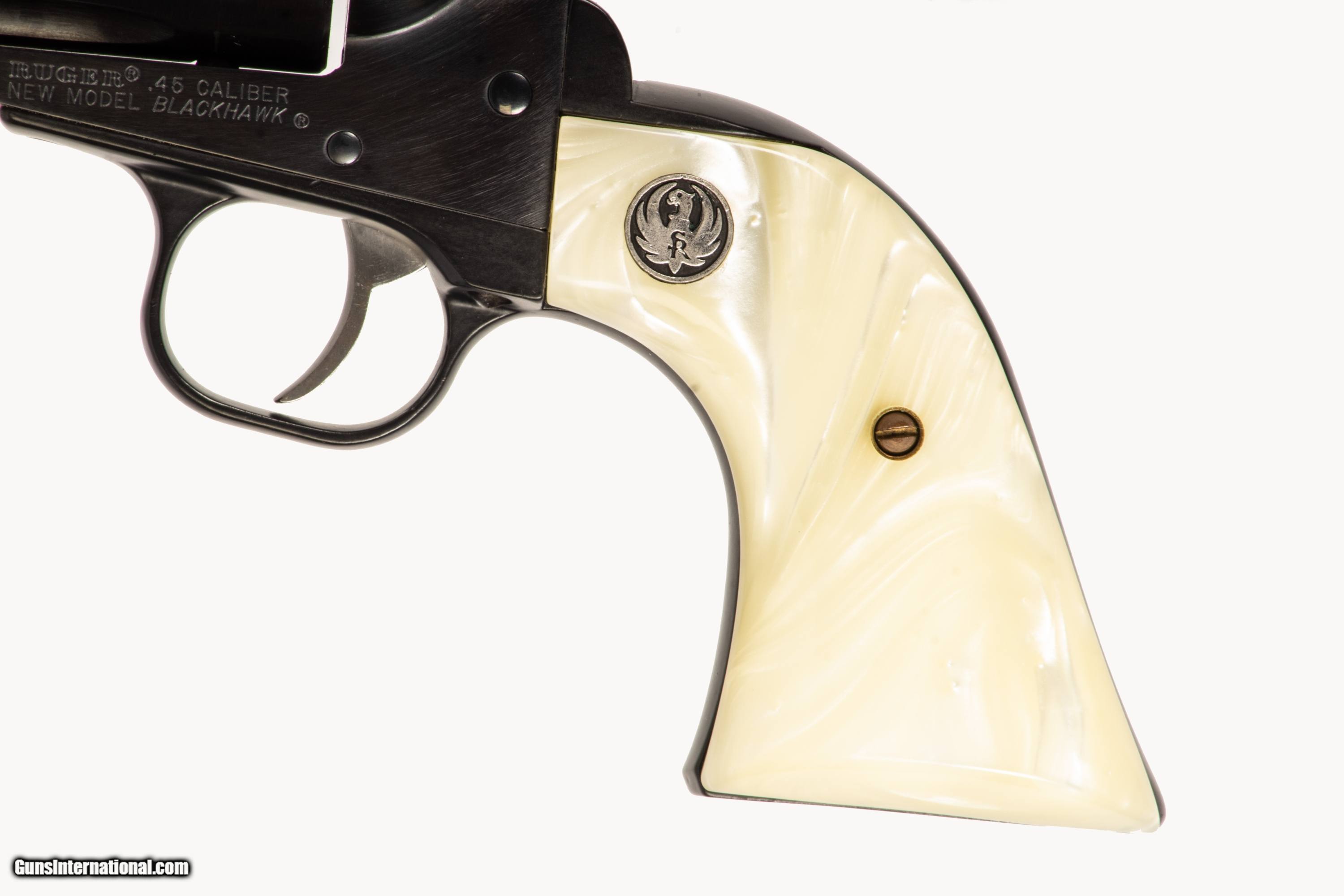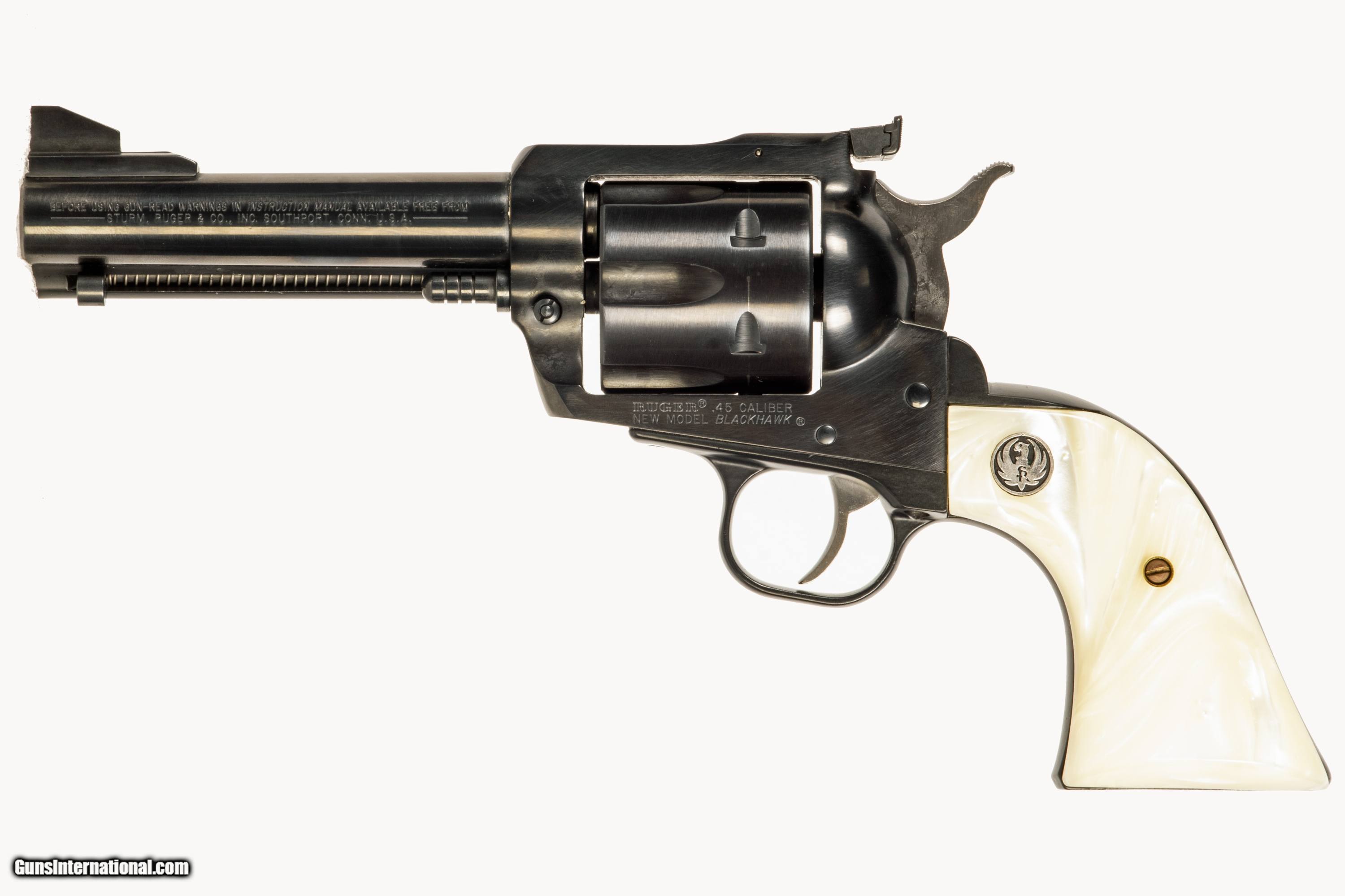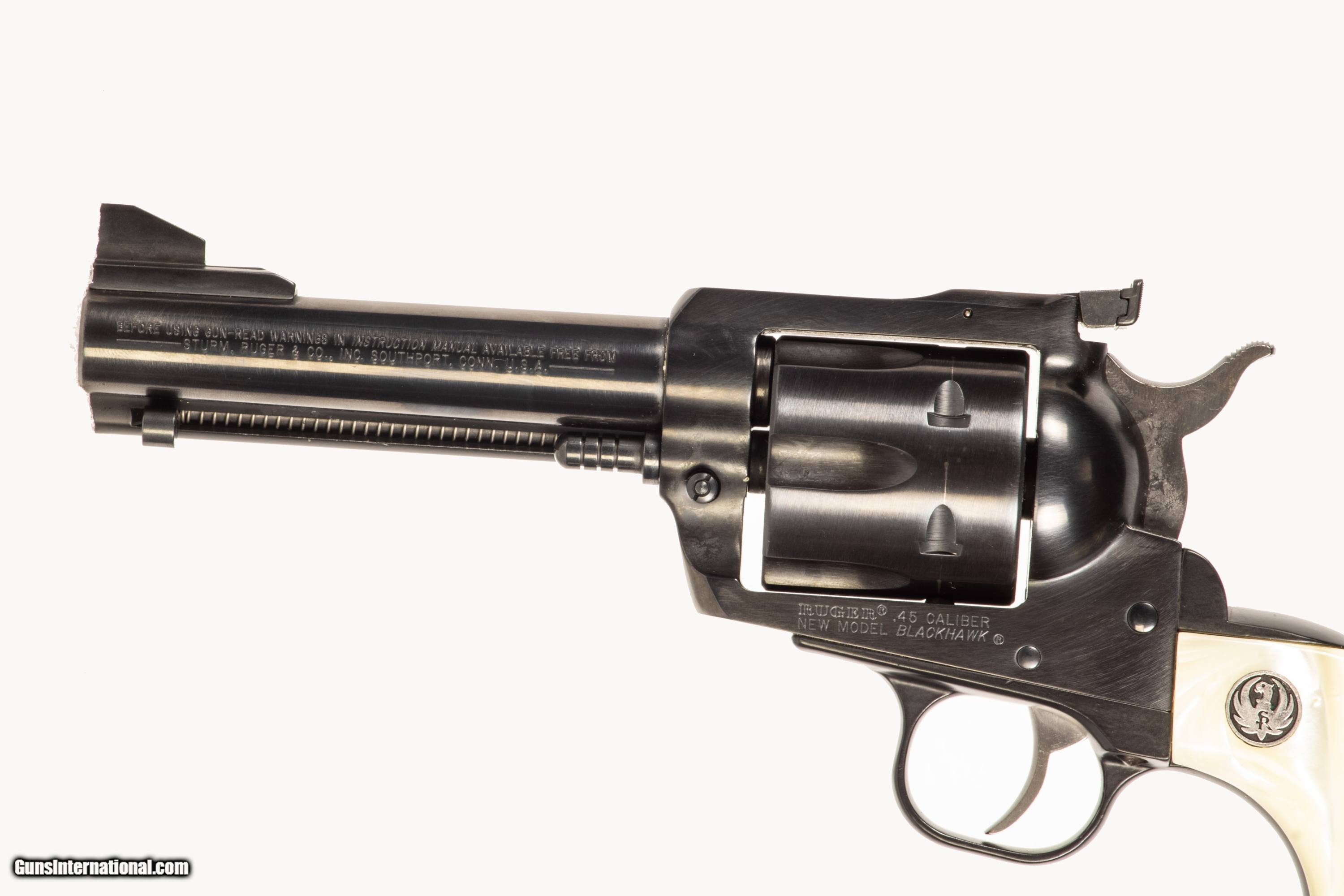 Ruger New Model Blackhawk chambered in 45 ACP/ 45Colt with a 4 1/2 inch barrel bright & shiny bore case an extra cylinder and extra grips. This is a used firearm that is in very good condition and is covered by Dury's Lifetime Warranty.