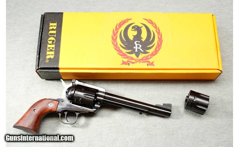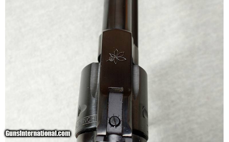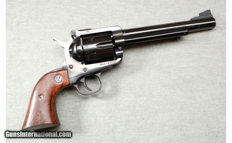 Description: No. 91 RUGER NEW MODEL BLACKHAWK BUCKEYE SPORTS CONVERTIBLE REVOLVER. Cal. 38-40 / 10mm Auto. Only 5,541 units manufacture in 1990 only (1973 to date for all New Models) as Model 06110 having catalogue designation S3840. Black anodized alloy ejector rod housing with balance of blued steel including grip frame; nicely figured dark hardwood grips having silver eagle medallions. Top strap has bee at flower symbol of Buckeye Sports Supply in Ohio. Fluted 38-40 cylinder is matching numbered. Low numbered revolver of subscription number 91 assigned to Henry Rodeschin who was a long time Ruger employee. Henry with his brother William (also a long time employee) operated Rody's Gun Shop about 1/4 mile from the Newport factory and often acted on behalf of the factory as FFL for the public. UNATTACHED ACCESSORIES: original factory yellow / black 1 piece box plus sleeve with packaging to include matching numbered fluted 10mm Auto auxiliary cylinder. CONDITION: very faint rub marks on front sight finish of right side plus upper 2/3 of backstrap has light metallic marks and faint finish loss; balance of revolver is near excellent appearing new and unfired. 10mm Auto SOLD Metal Condition: very good Wood Condition: vry good Bore Condition: bright Barrels: 6.5" barrel Triggers: SA Butt Pad: wood grips Weight: 2 lbs 12 oz Sights: ramped serrated blade sight plus cylinder frame mounted factory adjustable rear Item Location: La Vista, NE |