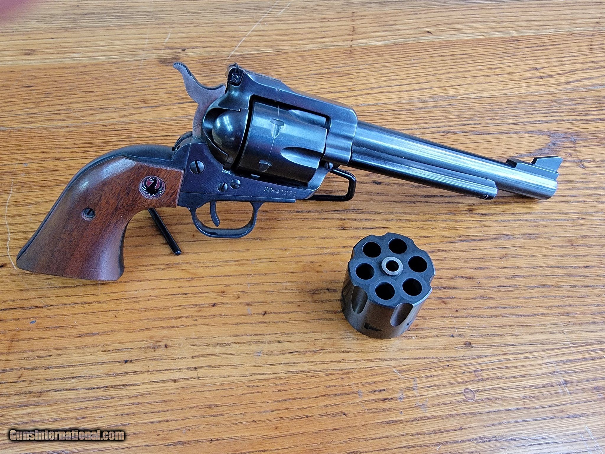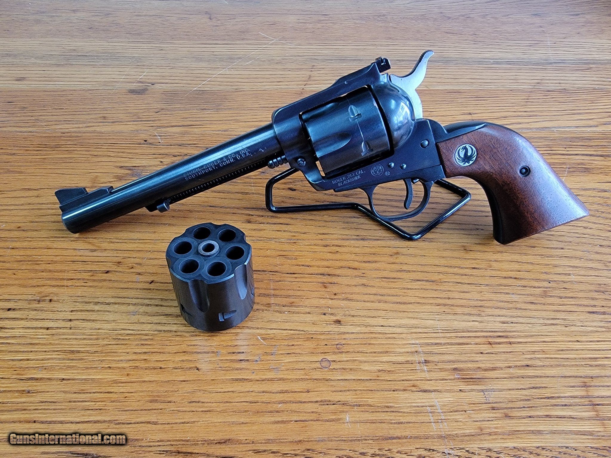 Description: Guns Listing ID: 479085 Has a few scratches on left side of barrel and very light wear spots on grip frame. Includes .357 and 9mm cylinders. SOLD Manufacturer: RUGER Model: NEW MODEL BLACKHAWK CONVERTIBLE Condition: Used - Non-Certified Barrels: 6.5 Gauge Info: .357 MAG/9MM Finish: blued |