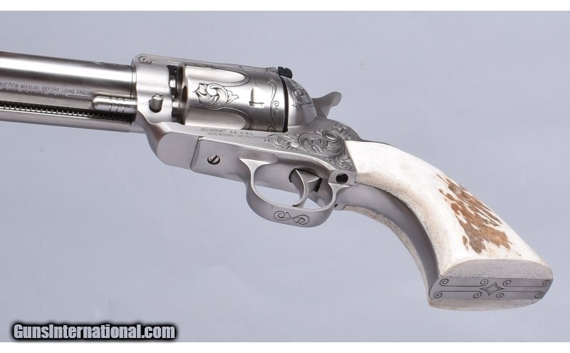 Description: Custom Ruger New Model Blackhawk. Brushed finished stainless steel, hand engraved with foliate scroll by Tyler Gunworks and offers professionally fitted Texas Stag grip panels. New with factory box and manual. .45 Colt SOLD Metal Condition: "Brushed Stainless, Engraved Bore Condition: Excellent Barrels: 4 3/4 Triggers: Single Action Weight: 42 oz. Sights: "Adjustable Rear Sight, Ramped Front Item Location: Buda, TX |