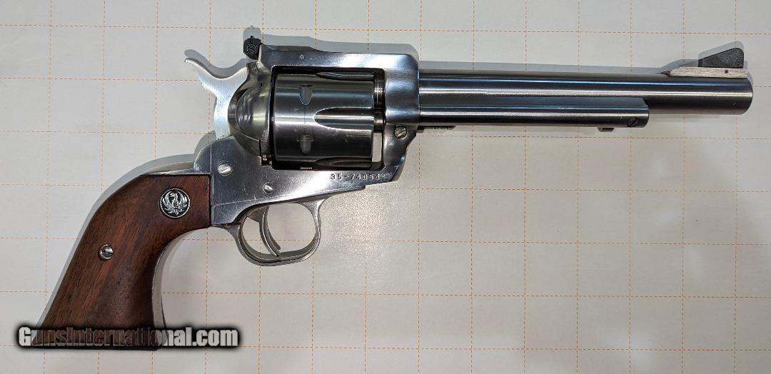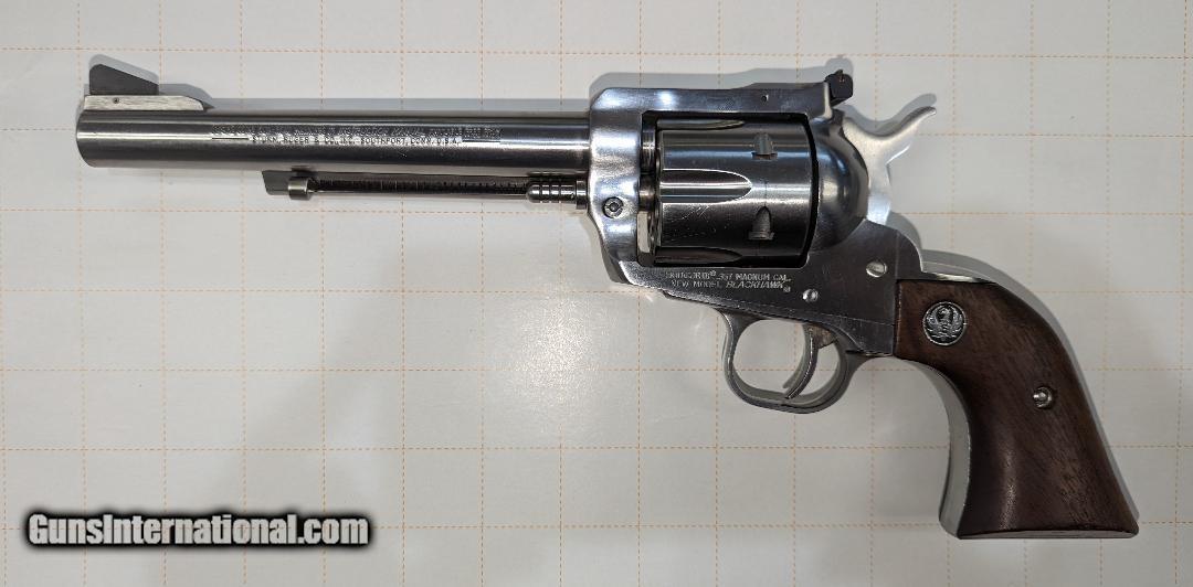 Description: Guns Listing ID: 500099 Grips: Hardwood Front Sight: Ramp Barrel Length: 6.50\" Material: Stainless Steel Capacity: 6 Rear Sight: Adjustable Twist: 1:16\" RH Finish: Satin Stainless Overall Length: 12.38\" Weight: 48 oz. Grooves: 8 Traditional western-style, hand-filling grip has long been acknowledged as one of the most comfortable and natural pointing of any grip style. Target-grade accuracy with ramp front and adjustable rear sights. Transfer bar mechanism and loading gate interlock provide an unparalleled measure of security against accidental discharge. Cold hammer-forged barrel results in ultra-precise rifling that provides exceptional accuracy and longevity. SOLD Manufacturer: RUGER Model: NEW MODEL BLACKHAWK Caliber Info: 357 MAGNUM Condition: Used - Non-Certified Barrels: 6.5 BARREL |
