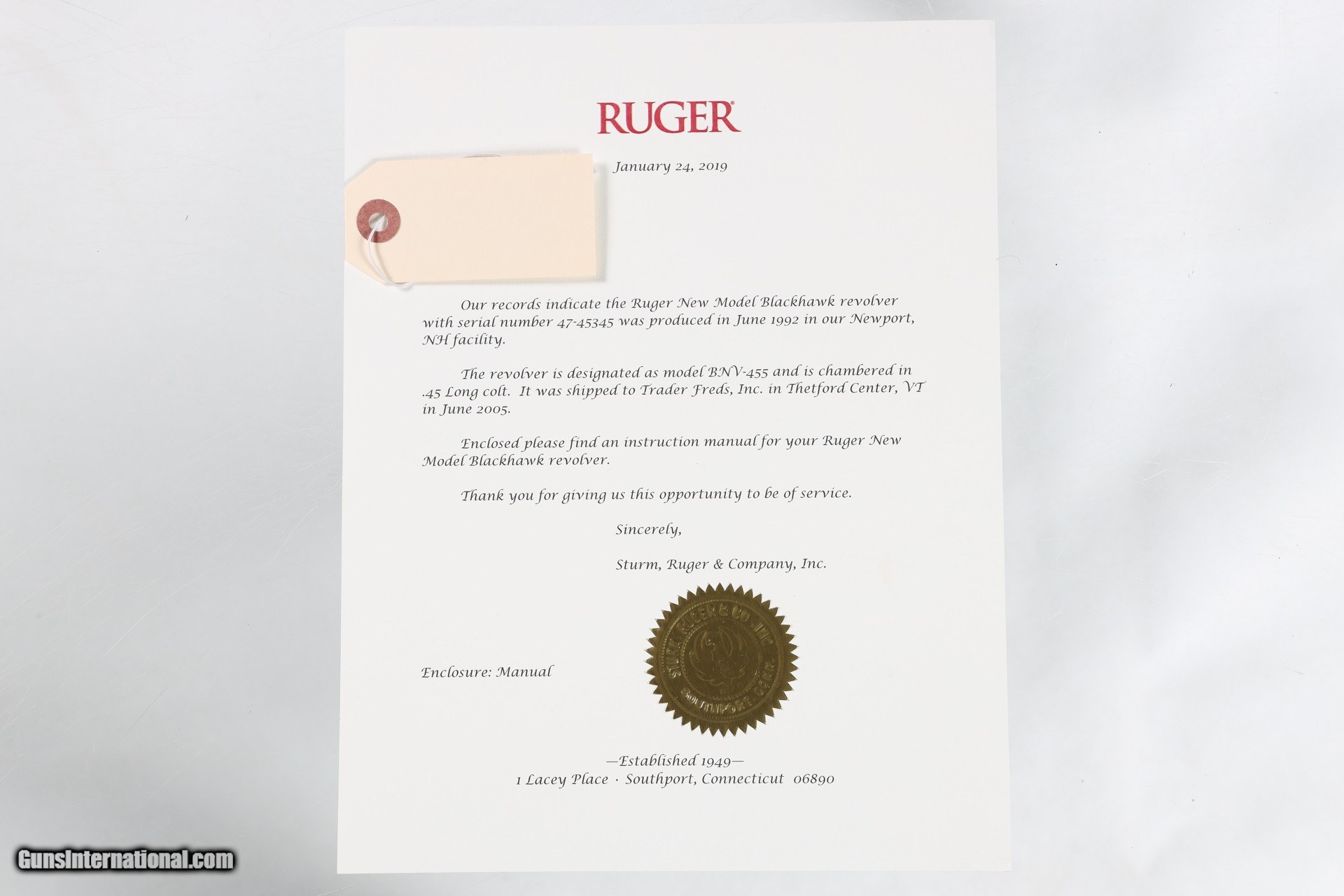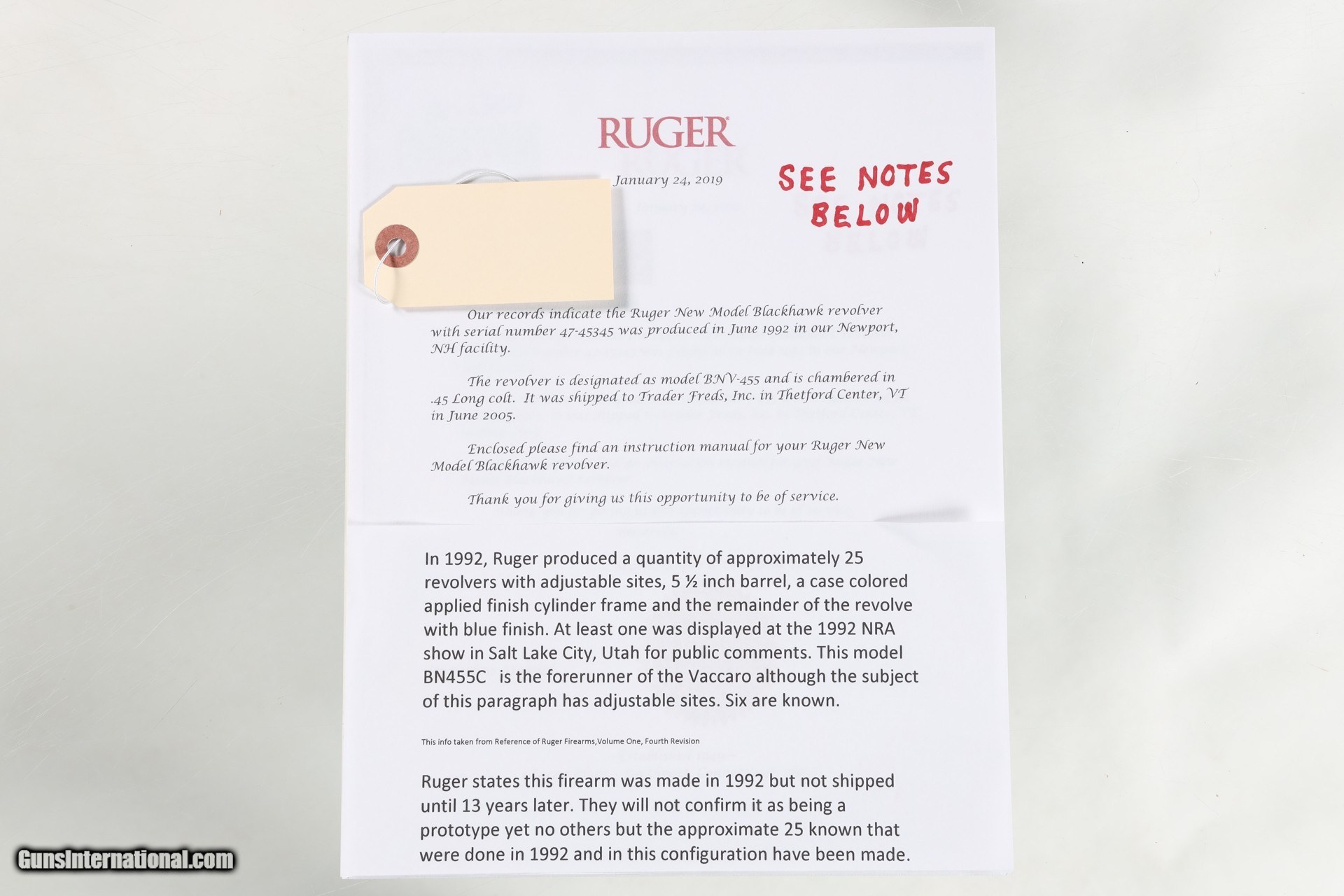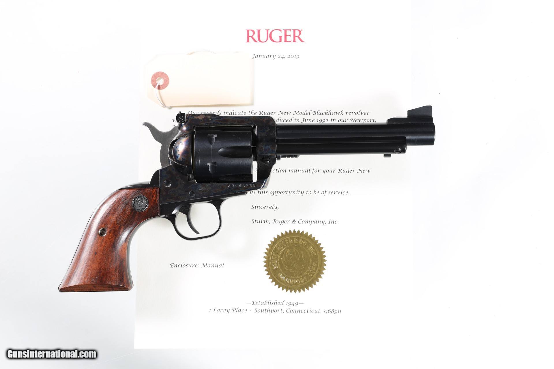Description: About excellent overall condition, appears unfired. Accompanying notes designate revolver as 1 of 25 produced in 1992 and shipped 13 years later as the forerunner to the Vaquero. • Free Shipping, No Credit Card Fees. • Lay-a-way available for this firearm. • 1/3 Down, a 1/3 in 30 Days 1/3 in 60 Days. SOLD Manufacturer: Ruger Model: NM Blackhawk Serial Number: 47-45345 |