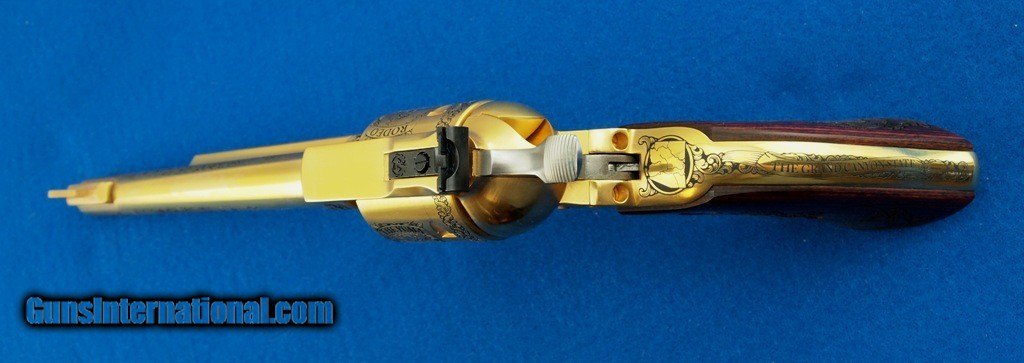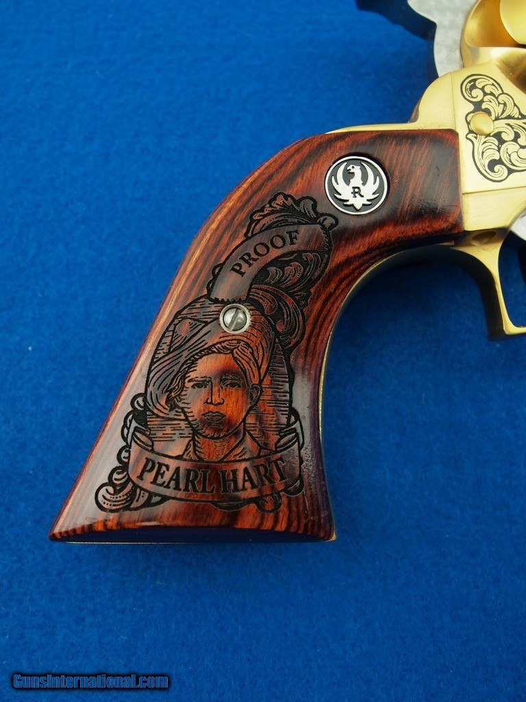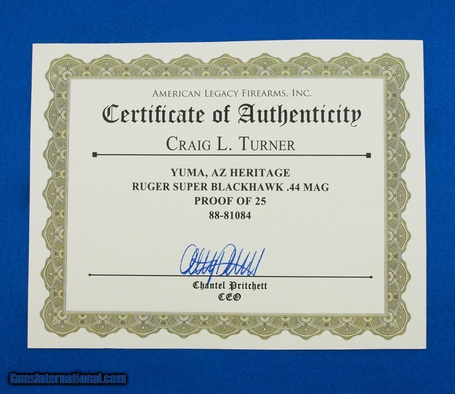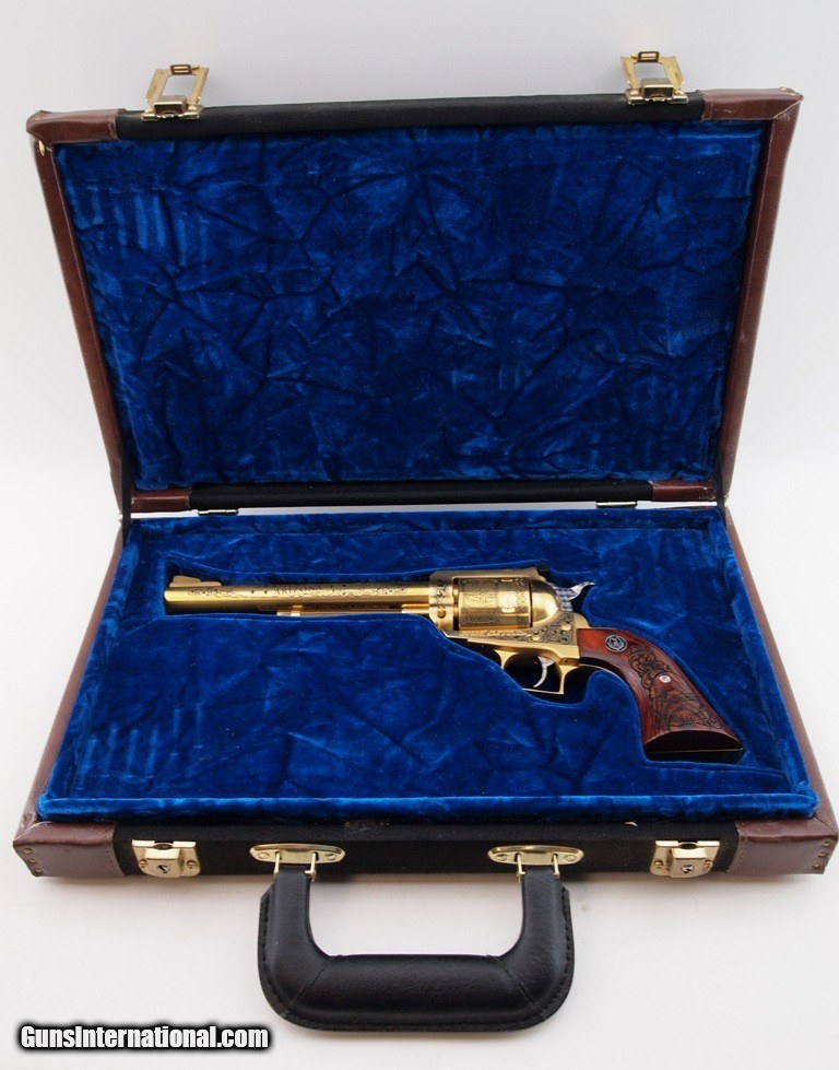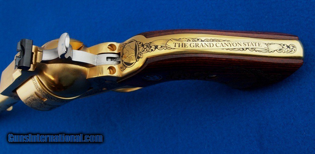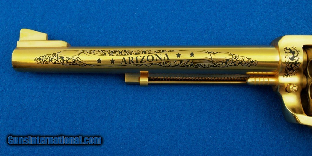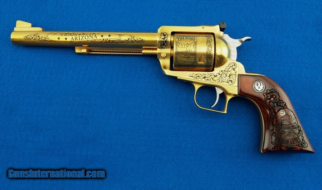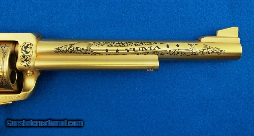 Description: Ruger NM Super BlackHawk - Yuma Custom .44 MAG, 7 1/2" bbl, gold-plated, engraved with scenes from Yuma Arizona on cylinder - scroll work on frame and barrel, jeweled trigger - hammer, and very nice engraved grips with inset Ruger medallions. Includes certificate showing the revolver is the proof of 25. This revolver will be a great addition to your collection. See pictures for an appreciation of this beautiful gun! Add 3% for Credit Card Shipping $25.00 SOLD |