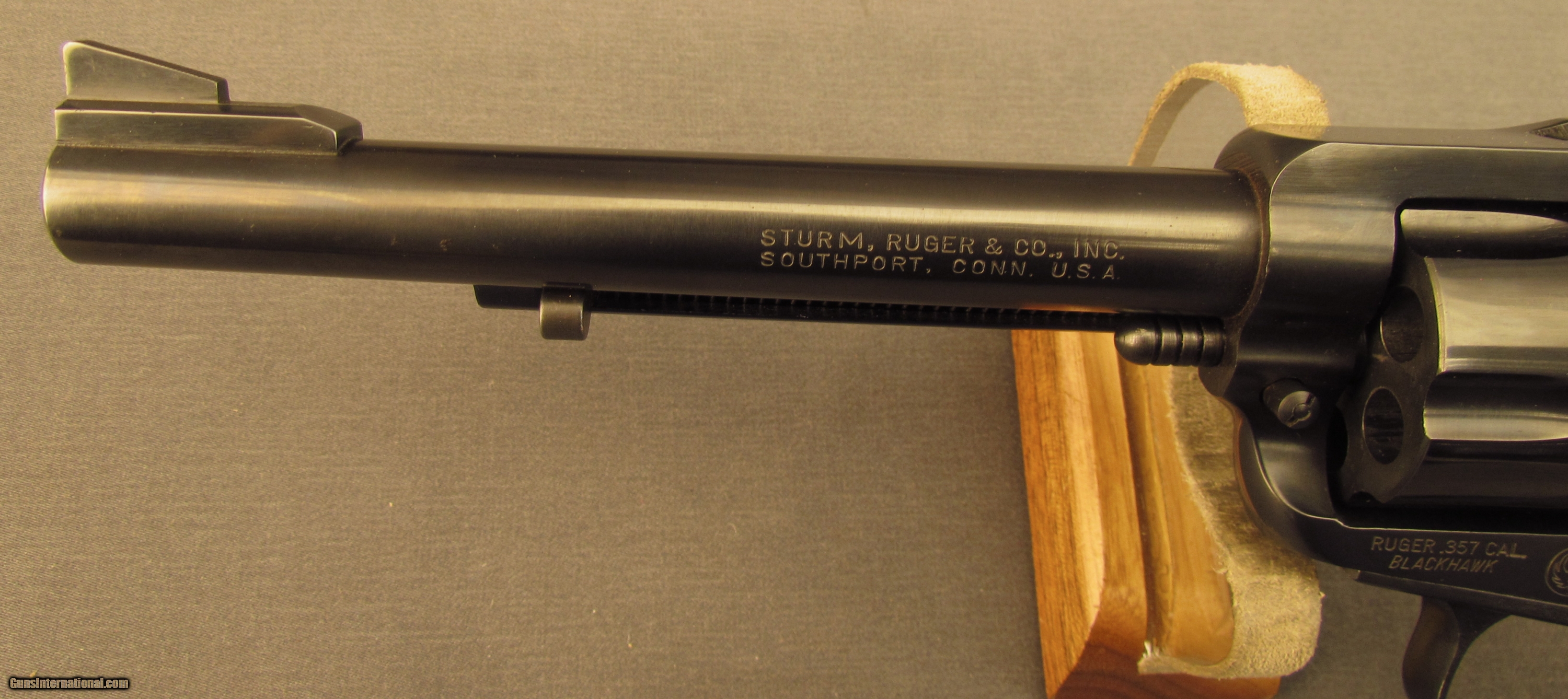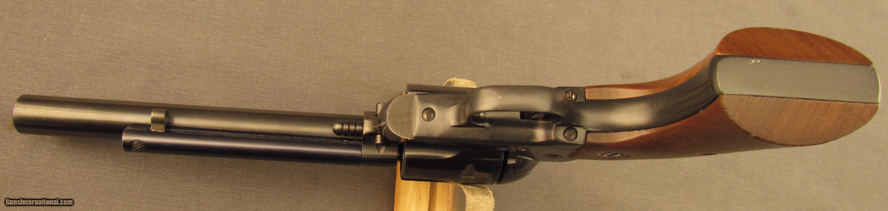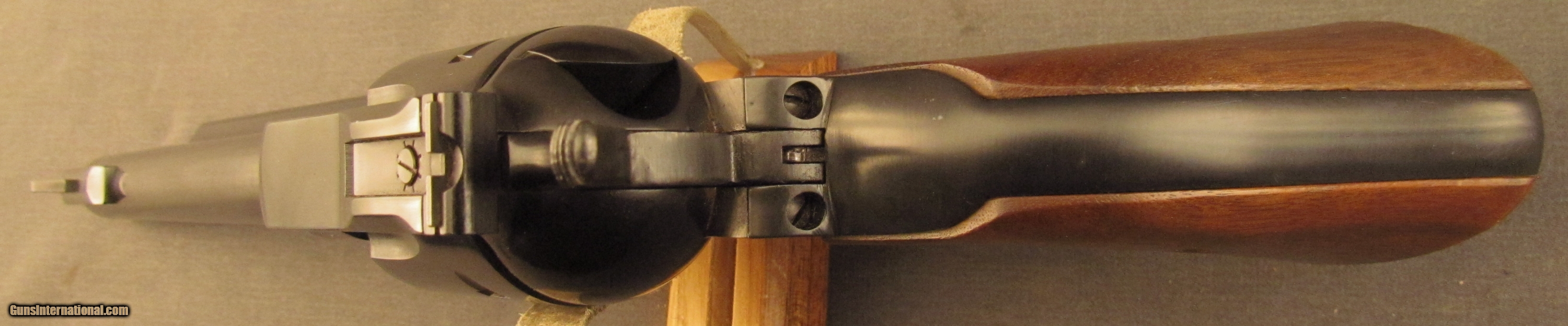 Description: S# 100972, 357 Magnum, 6 1/2 inch barrel, bright excellent bore. This 1968 manufactured revolver remains in it's original configuration without the transfer bar safety. Gun remains in excellent condition with over 96% blue showing a few bright spots on triggerguard, butt and . Grips have a couple small dings along bottom edges. Hammer sides remain bright with a few freckles of staining. Action works well and timing is correct. We recommend not carrying or using this gun with six rounds in cylinder, the chamber under the hammer should be empty at all times except when firing. FFL SOLD Manufacturer: Ruger Model: Blackhawk Serial Number: 100972 Caliber Info: .357 Mag Gauge Info: .357 Mag |