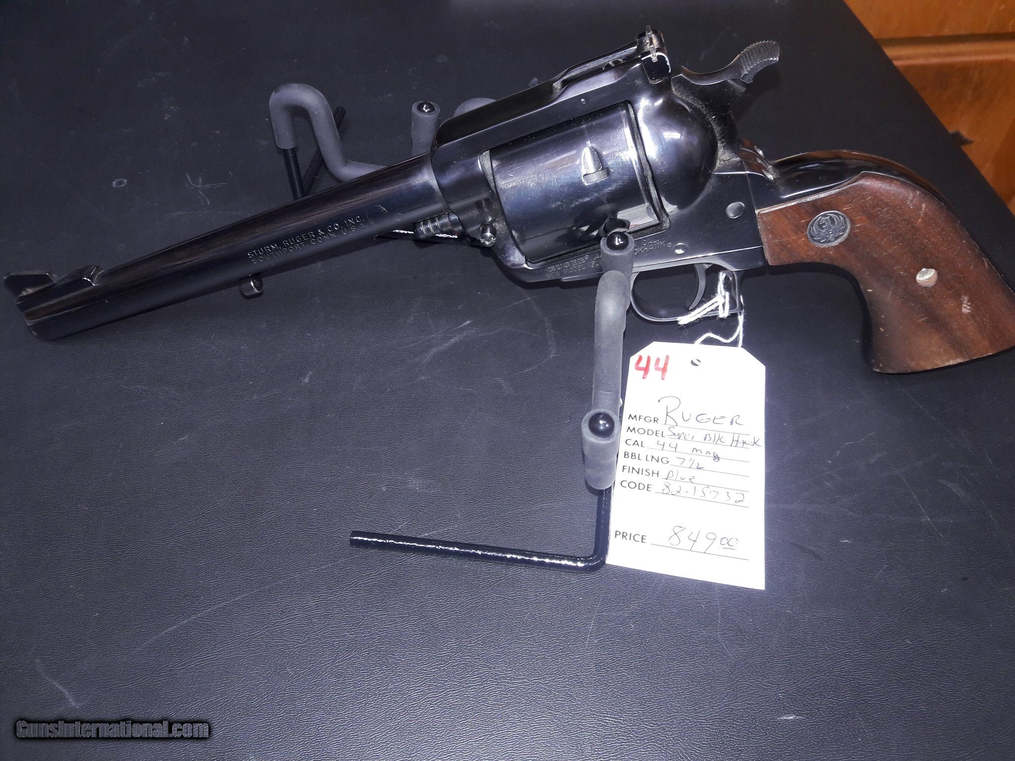 Description: Guns Listing ID: 348162 The model is actually a RUGER NEW MODEL SUPER BLACKHAWK Really good shooting gun. Has small blueing wear on rod beneath barrel. See pic. SOLD Manufacturer: RUGER Model: "NEW MODEL" BLACKHAWK Caliber Info: .44 MAGNUM Condition: Used - Non-Certified Barrels: 7.5 BARREL Action: REVOLVER Finish: BLUE Weight: not specified |