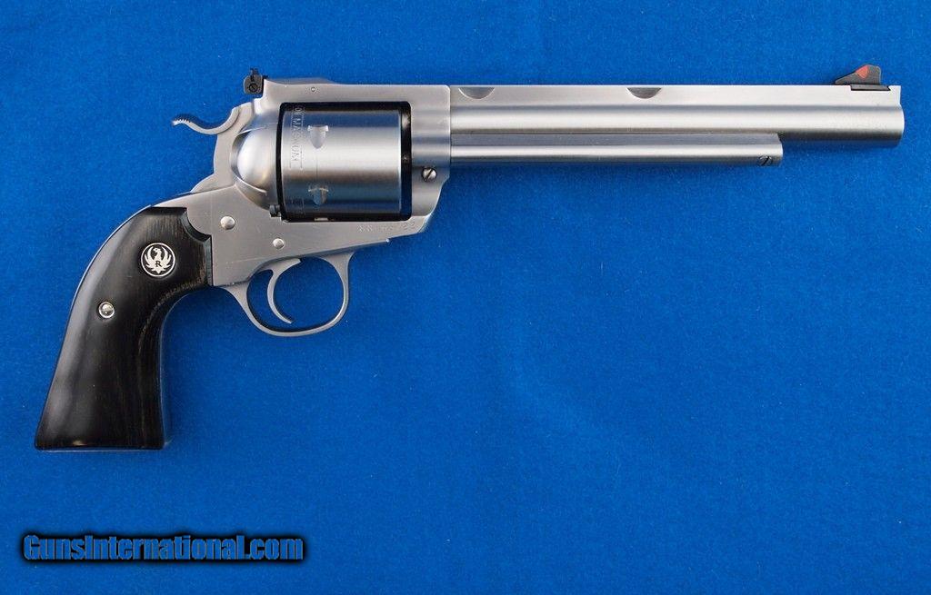 Description: Ruger Super Black Hawk Hunter .44 MAG, 7 1/2" bbl, bright shiny bore, good rifling, adjustable rear sight, ramp front sight, Stainless Steel finish, scope rings are not included, very nice Ruger smooth hardwood grips with inset Ruger medallions. Add 3% for Credit Card Shipping $25.00 SOLD |