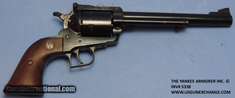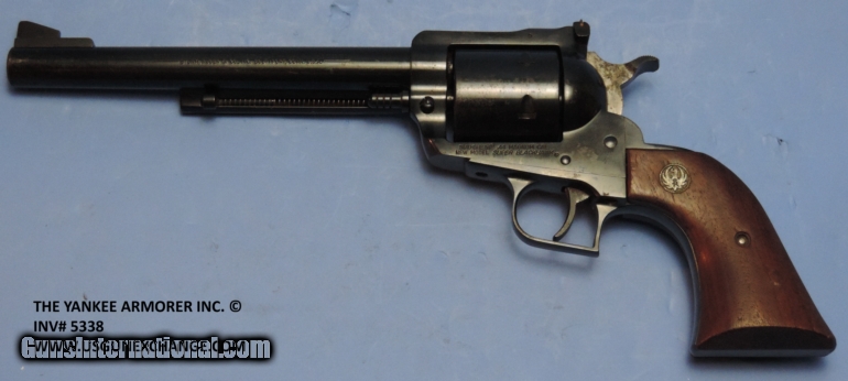 Description: Inv. 5338 Ruger Super Blackhawk, Caliber .44 Magnum, Serial Number 82-422XX, 71/2" barrel. Great gun for the guy that wants to Black Bear protector or something for around the cabin or camp fire. While the gun has had little or no use it has been stored poorly. There is some scattered pitting on the cylinder and both edges of the top strap. Also some scattered pin pricks on the hammer and elsewhere. The balance of the gun shows almost no use. The chambers are clean and the walnut grips unmarred. The adjustable target sight is also flawless with unmarred adjustment screws. The bore appears to be minty with a bright razor sharp rifling. As was mentioned the gun seems to have almost no use. So if you are not a collector, but looking for a fist full of protective power, or a cannon for the range here's the chance to get it very reasonably.....$375 To purchase this firearm or if you want to request more information contact us at: Email ckgunsymail Phone 201-512-0002 Cell 201-575-6838 FAX 201-215-4759 We accept most major credit cards. Prices shown are Discounted 3% for Cash or Check. The buyer must be familiar with all the laws governing the purchase and the ownership of firearms in their own city and state. The Yankee Armorer, Inc is not responsible for any failure to comply with or observe these laws. The Yankee Armorer, Inc will only ship after full payment and receipt of all required documents. Shipping: Add $35.00 for handguns, $45.00 for long guns. New Jersey buyers are subject to a 7% sales tax. The Yankee Armorer, Inc offers a 3 day inspection period with full refund upon return of intact firearm and in the original condition. The Yankee Armorer, Inc offers a no interest lay away program - 25% down; 25% in 30 days; 25% in 60 days; and full payment in 90 days. Any violation of this policy is subject to restocking and forfeiture of all payments. Any variation from this policy must be agreed to in advance. Unshipped Cancelled sales are subject to a 20% restocking fee. Be advised that all firearms sold by The Yankee Armorer, Inc. or the Gun Exchange, LLC (SELLER) are sold as collector’s items. They have not been fired or tested for safety and must be examined by a license gunsmith prior to use. By purchasing any item from the (SELLER), you are agreeing to hold the (SELLER) free from any damages or lawsuits of any nature. Any item left for transfer or storage will be charged to $25.00 per month, per item from the day of its receipt. Any variation from this policy must be agreed to in advance. Store hours 10:00 am to 5:00 pm Tuesday -Saturday. It's always best to call for appointment. Store 201-512-0002, cell 201-575-6838. SOLD |