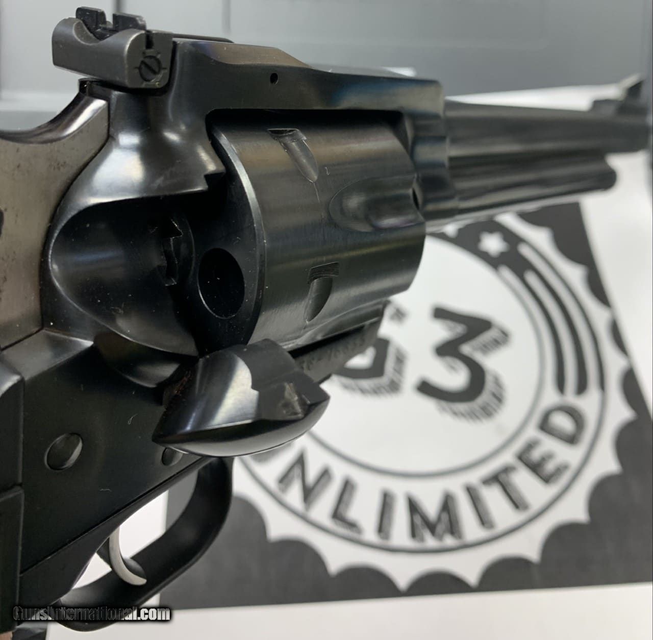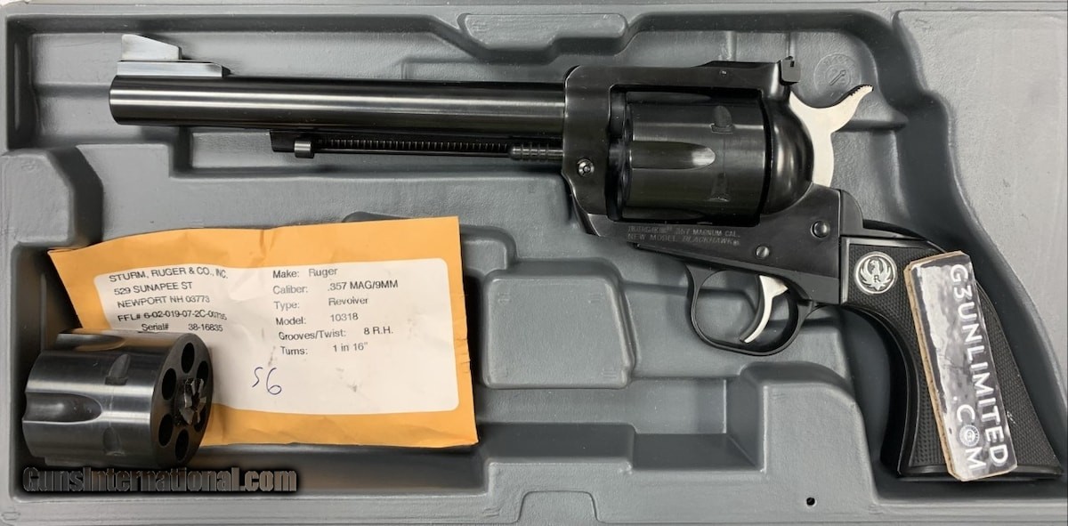 Description: Guns Listing ID: 542592 MAKE AN OFFER NOW!!! USED. EXCELLENT SHAPE RUGER & COMPANY INC Blackhawk Revolvers Ruger 6 Round Blackhawk 357 Magnum/9MM w/6 1/2\" Barrel/Blue Finish Ruger New Model Blackhawk are the most advanced single action revolvers ever made. While retaining the solid frame, feel and comfortable grip of the classic single actions, they feature Ruger‚‚s patented transfer bar ignition system with loading gate interlock and reverse indexing pawl, together with an all coil spring mechanism, adjustable sights, and frame mounted firing grip. Factor in the Ruger reliability and they are the best value on the market. SPECIFICATIONS: Mfg Item Num: 10318 Category: FIREARMS - HANDGUNS Type :Revolver Action :Single Action Only Caliber :357 Magnum Barrel Length :6 1/2\" Capacity :6 rd Safety :Transfer Bar Grips :Hard Rubber Sights :Adjustable Weight :43.0 oz Finish :Blu SOLD Manufacturer: STURM, RUGER & CO., INC. Model: New Model Blackhawk Converible Caliber Info: .357 MAG/9MM Condition: Used - Non-Certified Barrels: 6.5 BARREL Finish: BLACK |