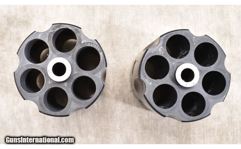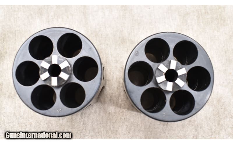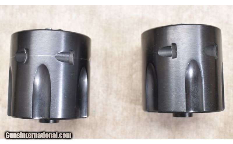 Description: Nice everyday carry, range, and light hunting revolver featuring adjustable sights, hard(ish) black rubber grips, and target type sights. It is chambered in .45 Colt and .45 ACP. .45 Colt SOLD Chambers: 6 rounds Metal Condition: "Very good. Firing residue on face of both cylinders, light turn line on the .45 Colt cylinder. Virtually no line on the .45 ACP cylinder. Wood Condition: Very good. Bore Condition: Shiny and bright with good rifling. Barrels: 4-5/8 inch Triggers: Factory single action only. Butt Pad: Pacmayr Presentation black rubber grips Weight: 39 oz Sights: Serrated ramp and adjustable notch 'iron' sights. Item Location: Rogers |