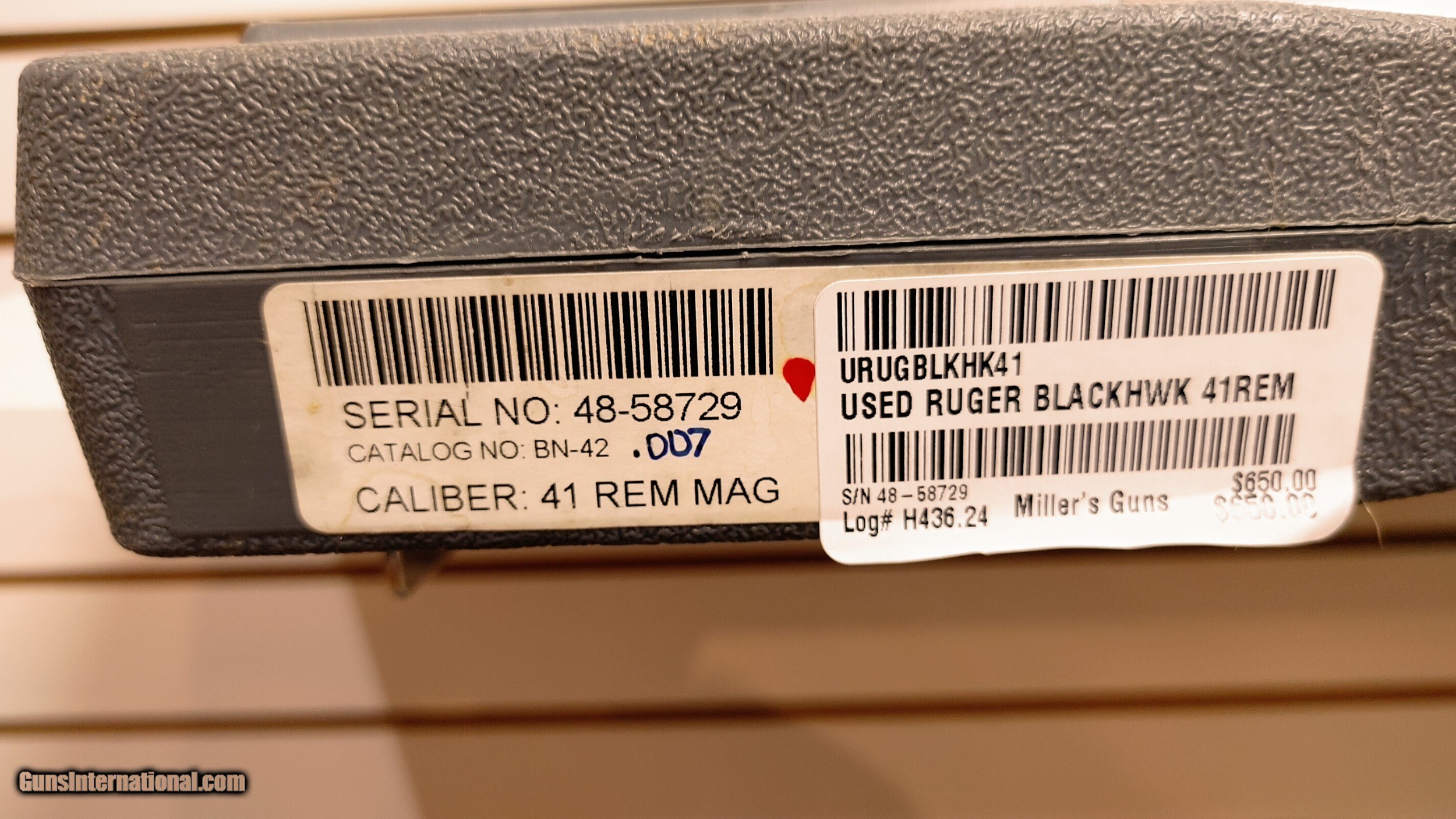 Description: Used Ruger Blackhawk 41 rem mag 6 1/2" barrel original box manuals Buyer pays shipping Millers Gun Center Located in New Castle, Delaware "Home of TAX-Free shopping" No Credit Card Fees SOLD Serial Number: 48-58729 |