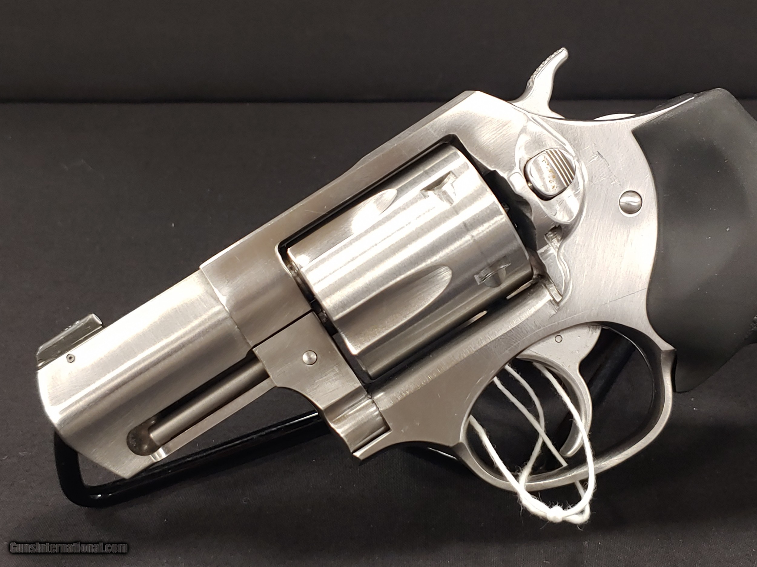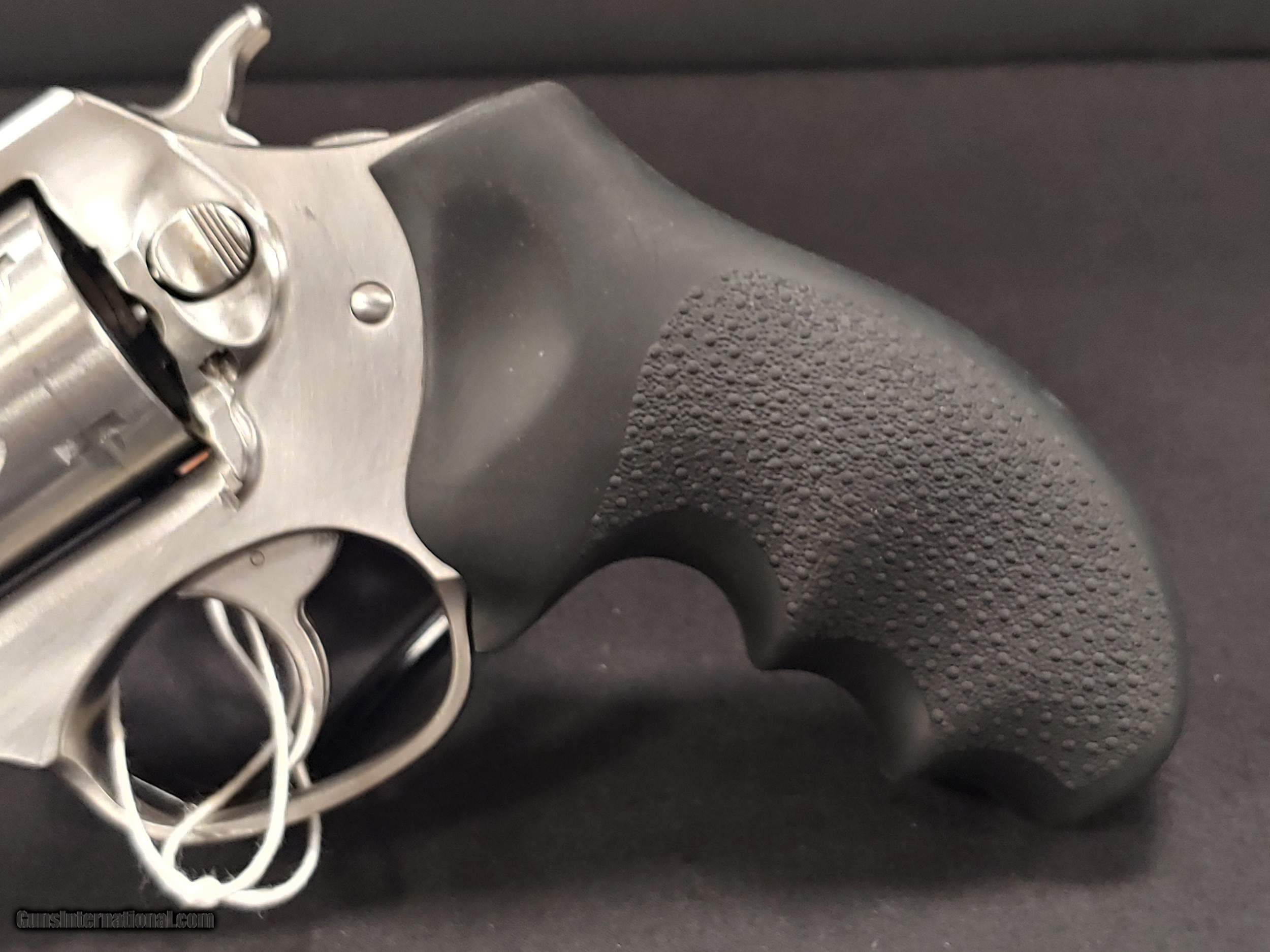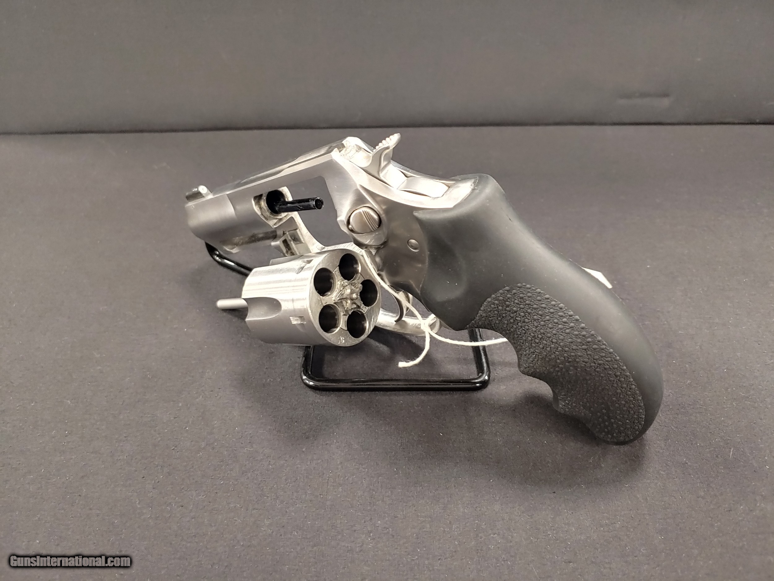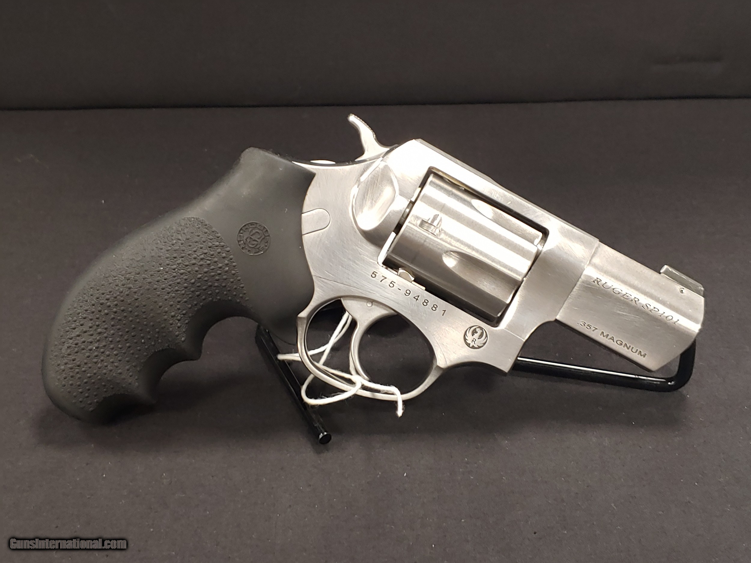 Description: Ruger® SP101® provides magnum firepower in a small-frame Double-Action Revolver meant for concealed carry. Built with a solid stainless steel frame, with extra metal where it's needed, the SP101 also serves well for field carry while fly-fishing or backpacking in the backcountry. The angle of the SP101's peg-style grip frame, with its cushioned rubber grip that has no exposed metal in the backstrap, makes shooting the sidearm comfortable and extremely controllable for a gun of its size. To withstand recoil from heavy 357 loads, a triple-locking cylinder is locked into the frame at the front, rear, and bottom so it stays aligned without getting sloppy over time. The Ruger SP101has a smooth double-action trigger pull, and a clean, crisp break in single-action. The low-profile front sight of the SP101 facilitates drawing the sidearm from a concealed carry holster or pocket without snagging, and is pinned to the heavy top rib of the barrel, making it simple to replace. The rear sight is milled into the solid topstrap, and will never get knocked out of alignment or interfere with drawing the weapon when the shooter is in a hurry. The solid frame of the SP101 has no side plate, and the revolver disassembles into integrated subassemblies with no tools, aiding to ease of maintenance in the field. As with all Ruger Double-Action Revolvers, the SP101 features the patented Ruger transfer bar mechanism that provides an unparalleled measure of security against accidental discharge—the revolver can be dropped directly on its hammer and will not fire without the trigger being pulled all the way to the back. The Ruger SP101 Double-Action Revolver is a solidly built sidearm that you can count on in both urban and outdoor environments. Made in USA. Gun has some scratches on the side but is in otherwise good condition.