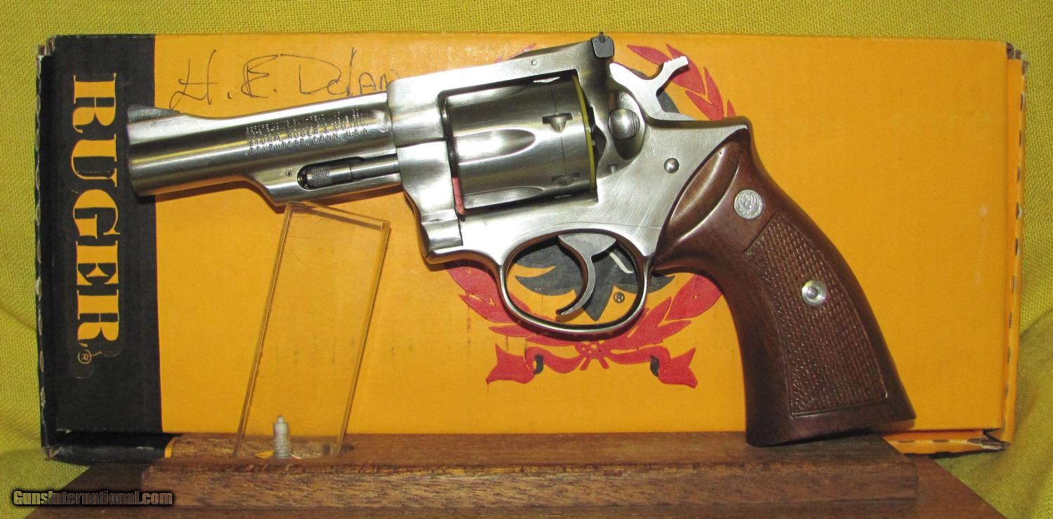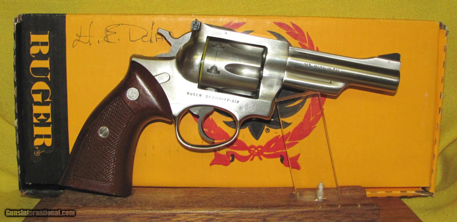 Description: RUGER model SECURITY SIX in .357 MAGNUM CAL., with 4" barrel. Color STAINLESS STEEL. RUGER MODEL SECURITY SIX, BORE EXCELLENT, RUGER WALNUT CHECKERED TARGET GRIPS EXCELLENT, 98% FACTORY FINISH, FACTORY BOX, (NO LABEL). OUR NEW STOCK # D31468 Condition 97%. Serial number 155-79664. SOLD |