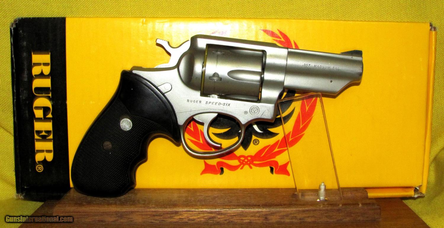 Description: RUGER model SPEED SIX in .357 MAGNUM CAL., with 3" barrel. Color STAINLESS STEEL. RUGER MODEL SPEED SIX, MIRROR BORE, EXCELLENT RUGER FINGER GROOVE RUBBER GRIPS, SLIGHT CYLINDER DRAG OTHERWISE 97% FINISH, FACTORY BOX (NO LABEL). OUR NEW STOCK # D31467 Condition 97%. Serial number 162-20907. SOLD |