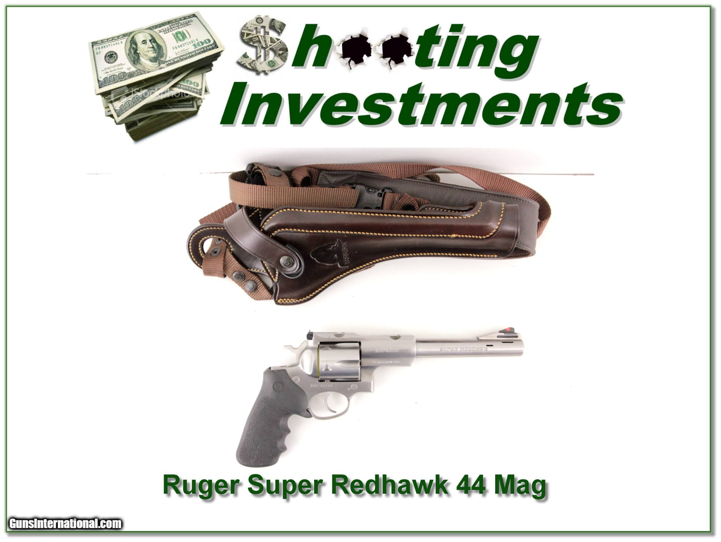 Description: This is an excellent condition Ruger Super Redhawk 44 Magnum. It is stainless with a 7.5in barrel. It has only very light use and comes with the high-end shoulder mounted holster as seen. I am selling this one on consignment and as such lay-a-way can’t be used. It does of course have the standard 3-day inspection. Shipping with insurance is $39. Please email me with any questions or larger pictures. (Consign your quality firearms with Shooting Investments for only 12%! Let me know if you have any you would like to sell!) 19-1383 Payment: Payment is by Money Order, Cashiers Check or Personal Check. I can now also accept MasterCard and Visa with a 3% convenience fee. PayPal can be used for some items but never firearms. Please let us know if you would like to pay via PayPal. Shipping: The shipping charge will be listed in each description. It is $39 for most long guns and $29 for most handguns. Some heavy guns or those insured for over $2000 will be higher. Shipments to Alaska and Hawaii are higher because air shipment is required. Most firearms are shipped on Tuesday and Thursday and usually in 5 days of receipt of payment. We package all shipments carefully and insure them. For long guns you can purchase a new Plano case for $19. They now cost us $22 when buying 100 at a time. Optics are shipped Priority Mail and most other non-firearm shipments are shipped First Class. Returns: Our return policy is simple. If for any reason you are not pleased with your purchase, you may return your item for a full refund of purchase price. Ammunition cannot be returned. It is important to us that you are happy. Guns cannot be fired or dissembled before returning them and they must be returned in the same condition as received. Notification of a return must occur with-in 3 days of receipt at your dealer. Shipping, convenience and dealer fees are not refundable and are the responsibility of the buyer. Lay-a-way: If needed, we offer a 60 day lay-a-way option on most firearms. It is 1/3 now, 1/3 in 30 days and 1/3 in 60 days. Lay-a-way firearm sales are final and if not completed the first payment cannot be returned. Consigning your firearms with Shooting Investments: We will help you get top dollar for your firearms. While most local guns shops charge 20% or more, our fee is only 12% with a minimum of $75. At your local gun shop it might take months to sell. Selling on-line provides instant access to thousands of interested buyers. You won’t find any other on-line dealer willing to sell your firearms for only 12% or listing every gun on 3 separate s. Selling through an House typically costs the seller 15% and the buyer an addition 15% (so 30%) and you have to wait several months to sell and longer to receive funds. If properly priced, we will sell your firearms in a few weeks. Send us an email or give us a call and we’ll explain how easy it is for you to get top dollar. Trading: Trading for use is really just buying your gun to re-sell. If you have a gun you want to trade, please email a picture and we will let you know what we can give or it. You will always get more if we sell it for you on consignment. Help for California Buyers: We are happy to ship to California. It is the buyer’s responsibility to make sure any item you buy is legal in your state. We are also happy to help with your purchase of a firearm from someone other than us. If you see a gun you would like to buy but the seller can’t or won’t ship to California they can ship to use and we’ll then ship it to your California dealer. The cost for this service is only $30 + shipping. Let us know if we can help! SOLD |