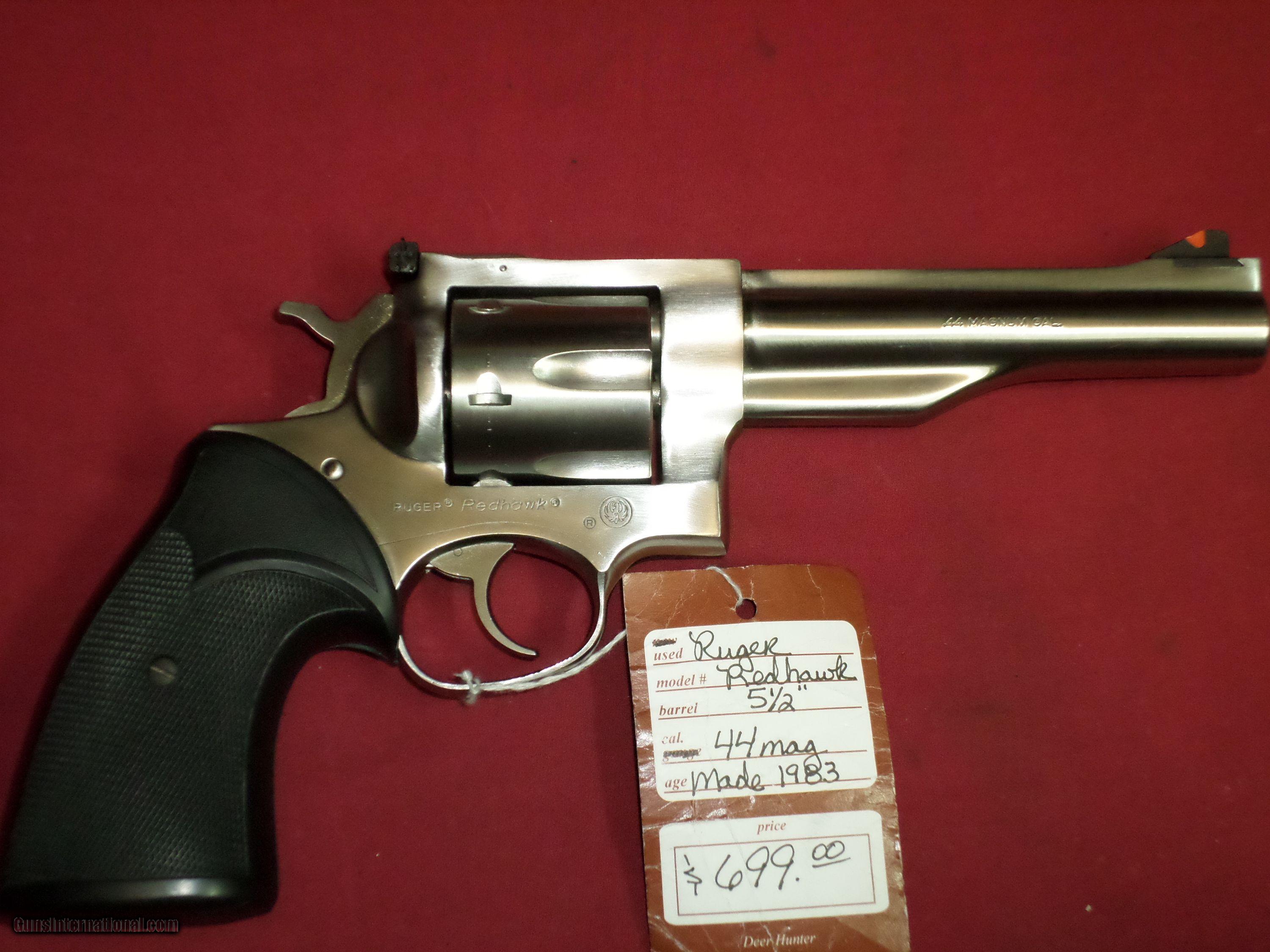 Description: SOLD For sale, Ruger Redhawk, stainless steel, 5.5", Excellent condition, with Pachmyer Signatire grips. Circa 1983 To see more of our inventory, visit deerhunterguns,com We collect 7% sales tax for Florida sales. We accept MC, Visa and Discover, no AmEx. No Sales to California. Shipping to lower 48 is: Handguns= $30 (USPS Priority) Long guns= $40 (UPS Ground Ins.) Like us on Facebook: Deer Hunter Guns SOLD |