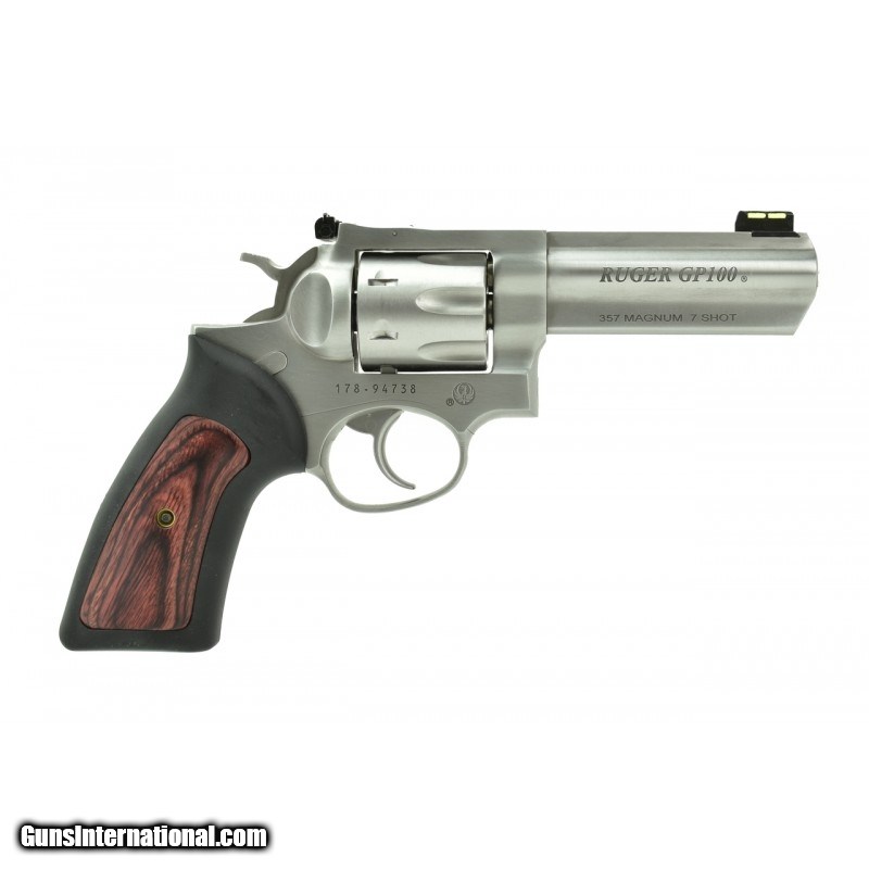 Ruger GP100 .357 Magnum caliber revolver. 4" Stainless revolver with 7-shot cylinder and green fiber optic sight. Excellent condition.