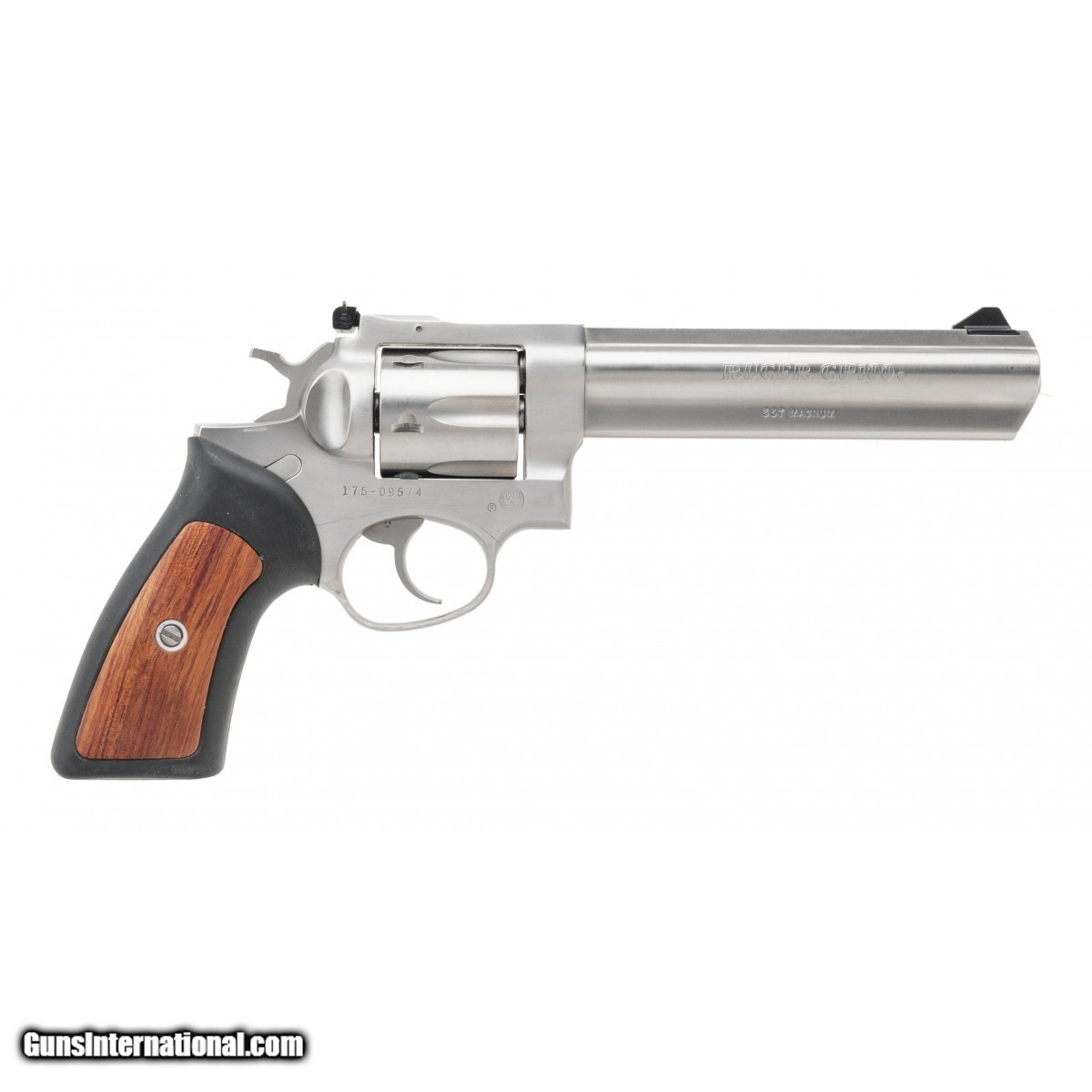 Description: " SN: 175-09574. Modern Production. .357 Magnum with a 6"" barrel. Bore is excellent. Stainless steel revolver with adjustable rear sight, and rubber grips with wood inserts. Overall condition is excellent with case. SOLD |