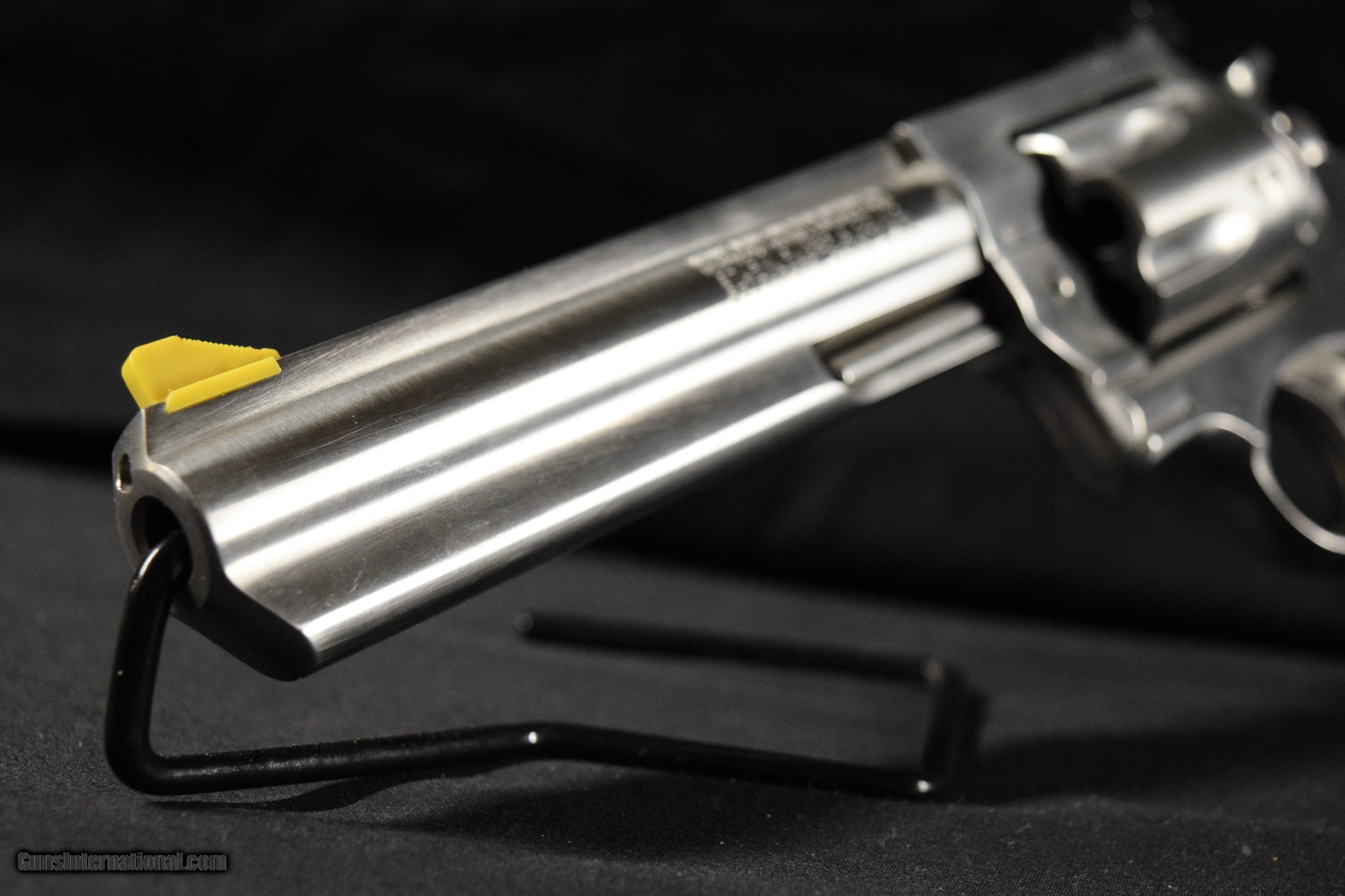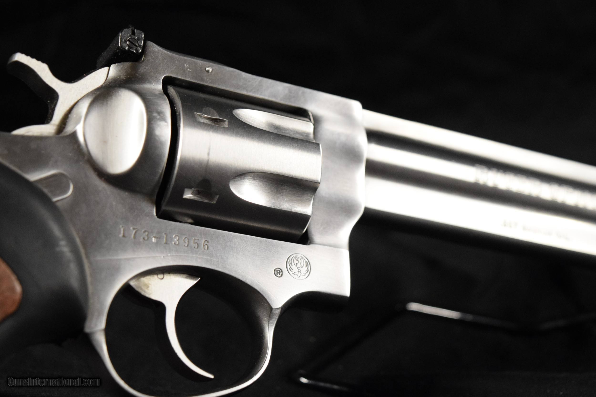 Description: The Triple-locking cylinder is locked into the frame at the front, rear, and bottom for more positive alignment and dependable operation shot after shot. Grip frame design easily accommodates a wide variety of custom grips. Disassembly of integrated subassemblies requires no special tools and allows for easy maintenance and assembly. The transfer bar mechanism provides an unparalleled measure of security against accidental discharge. This package DOES NOT come with a case. The overall condition is great with wear on the grips and scratches on the frame. Pre-Owned - Ruger GP100 SA/DA .357 Mag. 6" Revolver