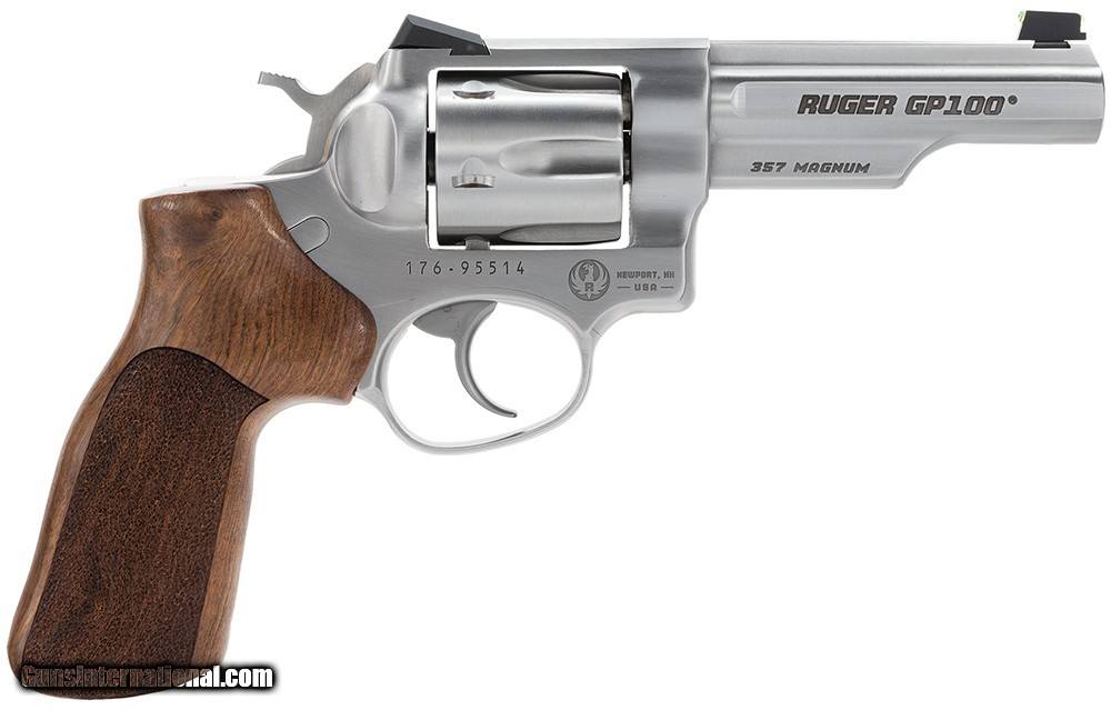 Description: Ruger 1754 GP100 Match Champion Medium Frame 357 Mag 6rd 4.20" Satin Stainless Steel Half-Lug Barrel, Cylinder & Frame, Hogue Stippled Hardwood Grip, Transfer Bar Safety, Exposed Hammer ON ITS BEST PRICE! BUY NOW!! Ruger's GP100 revolver features a triple-locking cylinder that is locked into the frame at the front, rear and bottom for more positive alignment and dependable operation. Its patented transfer bar mechanism provides an unparalleled measure of security, while the integrated sub-assemblies allows for easy maintenance and assembly. The grip frame design easily accommodates a wide variety of custom grips. The Match champion model features a contoured cylinder, Hogue hardwood grip with stippled sides and a slab-sided, half-lug target crowned barrel.